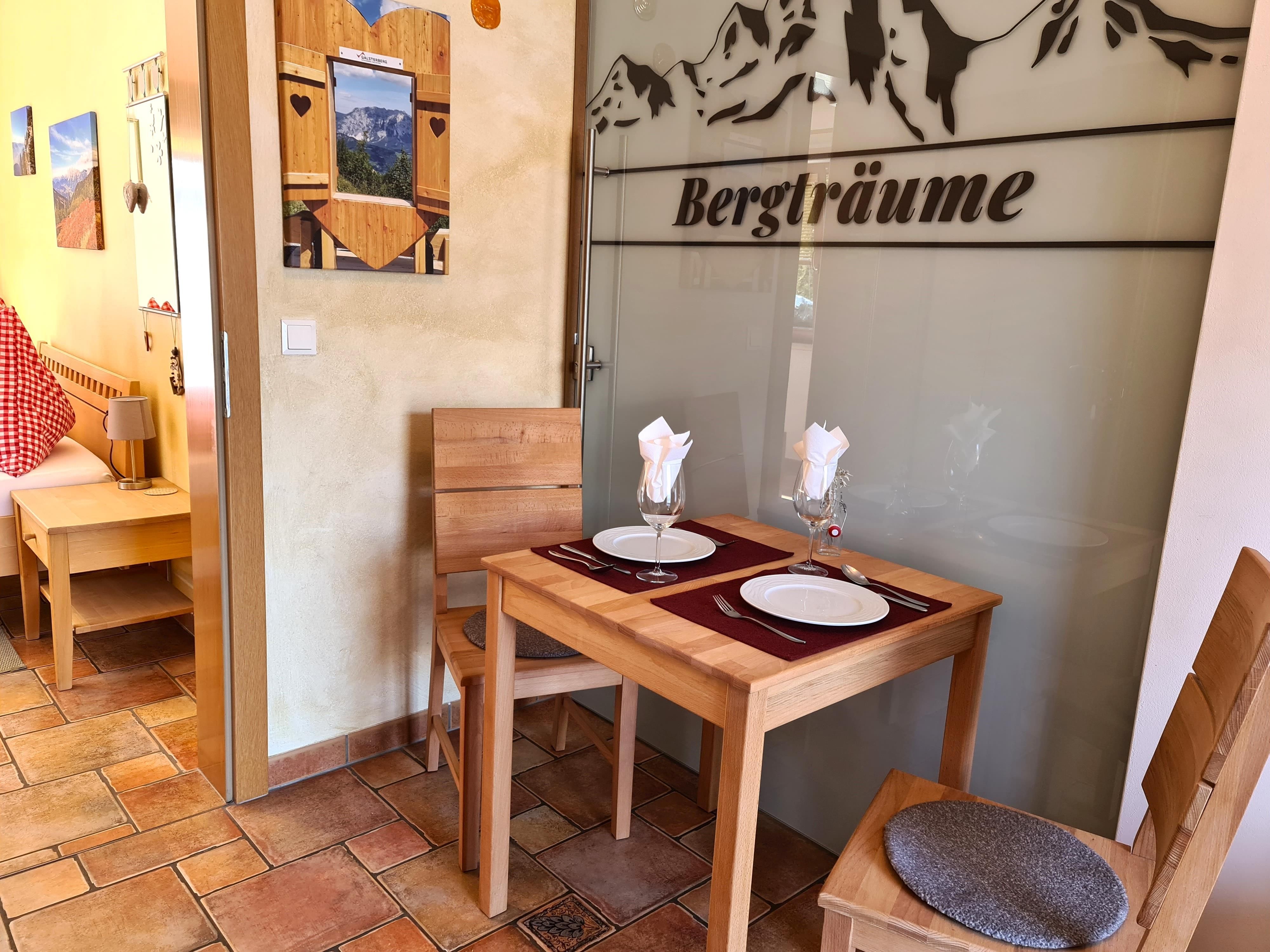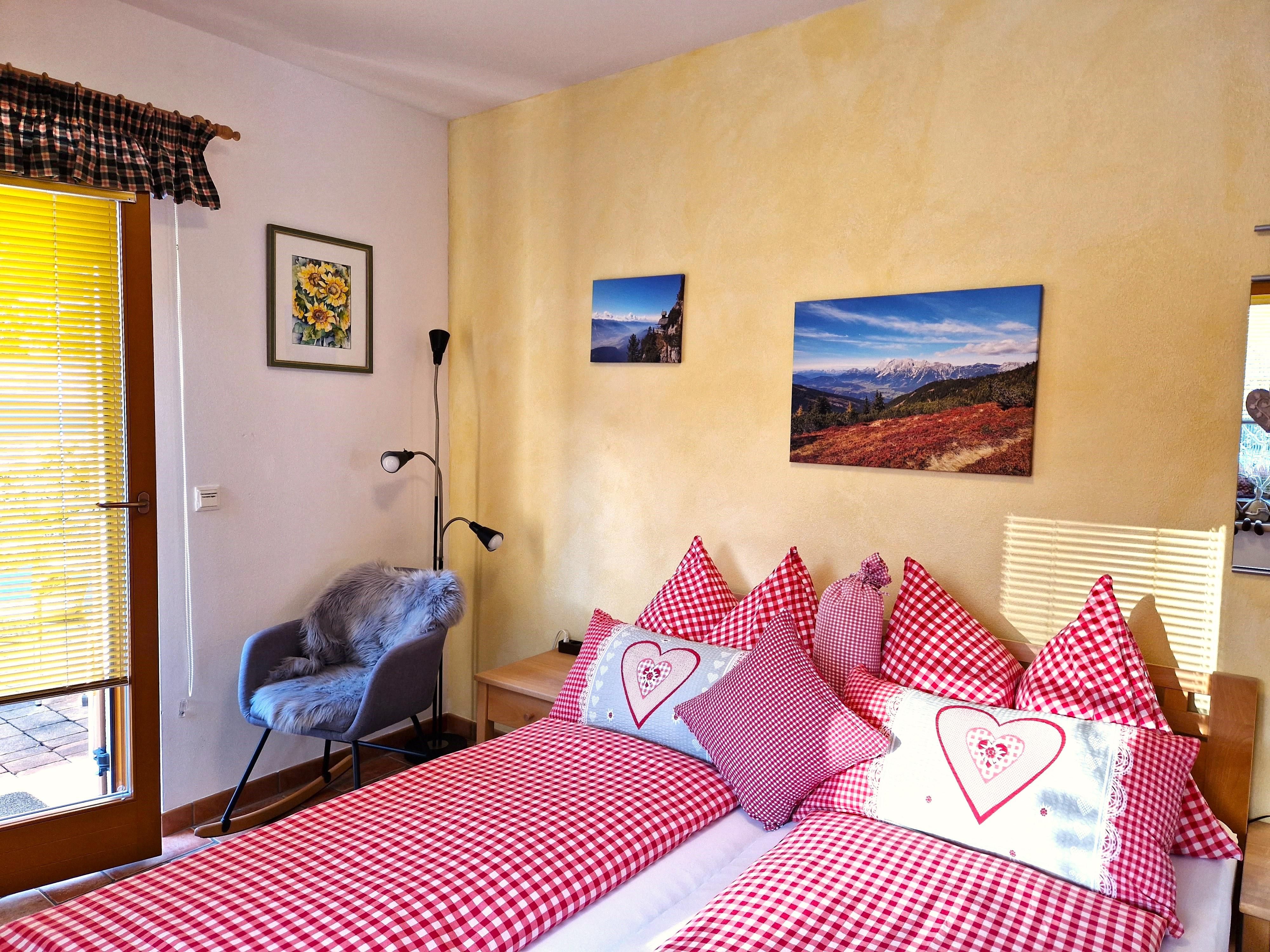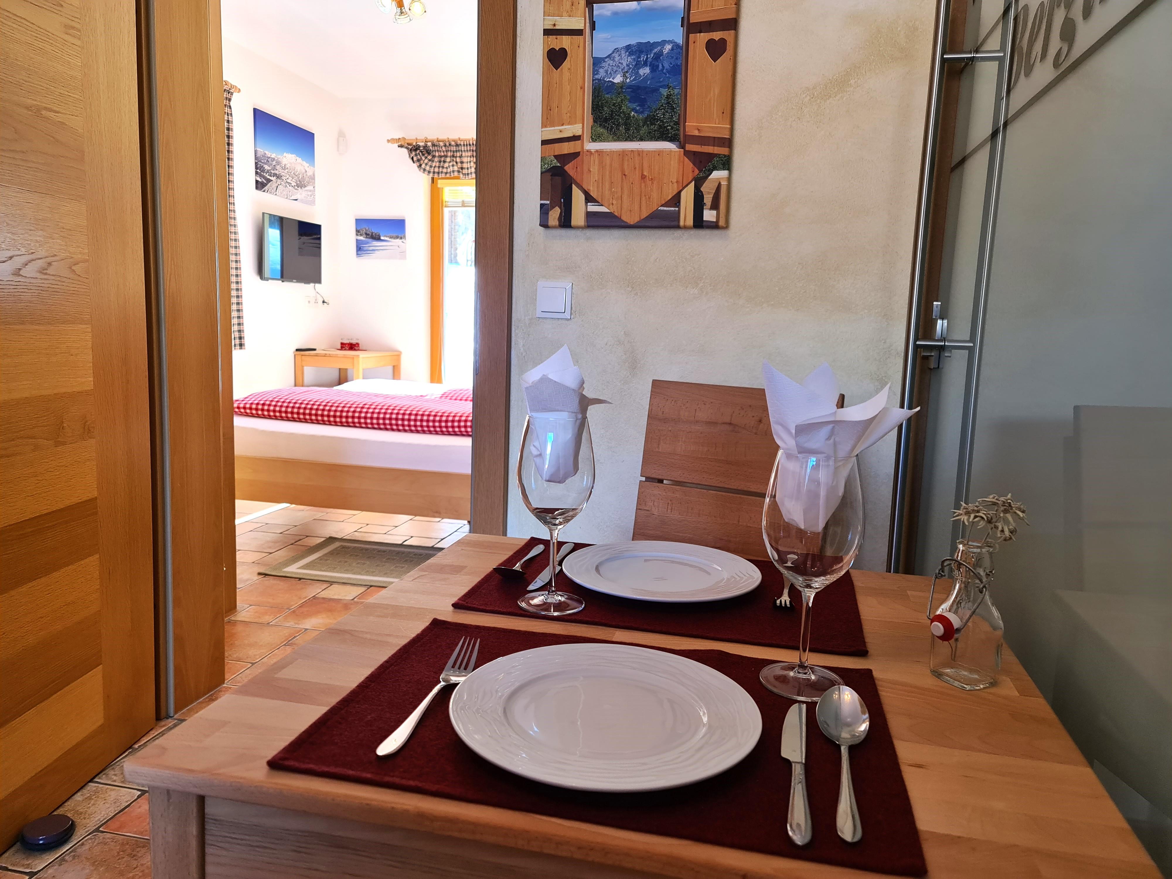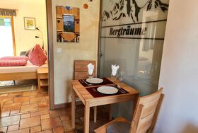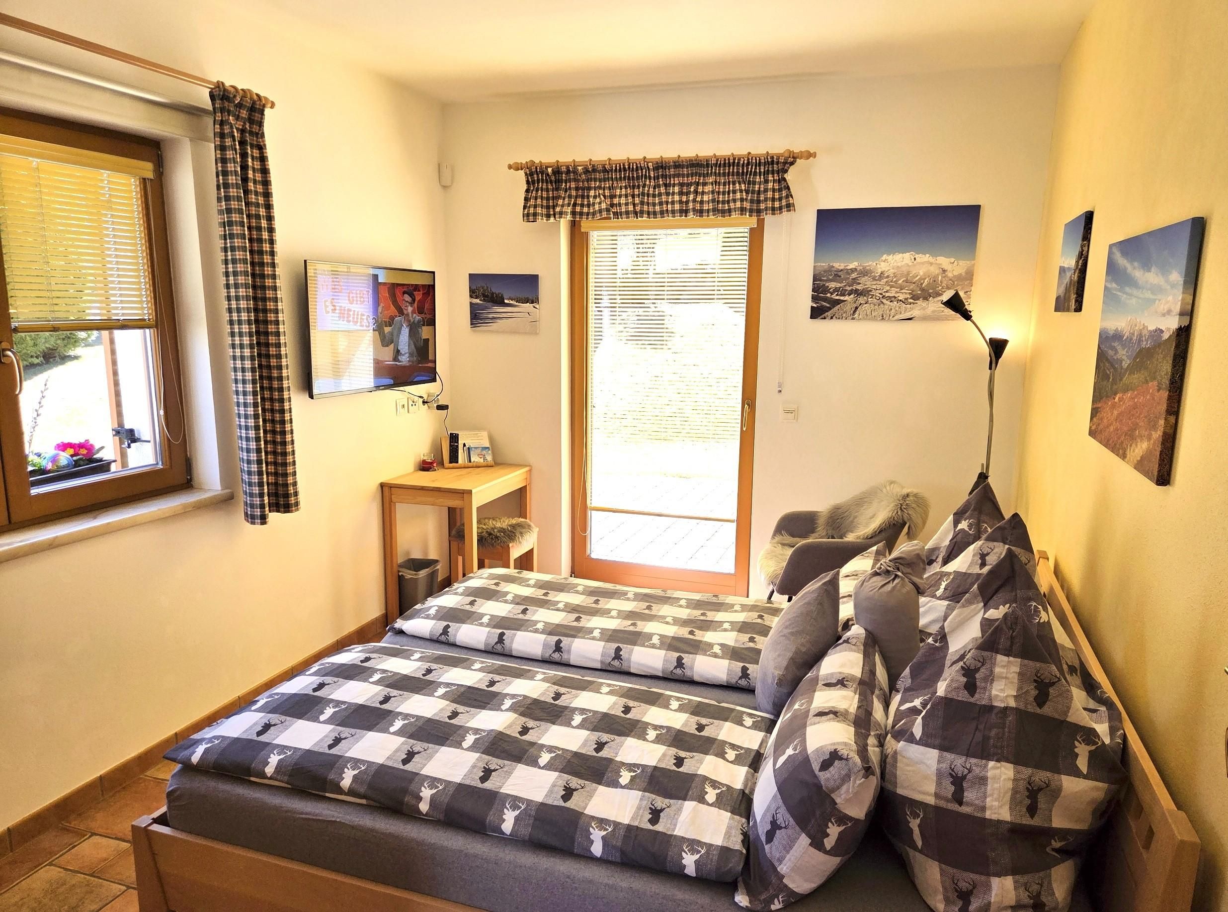 Das romantische Appartement BERGTRÄUME bietet Ihnen 1 Schlafzimmer mit Doppelbett, Kleiderschrank, kleiner Tisch mit Hocker, Fernseher und einen Zugang auf die Terrasse.