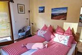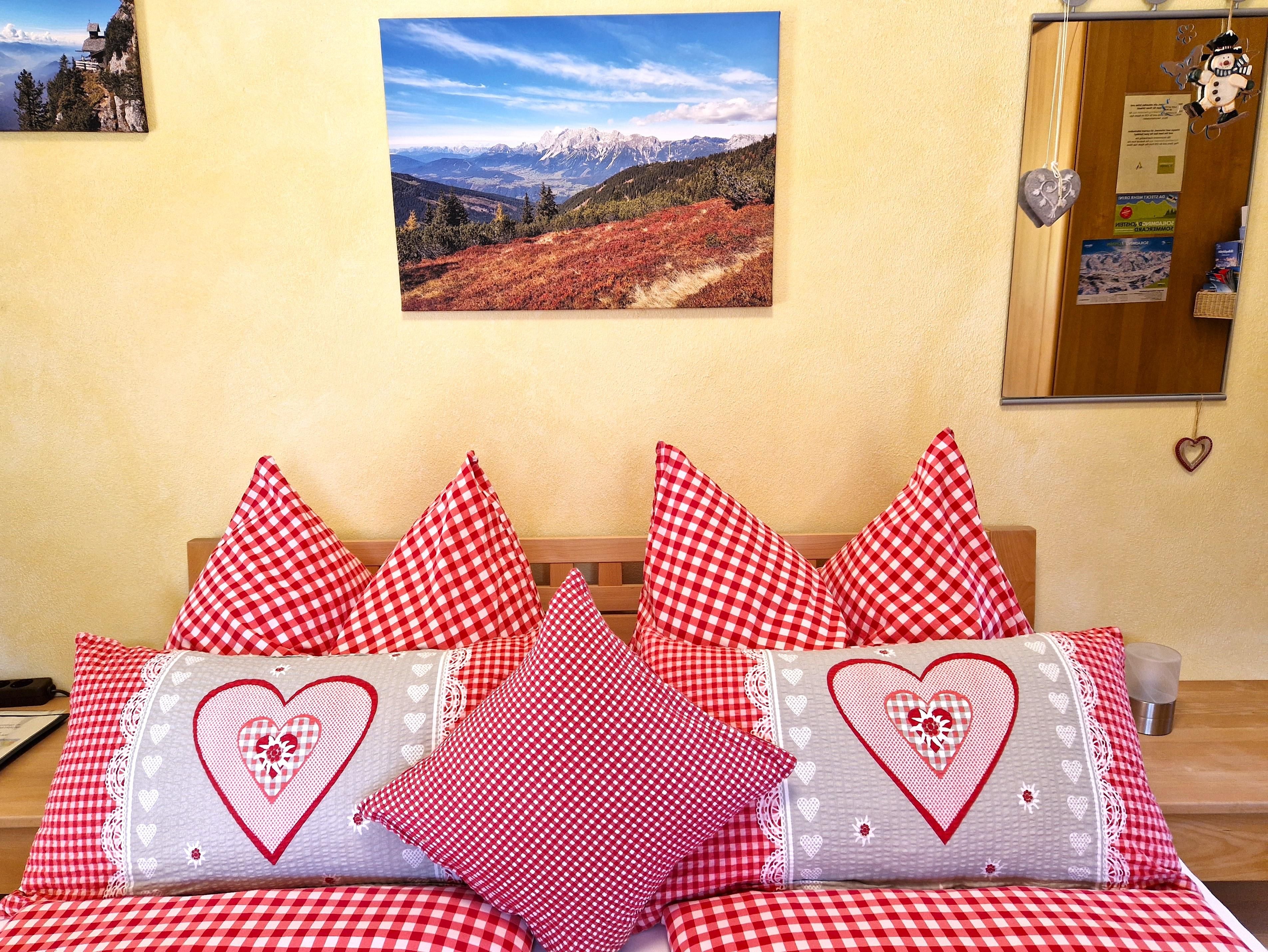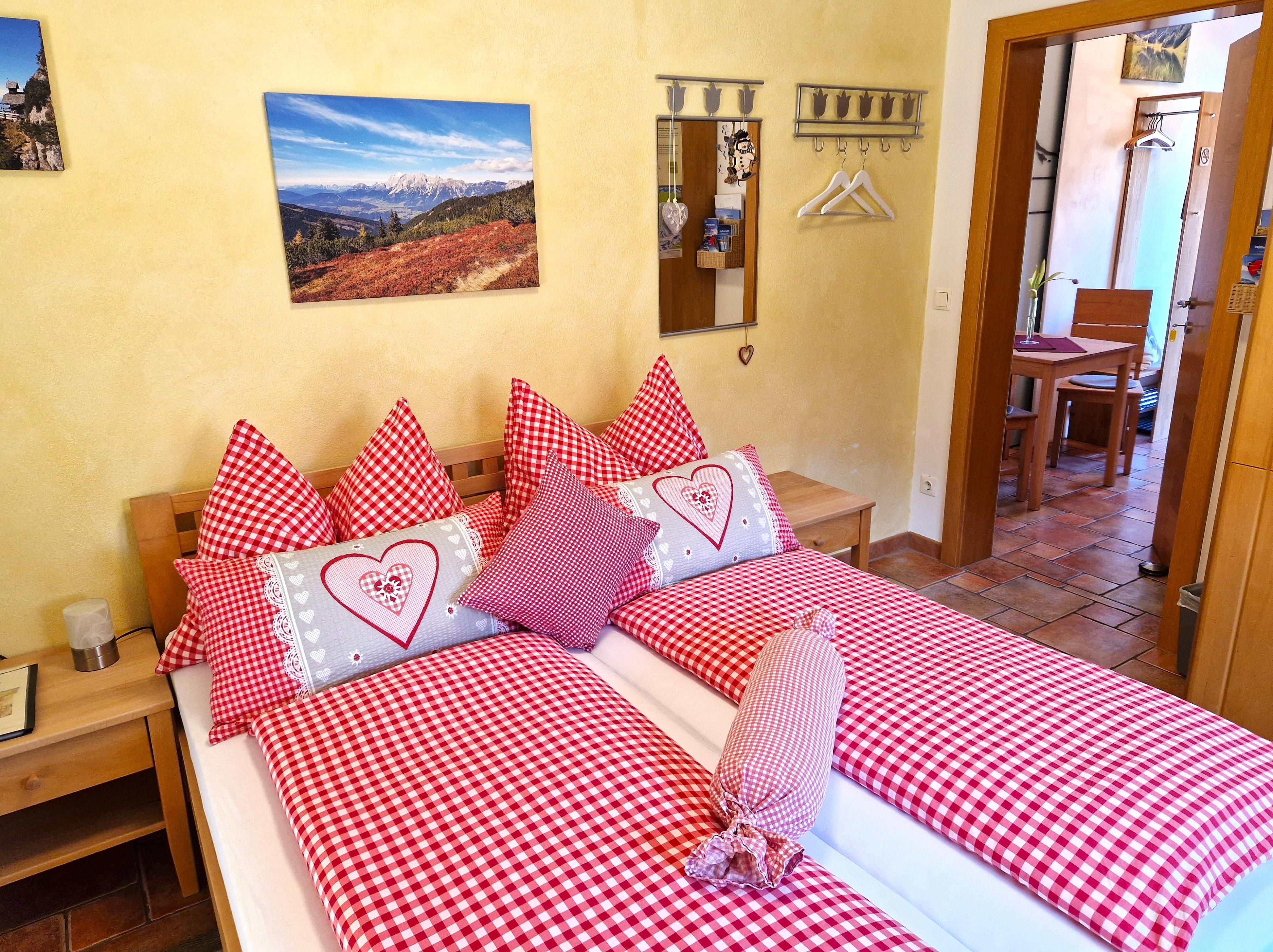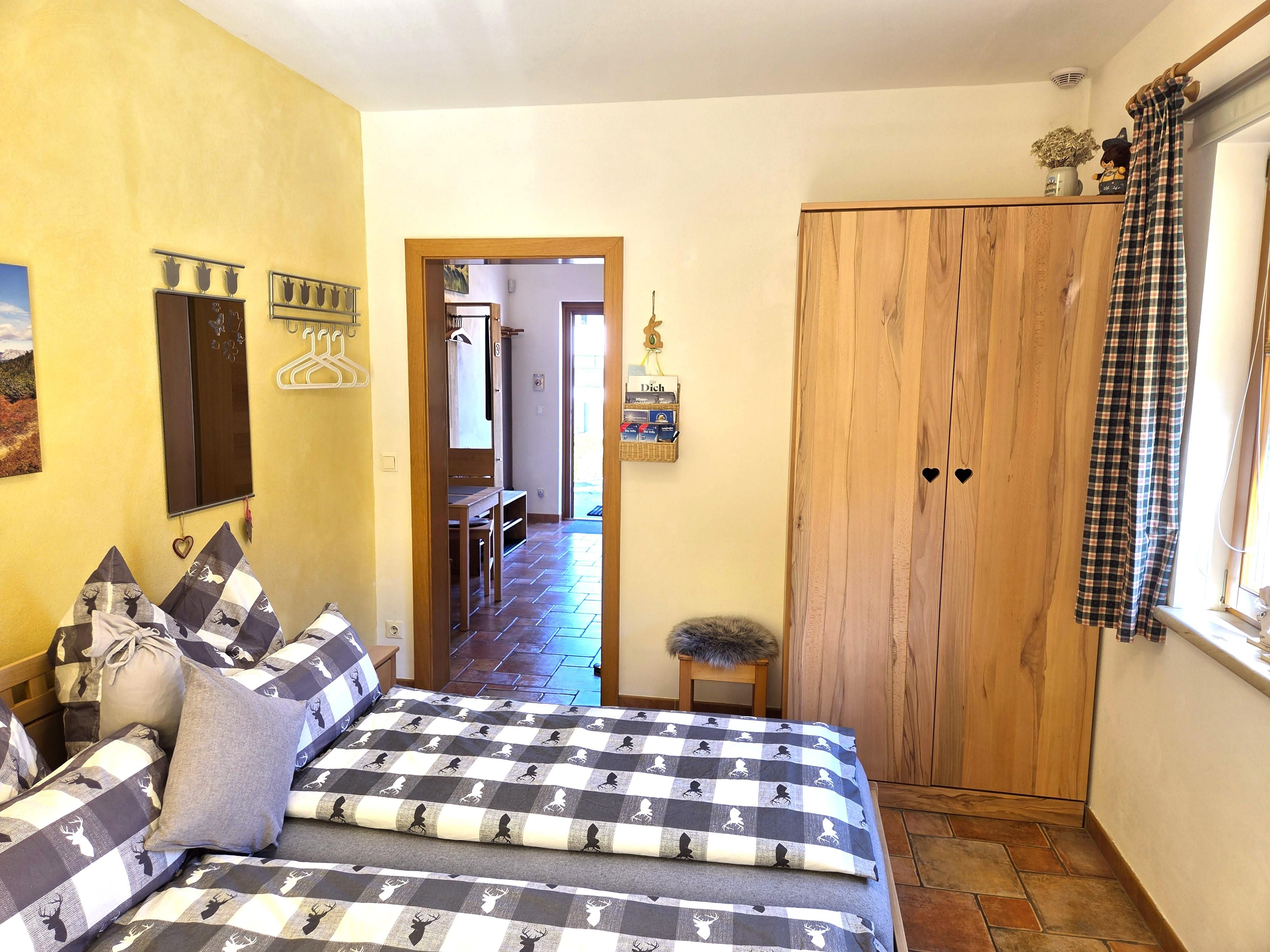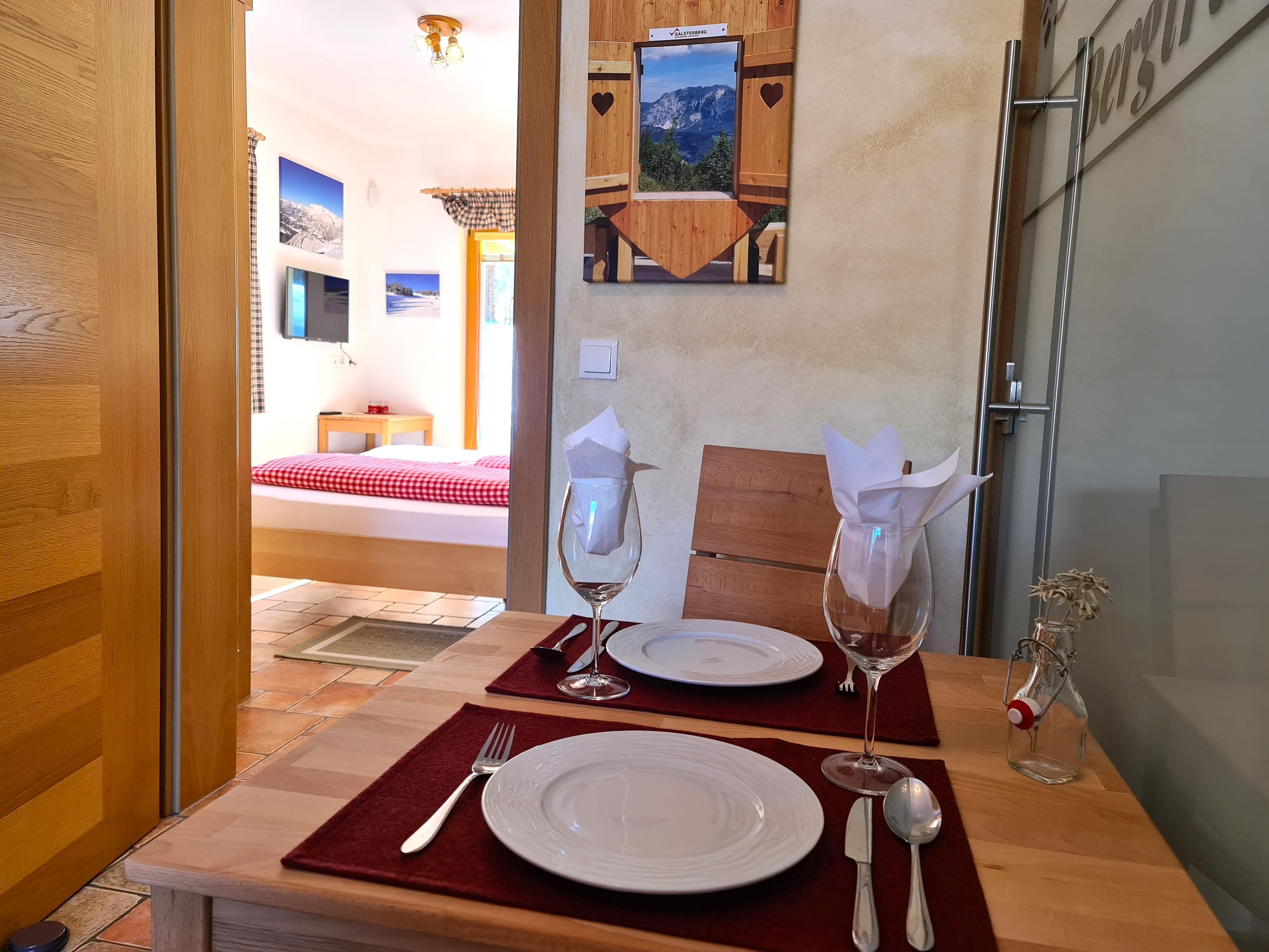 Das romantische Appartement BERGTRÄUME bietet Ihnen 1 Schlafzimmer mit Doppelbett, Kleiderschrank, kleiner Tisch mit Hocker, Fernseher und einen Zugang auf die Terrasse.