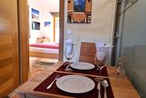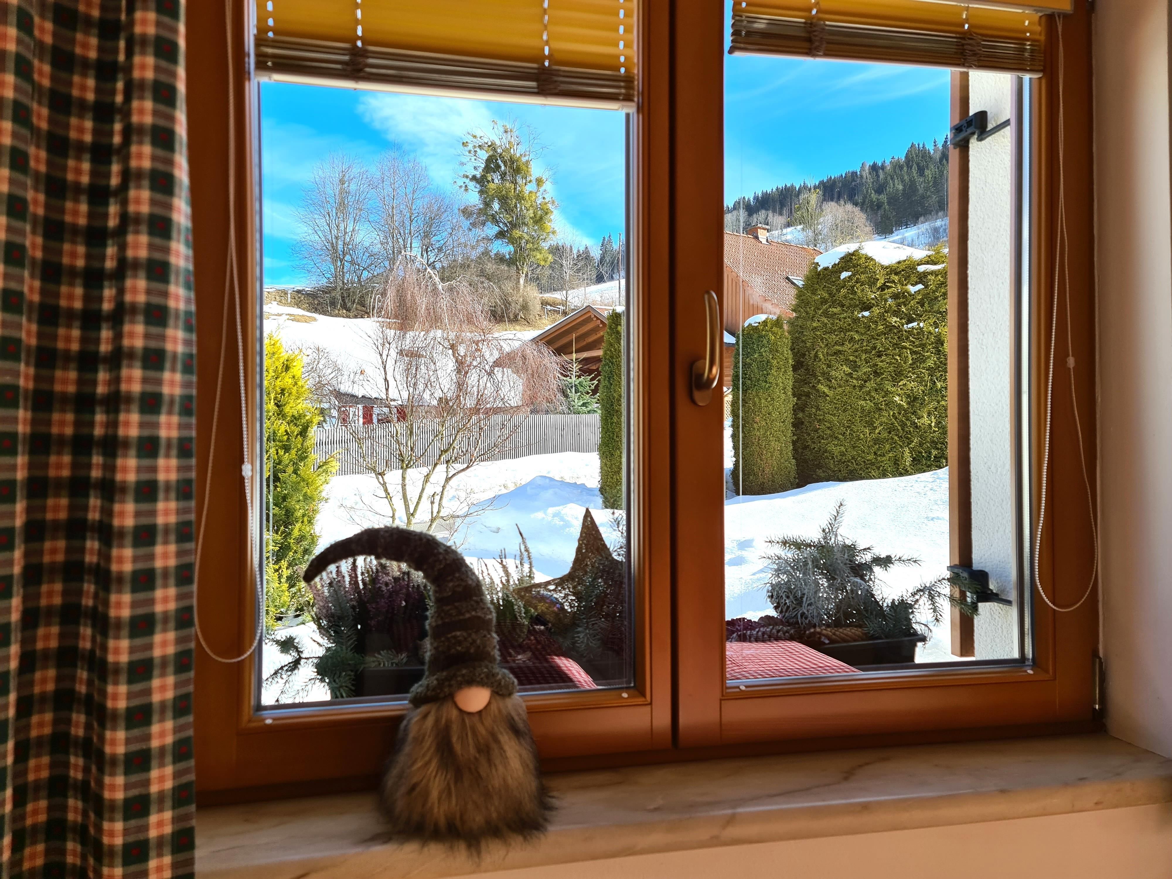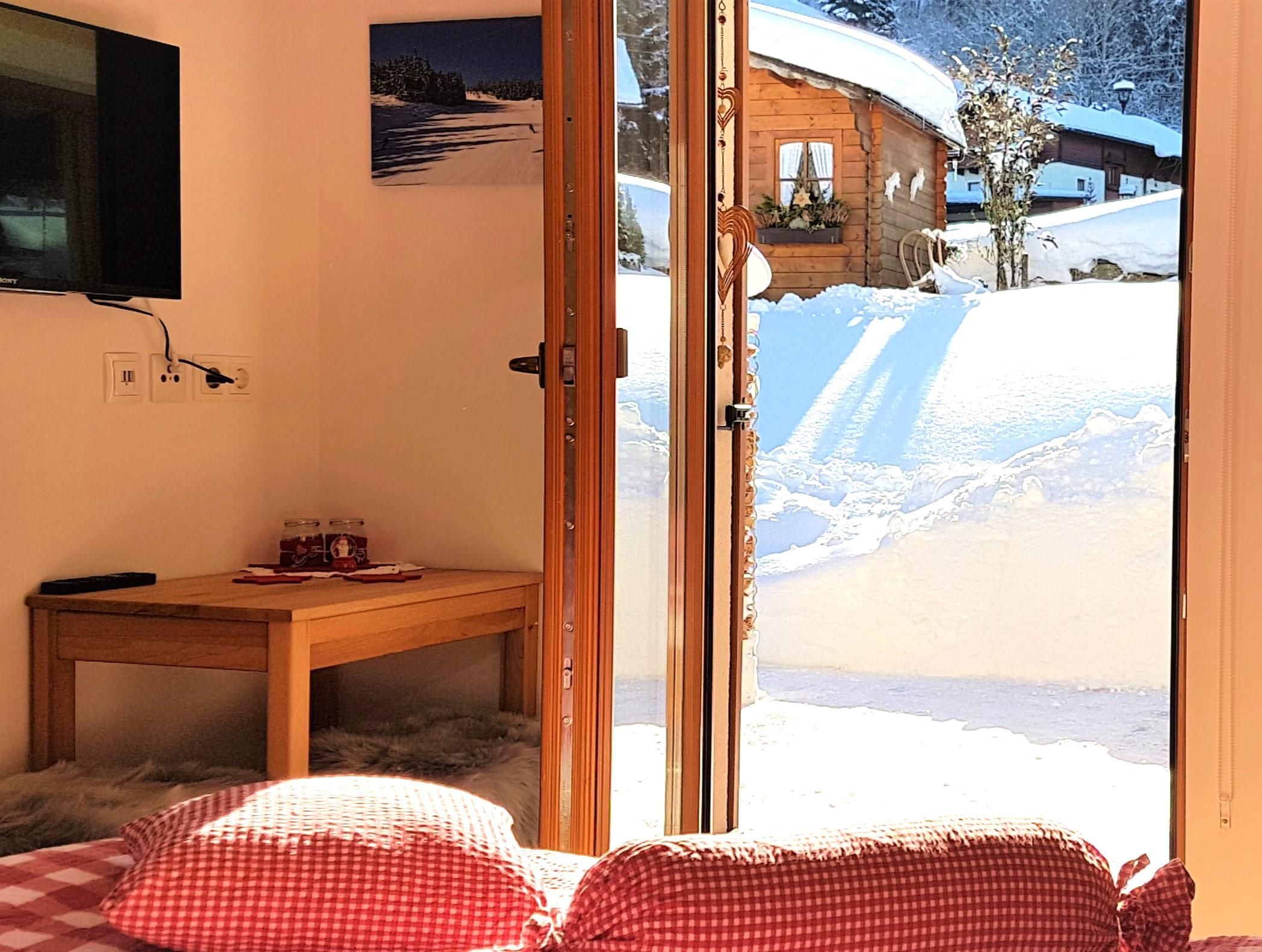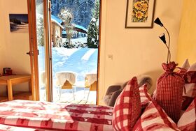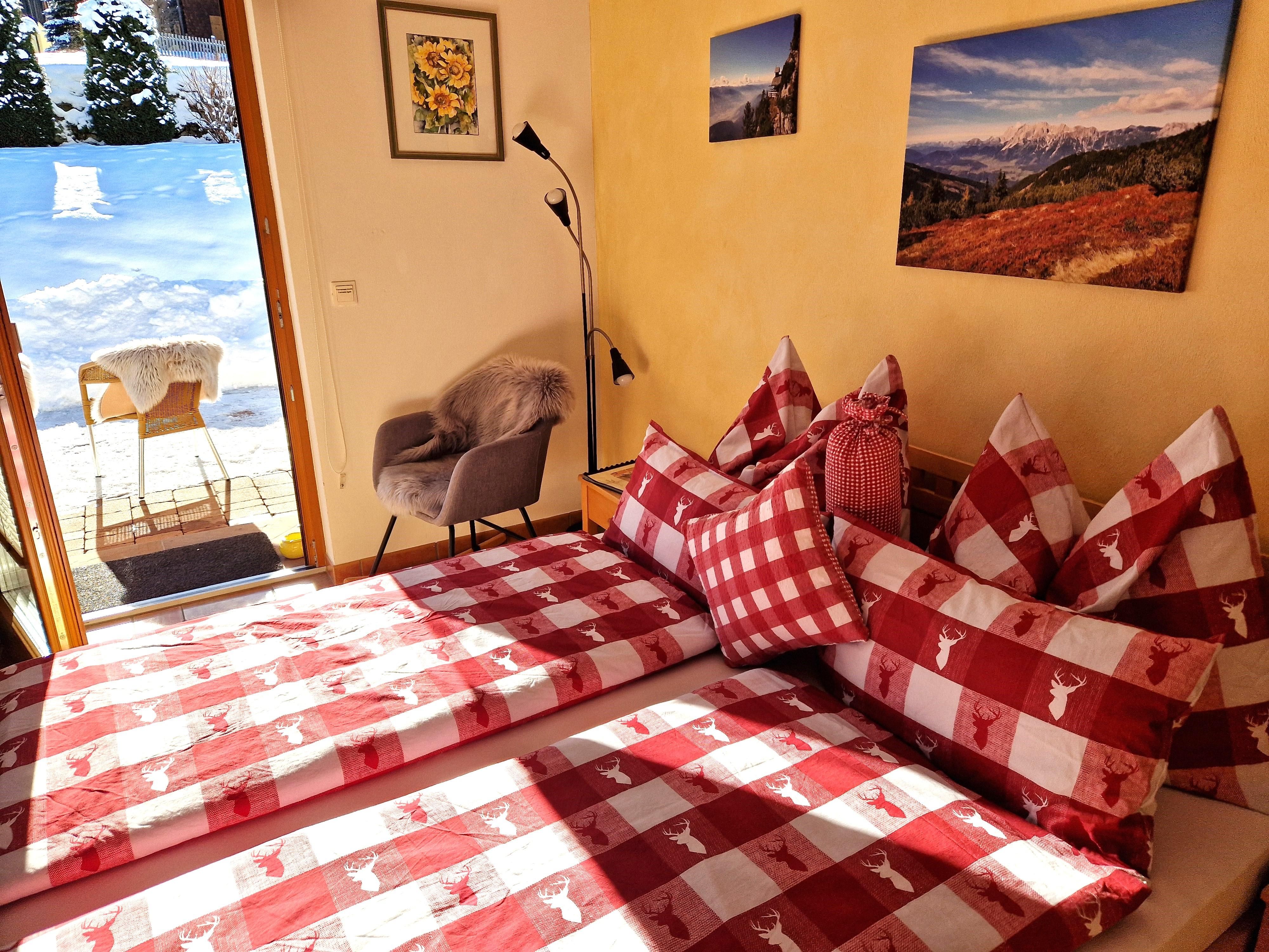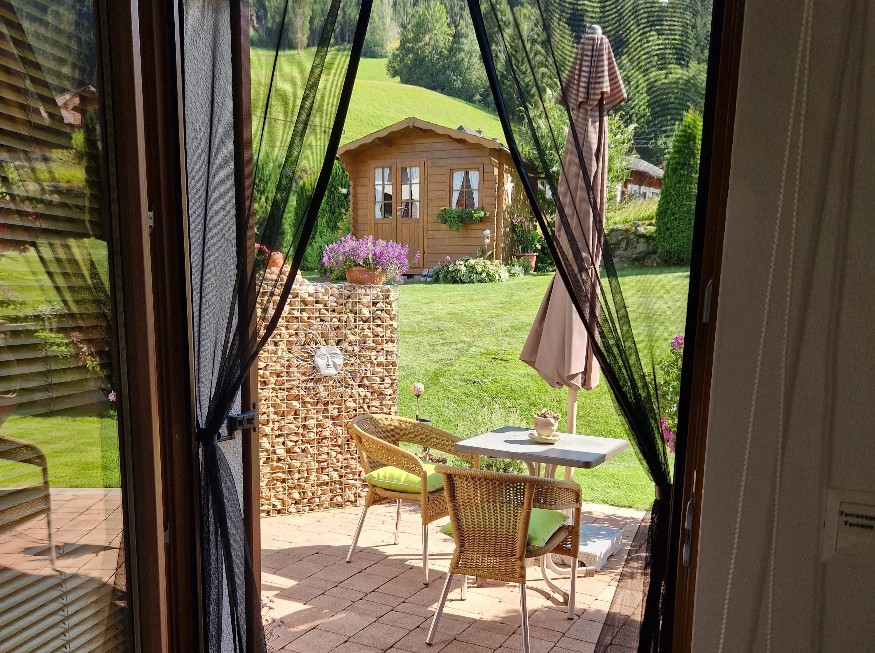 Das Schlafzimmer hat ein großes Fenster und eine Türe auf die Terrasse mit Tisch und Stühle, wo Sie vor allem in den Sommermonaten gemütlich verweilen und die Natur genießen können.