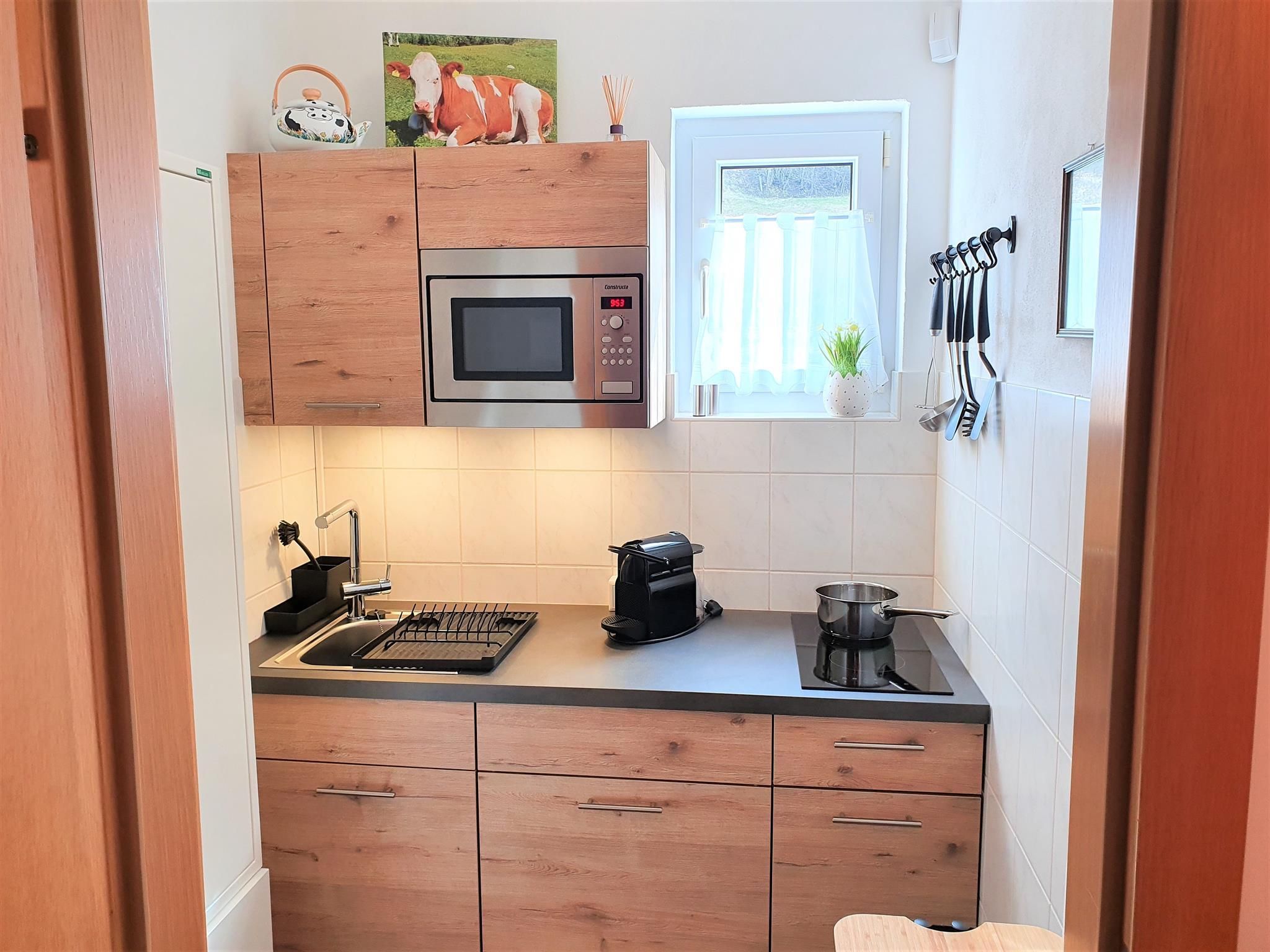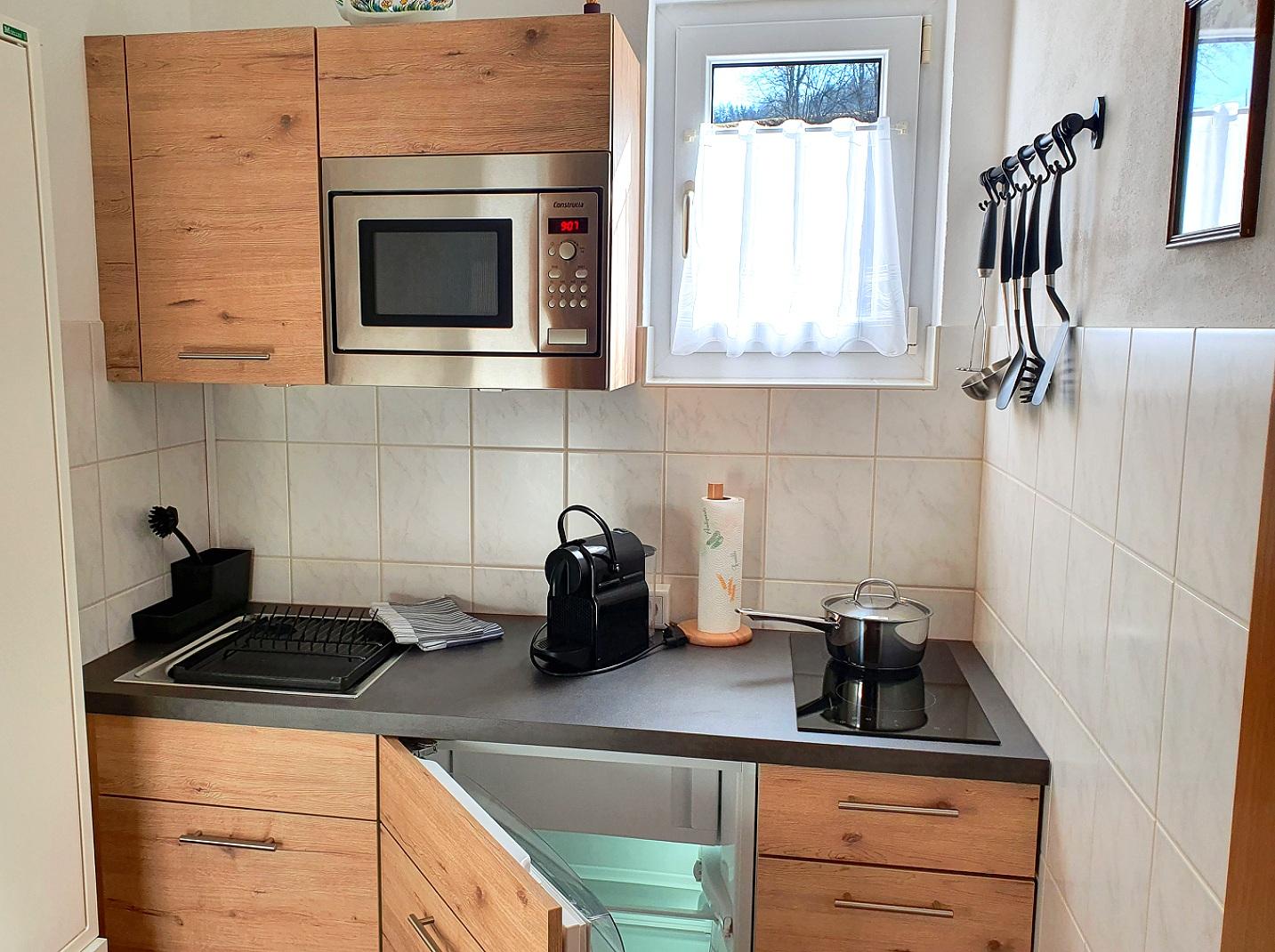 Die gut ausgestattete Küchenzeile befindet sich ebenfalls in einem separaten Raum mit Tür und Fenster.