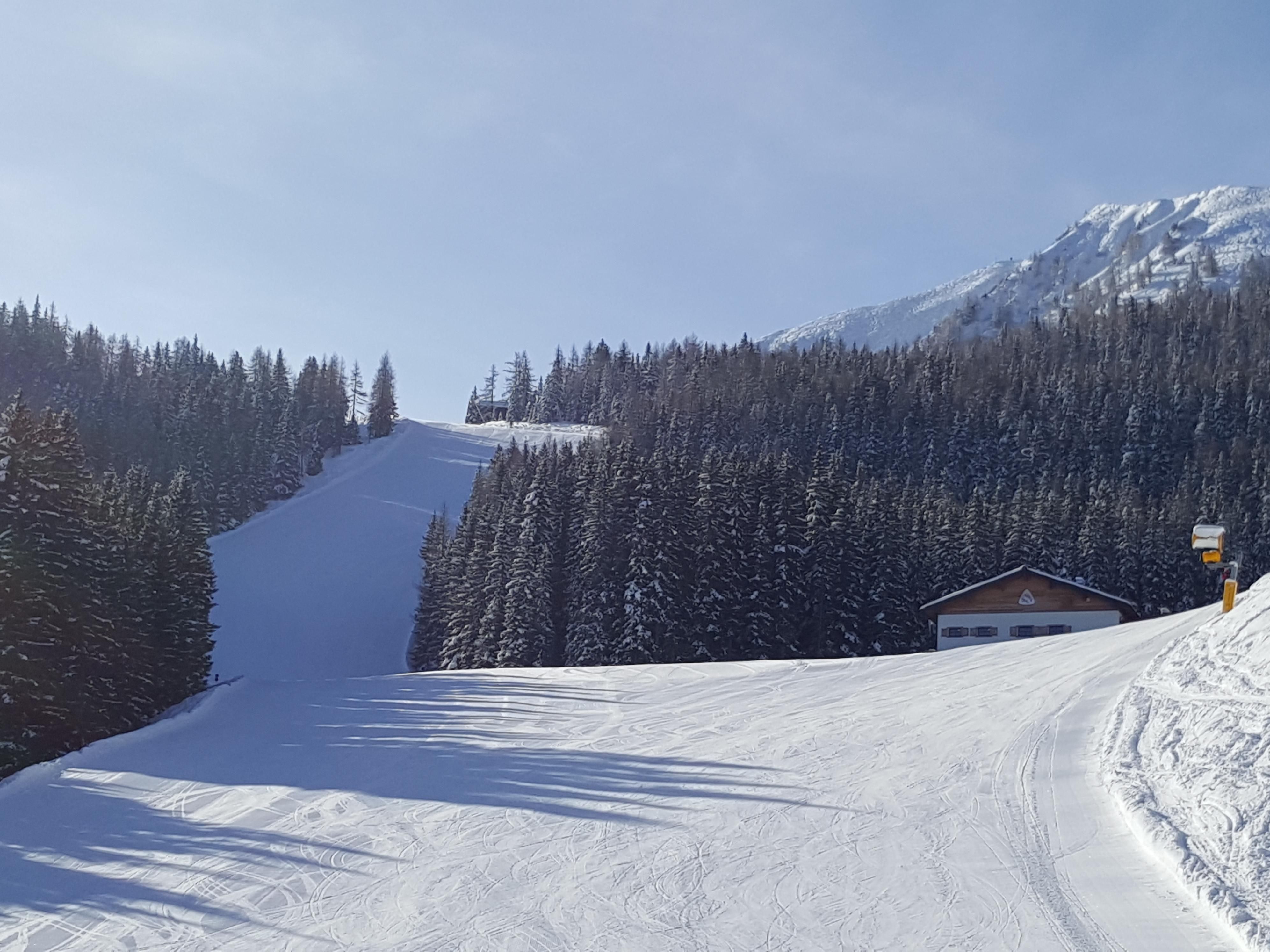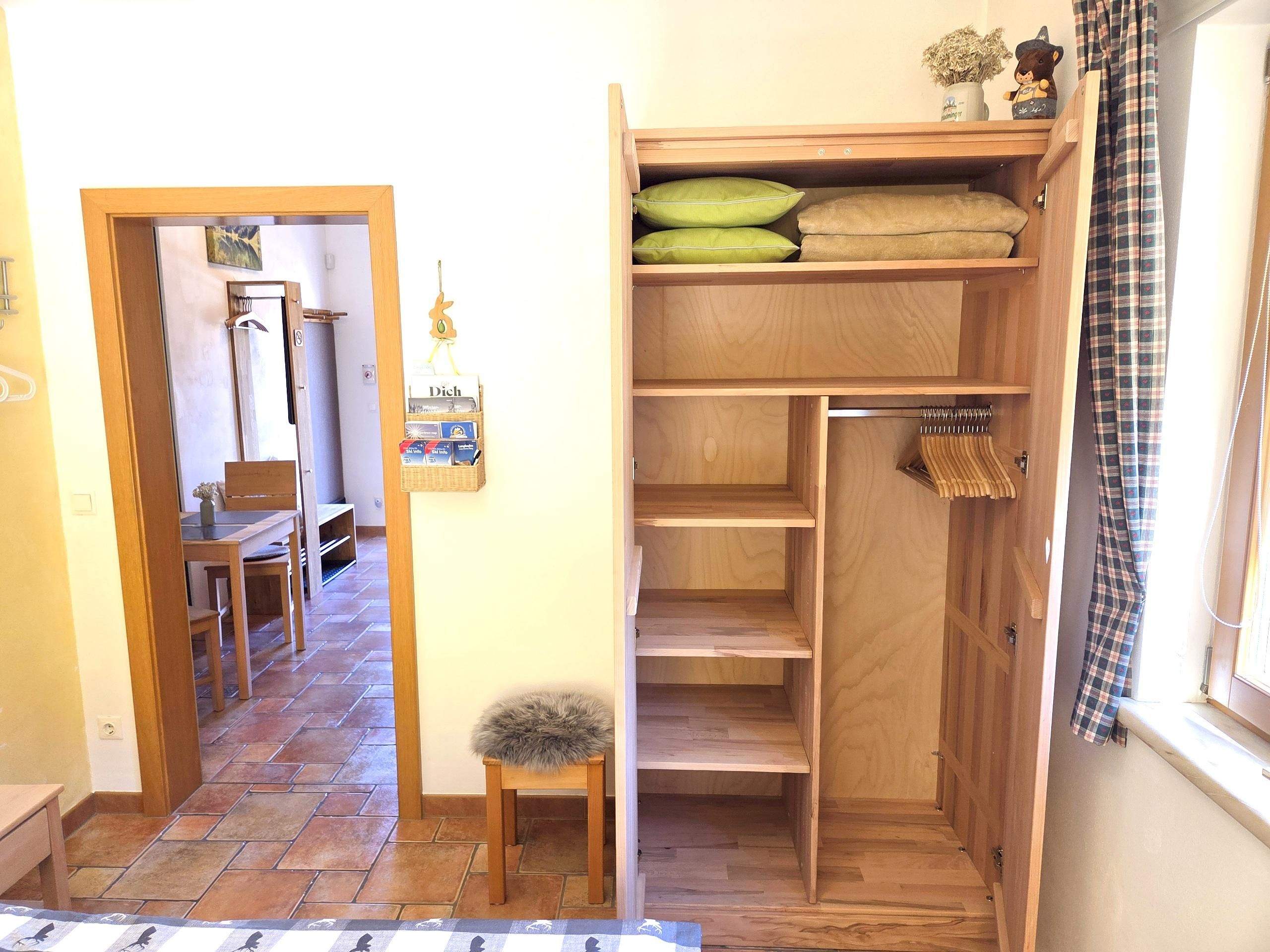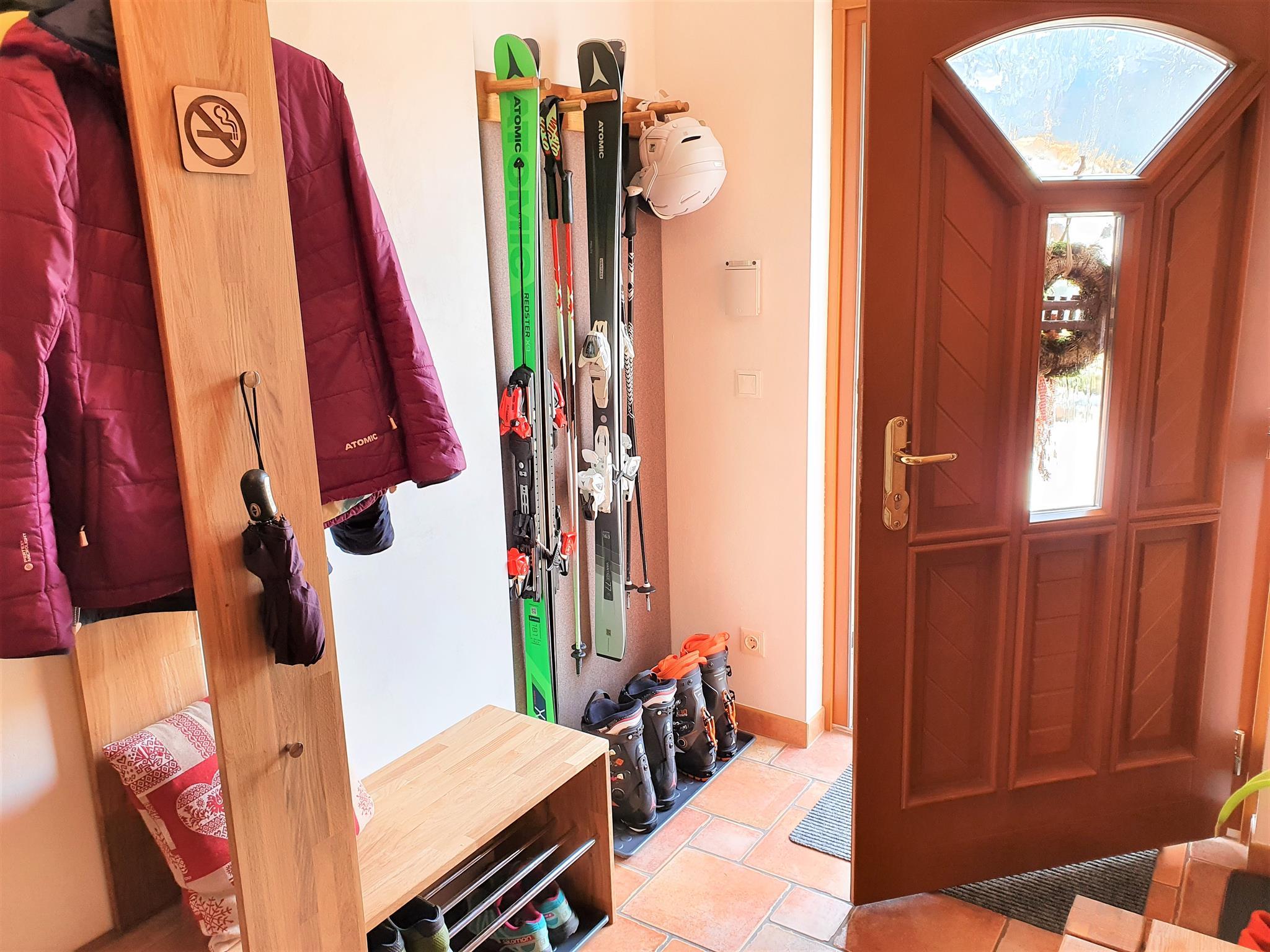Im Vorraum bietet die Garderobe einen Stellplatz für Ski und Schuhe. Ein kleiner Tisch mit 2 Stühlen lädt zum Essen ein.