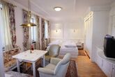 Doppelzimmer (30qm) mit WC, Dusche, Telefon, Safe, Minibar, Flachbild-Fernseher. Die Lattenroste bei dem Doppelbett sind beidseitig verstellbar und Fußteil offen.