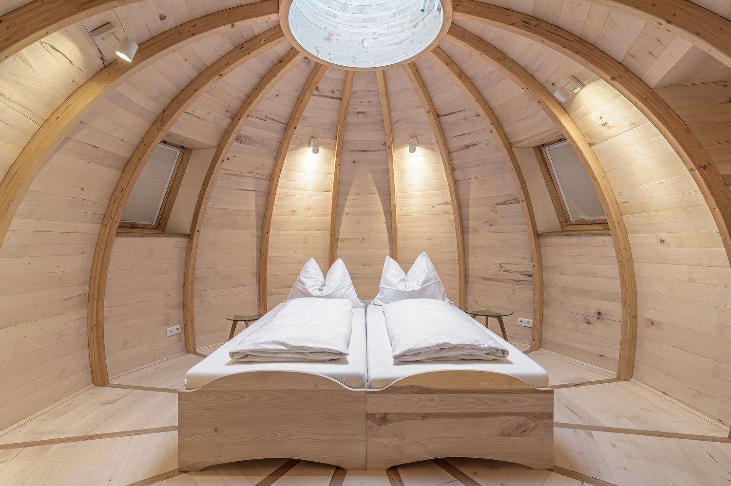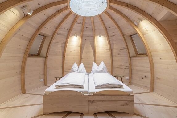 Vom Doppelbett aus in den Sternenhimmel schauen, erfrischt und ausgeruht aufwachen – geniesse eines unserer außergewöhnlichsten Appartements! Hier findest Du ein Badezimmer mit Dusche und WC sowie eine Küchenzeile vor. Der Healing Dome ist wie sein großer Bruder ein architektonisches und energetisches Herzstück in der baum. Schon beim Aufbau und Verlegen der Leitungen wurde darauf geachtet, dass sich hier positive, nährende Energie ungestört entfalten kann. Ausgewählte Hölzer machen den 15 m² großen kuppelförmigen Hauptraum zu einer heilenden Oase. Darum bieten wir den Dom sowohl als Apartment als auch als Seminarraum an.