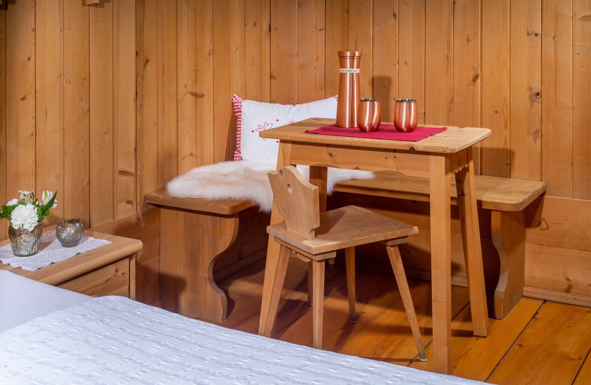 Knarrendes Holz. Natürliche, ausgewählte Materialien aus der Region. Der intensive Duft von Zirbe.