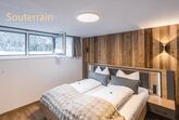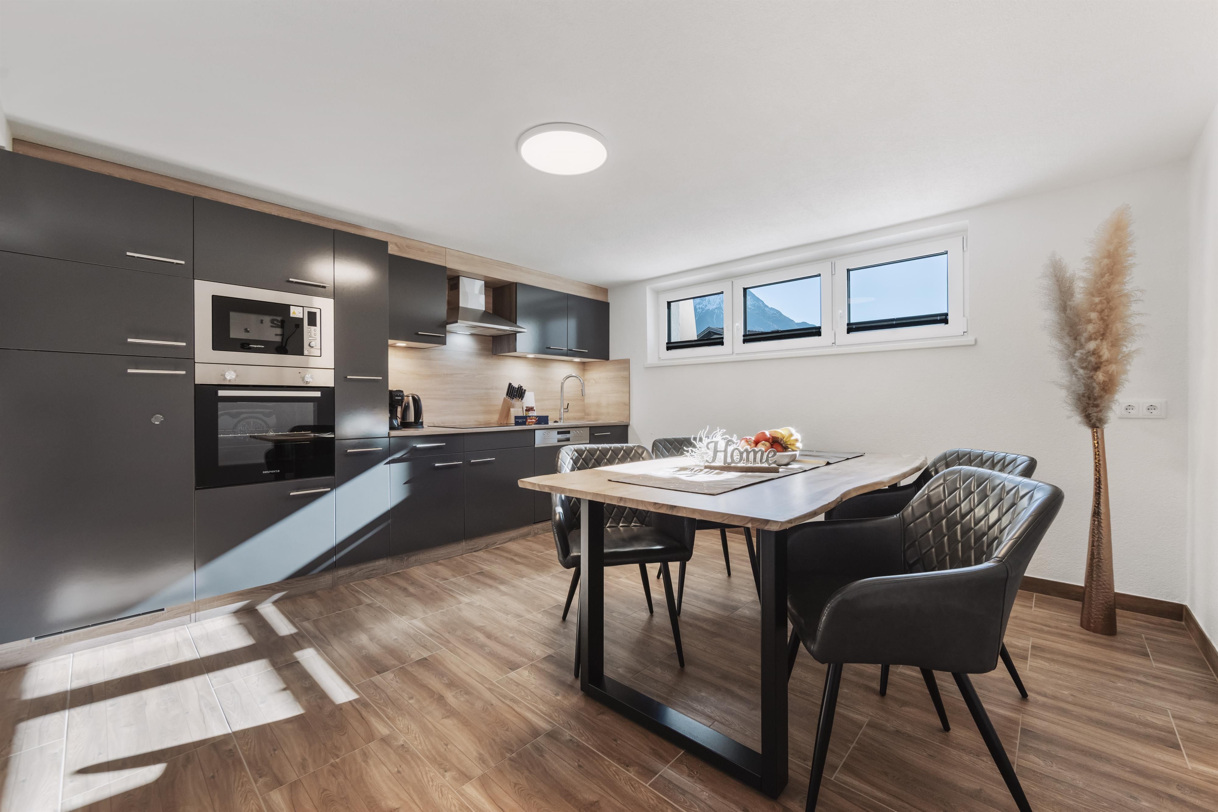 Das moderne Top 1 im Souterrain (ca. 45 m²) besteht aus zwei Doppelzimmern, jeweils mit eigenem Badezimmer (Dusche/WC und Haarfön), sowie einer voll ausgestatteten Wohnküche (Cerankochfeld, Backrohr, Kühlschrank mit Gefrierfach, Mikrowelle, Geschirrspüler, Kapsel-Kaffeemaschine, Toaster, Wasserkocher u. v. m.). Das einzigartige Bergpanorama kann im möblierten Gemeinschaftsgarten genossen werden.