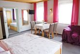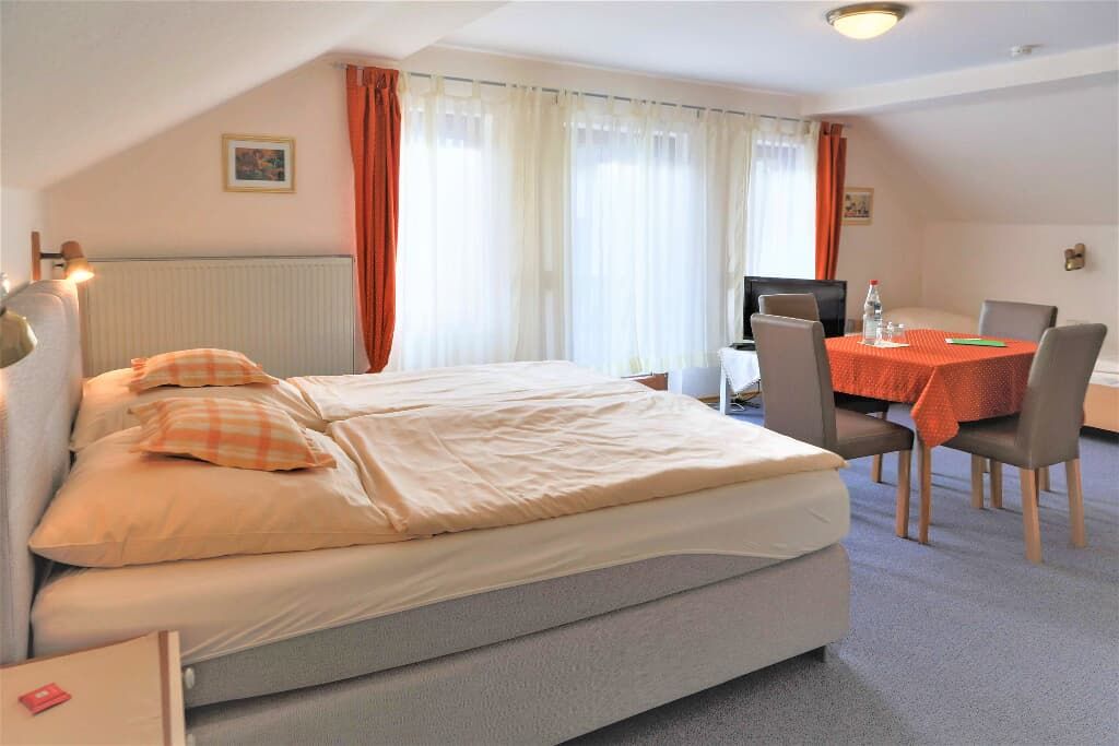 Unser Familienzimmer besteht aus zwei geräumigen Doppelzimmern mit Durchgangstür. Vor allem für Familien mit Kindern optimal geeignet. Ein Babybett stellen wir Ihnen auf Anfrage gerne kostenfrei zur Verfügung. Außerdem steht Ihnen ein großer Balkon mit Sitzgelegenheit zur Verfügung. Hier haben Sie eine herrliche Aussicht auf unseren Garten mit Pool. WLAN kostenfrei.