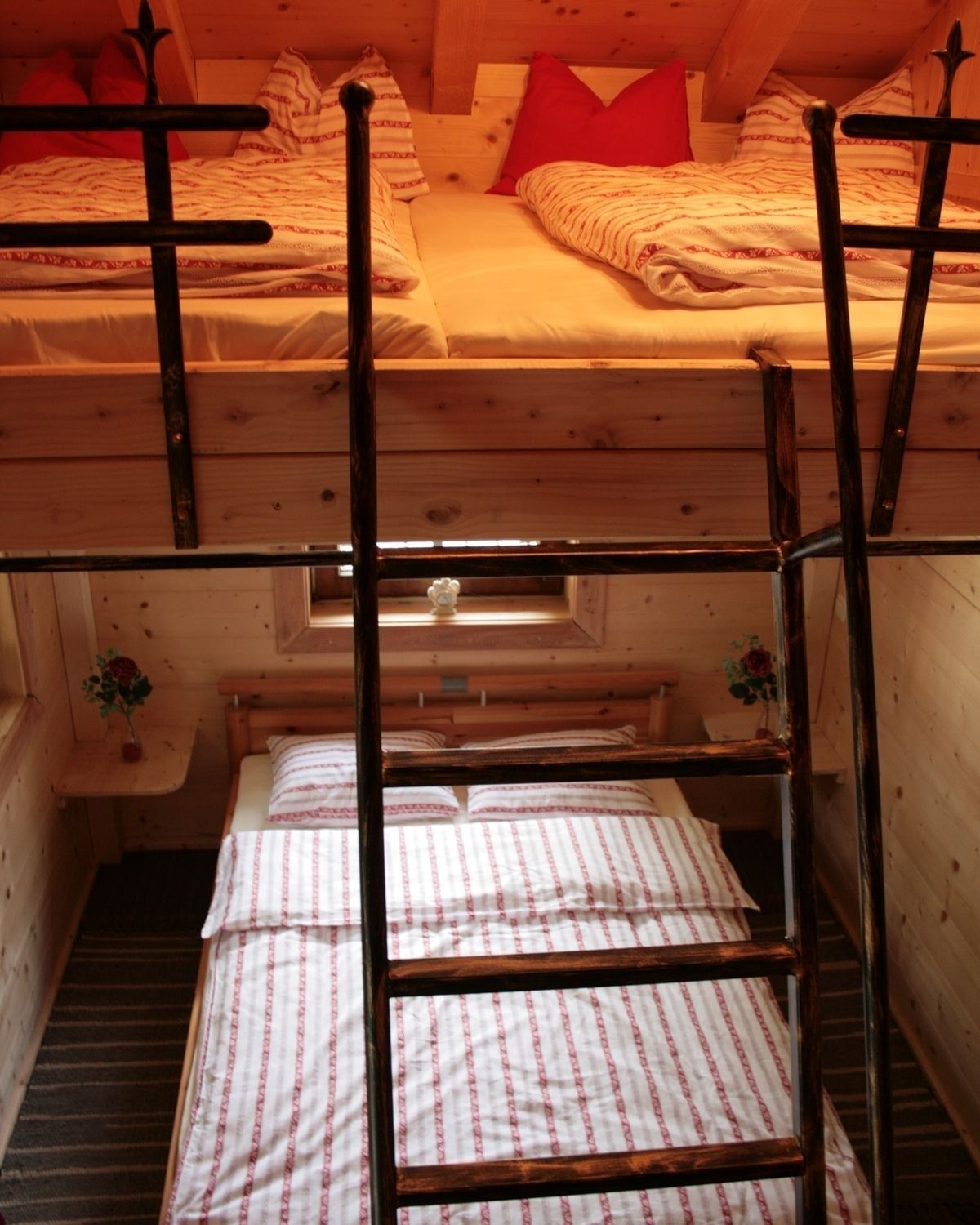 darüber ein Hochbett unter dem Dachgiebel, erreichbar über eine Leiter – ein abenteuerlicher Schlafplatz für bis zu 4 Kinder