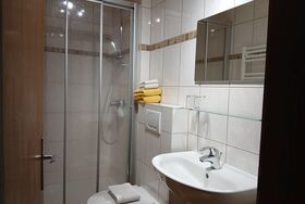 Schlafzimmer Die Schulbank 2 mit einem Doppelbett und einem Einzelbett im 1. Stock mit Fichtenholzmöbel, Parkett-Holzboden, Fliesenboden im Badezimmer, 3 Fenster, 1 Balkon-Fenstertür, Dusche/WC, Radio, Sat-TV, Balkon, WLAN, Bademäntel, Kosmetikprodukte