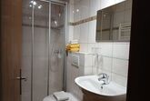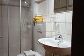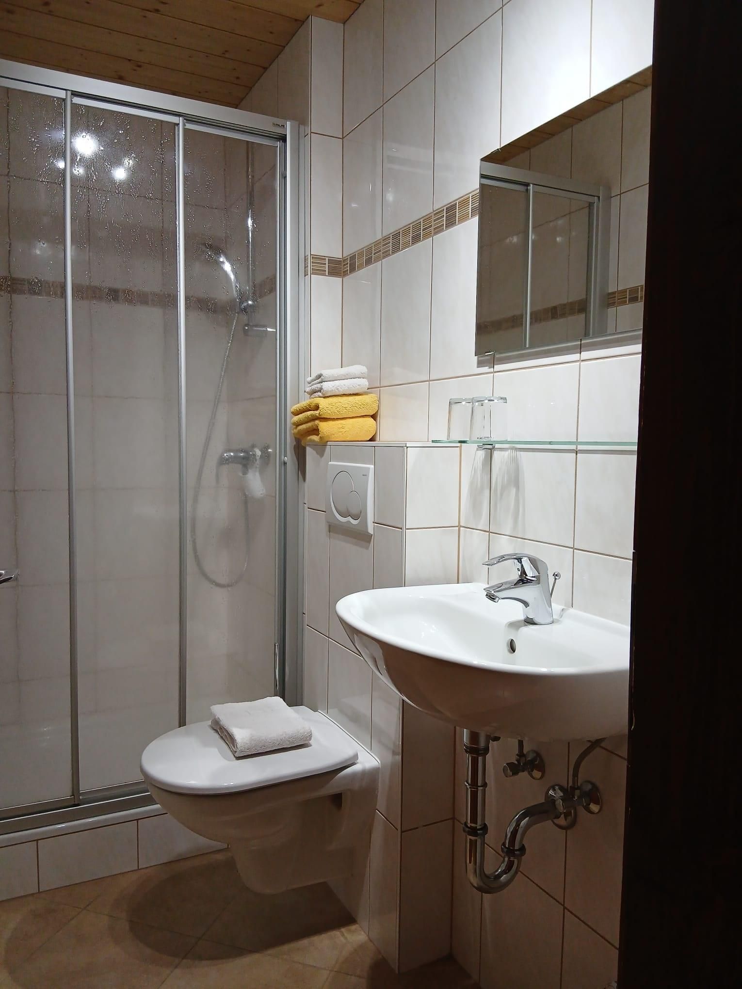 Schlafzimmer Die Schulbank 1 mit einem Doppelbett und einem Einzelbett im 1. Stock mit Sat-TV, Radio, Dusche/WC, Balkon, 1 Fenster, 1 Balkon-Fenstertür, Fichtenholzmöbel, Holz-Parkettboden, Fliesenboden im Badezimmer, WLAN, Bademäntel, Kosmetikprodukte