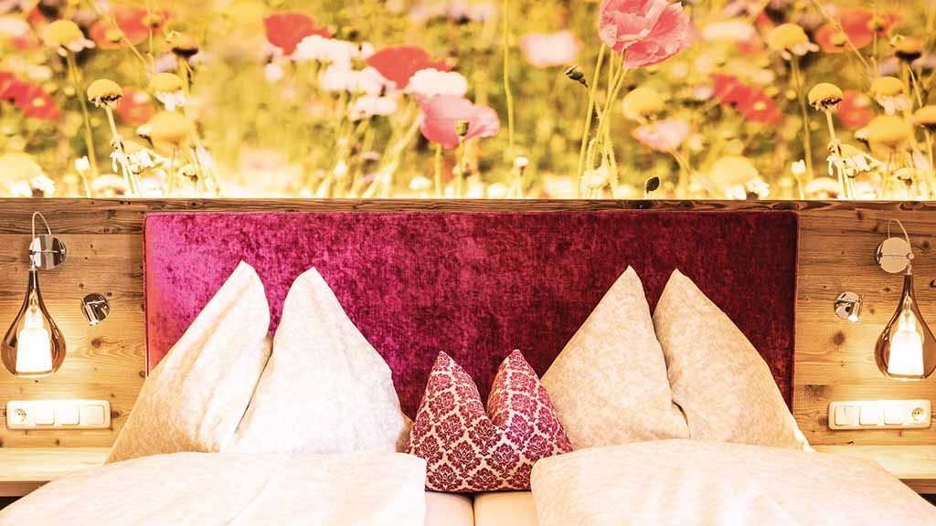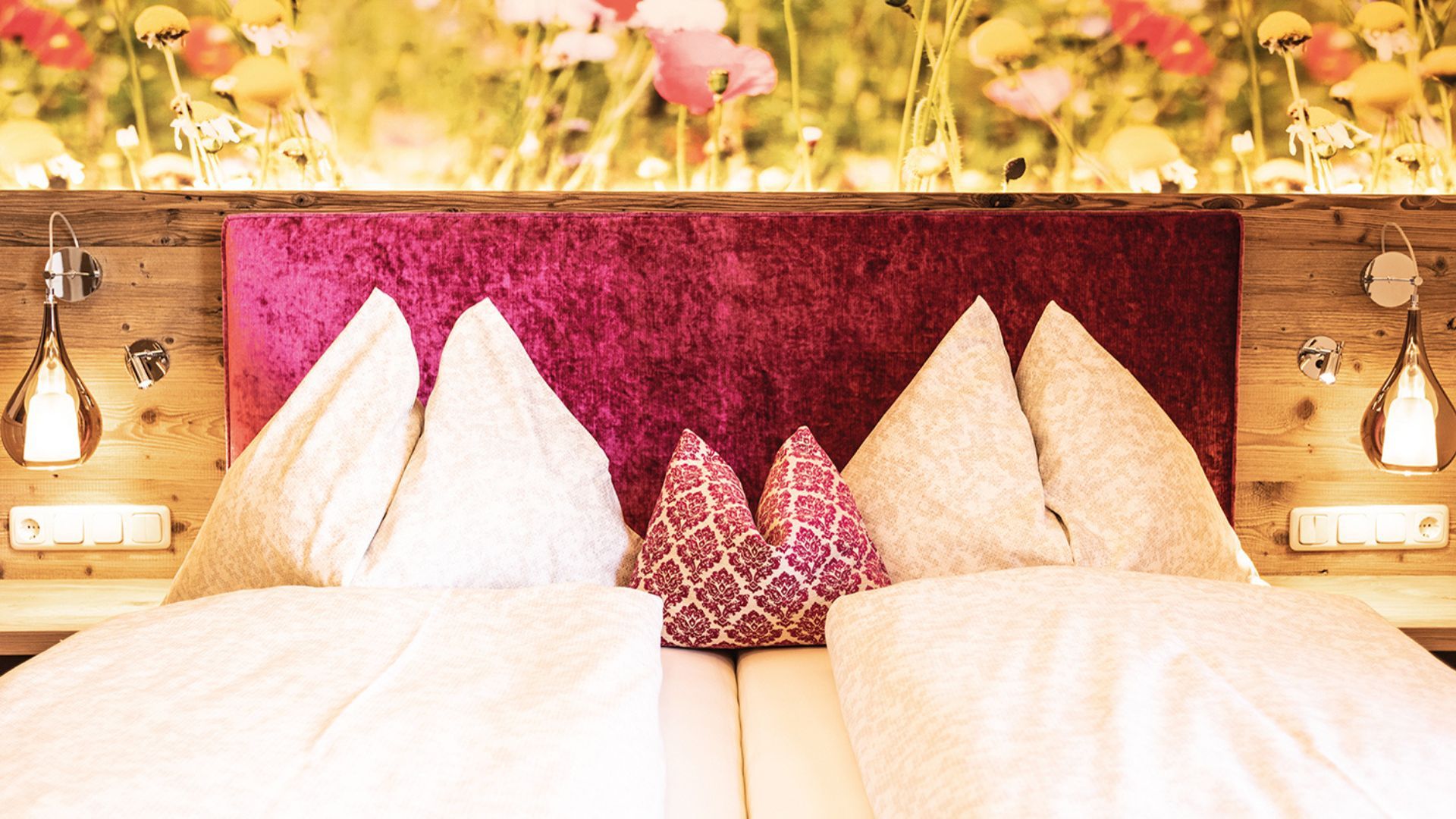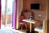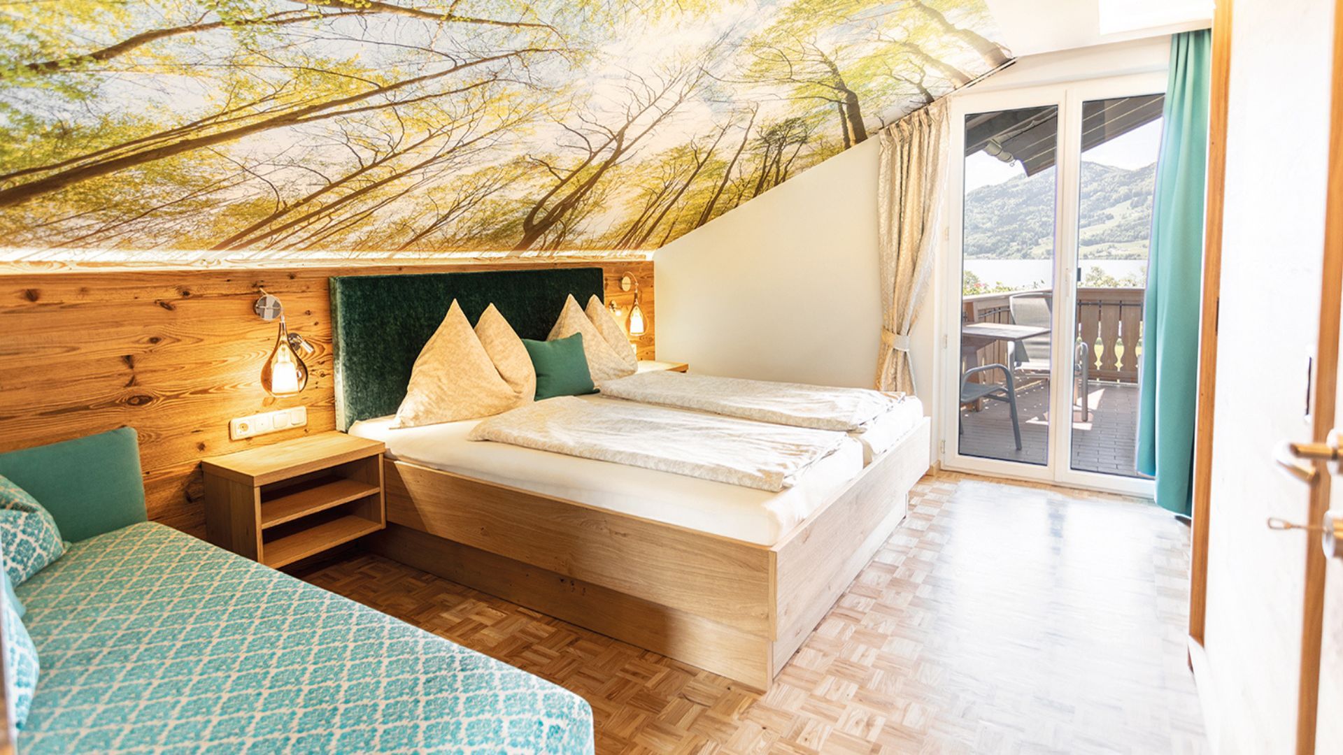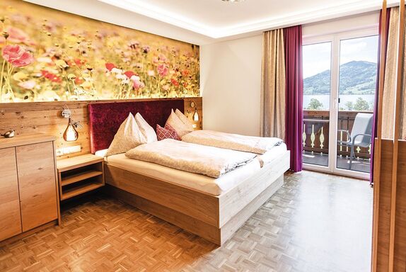Gemütliche Ferienwohnung für 2 Personen mit großzügigem Blumenwiesenmotiv. Die frischen Farben der Ausstattung und Dekoration harmonieren und laden zum Entspannen ein. Apartment Wiese bietet ein modernes, geräumiges Bad und eine vollwertige Küchenzeile. Am Balkon überblicken Sie das gesamte Südende des Attersees.