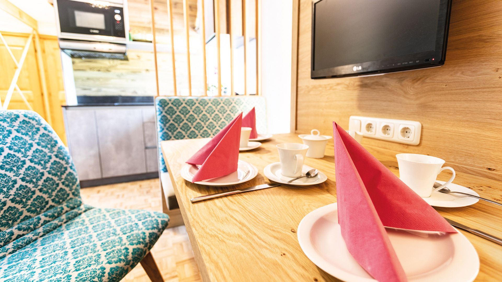 Die Apartments sind mit einer Kochgelegenheit, Geschirrspüler, Mikrowelle mit Grillfunktion, Kühlschrank mit Gefrierfach, Wasserkocher, Filterkaffeemaschine sowie Geschirr, Besteck, Handtücher und TV ausgestattet.