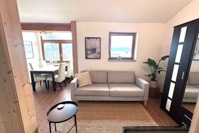 Die Wohnung eignet sich für zwei Erwachsene und ein Kind. Sie bietet ein Boxspring-Doppelbett, ein Schlafsofa für ein Kind bis 12 Jahre, eine voll ausgestattete Küche, einen Esstisch und ein Bad mit Dusche. Alle Räume sind verdunkelbar. Eigener Außenzugang im zweiten Stock, nicht barrierefrei.