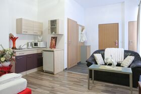 ein professionell geführtes Familienbetrieb günstige Parkmöglichkeit in unmittelbare Nähe russischsprachige Geschäftsführung Alle Zimmer (auch economy Einzelzimmer und Doppelzimmer) sind mit Badezimmer ausgestattet Studios und Apartments sin mit der Küche ausgestattet Die Öffnungszeiten der Rezeption richtet sich nach Bedarf der ankommenden Gäste ( Check in ist auch nach 21.00 möglich).