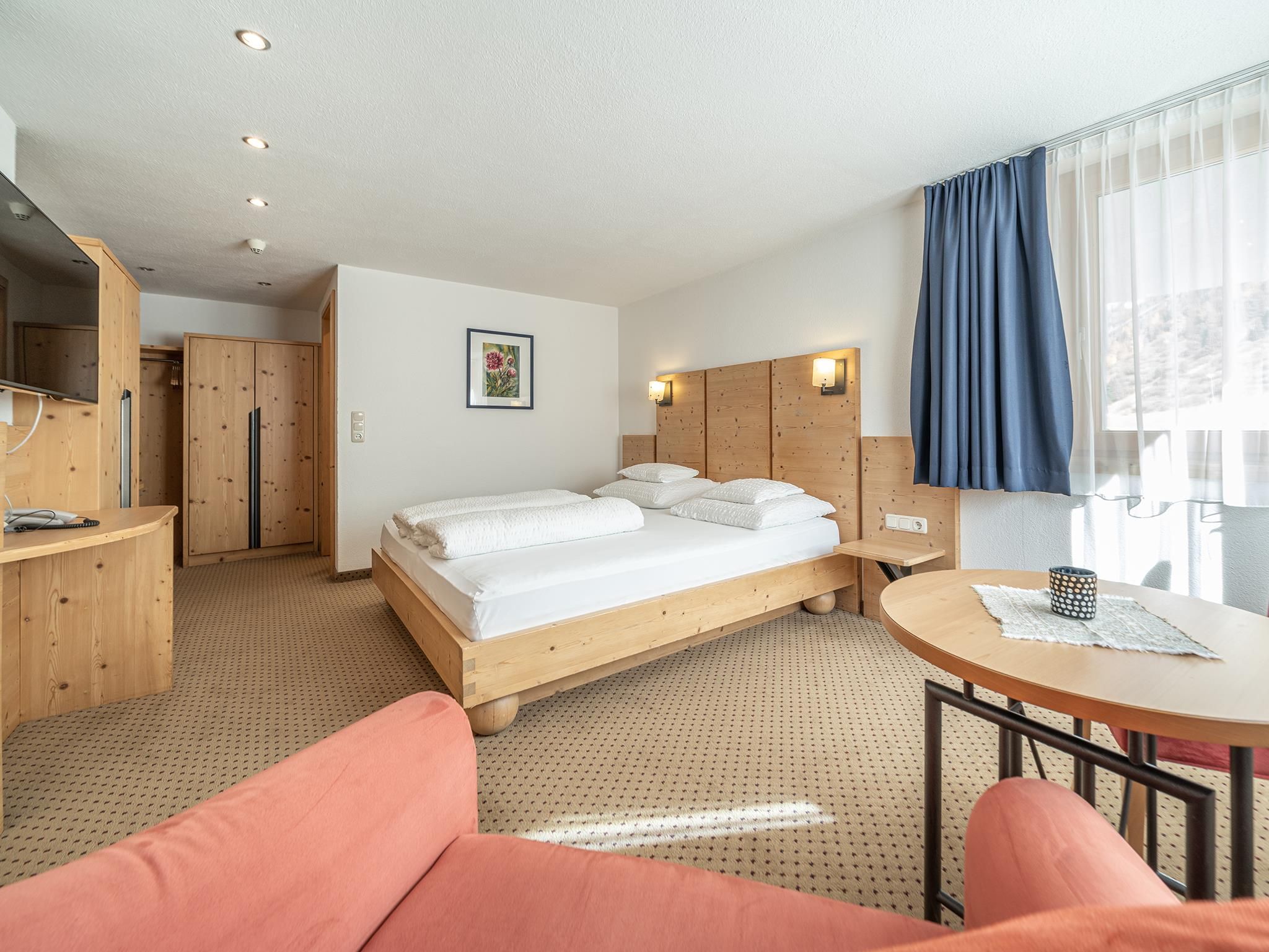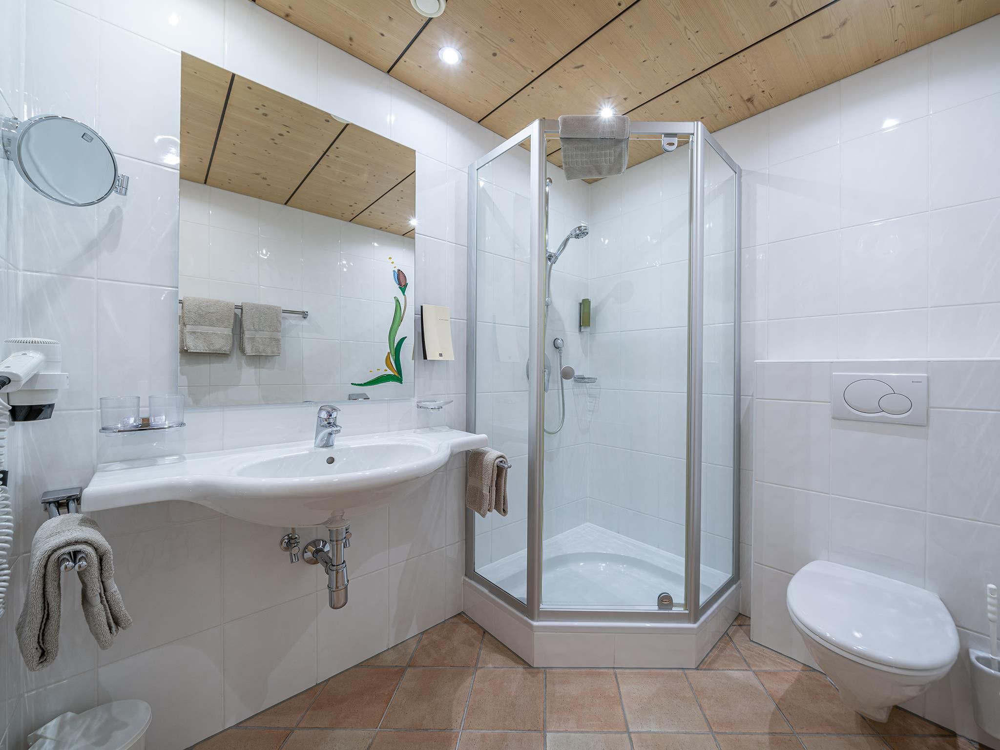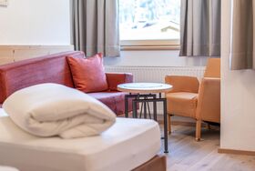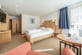 Doppelzimmer Typ B für 1-3 Personen mit Zustellbett für die 3. Person. Getrennte Betten teilweise auf Anfrage möglich. Dusche/WC, Haarfön, Kosmetikspiegel, Handtücher, Flat-TV, Safe, Telefon, Bettwäsche. W-Lan. Größe ca. 22 m²