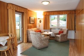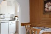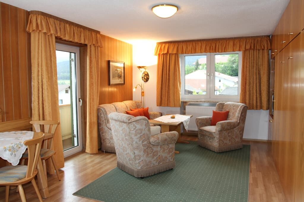 1-Zimmerappartement mit Küchenzeile, Essbereich und Balkon mit Blick zum Weltcupberg Arber