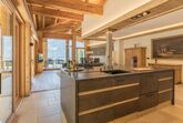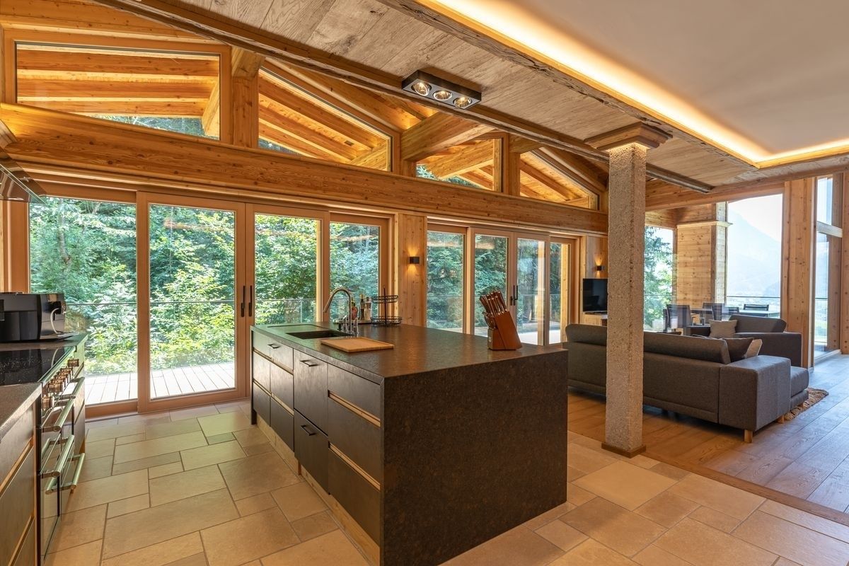 Der großzügige Wohnraum mit gemütlicher Couch und offenem Holzkamin mit Sichtfenster schafft ein stilvolles Wohlfühlambiente. Die top ausgestattete Designküche mit Falcon-Induktionsherd und Dampfgarer lädt zu kulinarischen Genussmomenten ein.