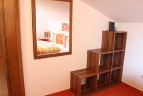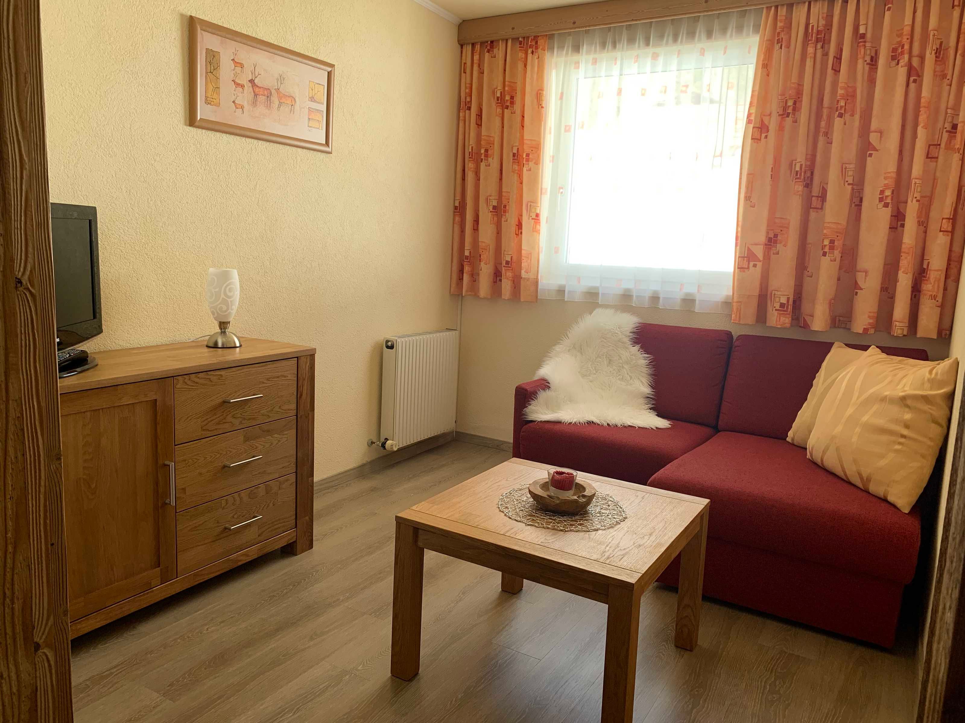Wohnung mit 1 Schlafzimmer, DU/WC, Wohnraum mit gemütl. Couch und TV, Küche mit gemütl. Sitzecke, Vorraum und Balkon.