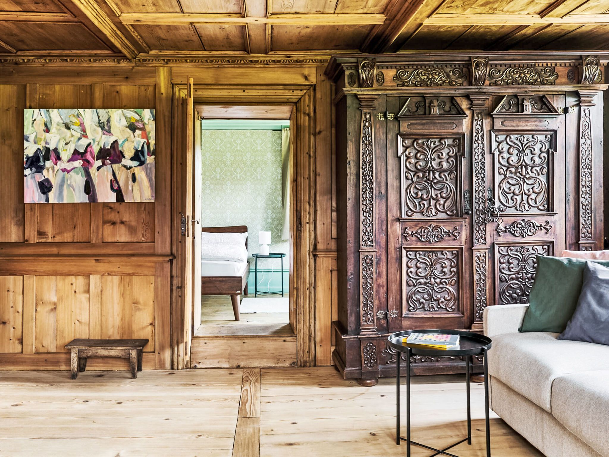 2-Zimmer-Wohnung 74 m2 im 2. Stock. Renoviert im Jahre 2025, sehr stilvoll und mit viel Holz eingerichtet: Wohn-/Esszimmer mit 1 Diwanbett (140 cm, Länge 195 cm). 1 Zimmer mit 1 Doppelbett (200 cm, Länge 180 cm). (Backofen, Geschirrspüler, Toaster, Wasserkocher, Mikrowelle, Tiefkühler, elektrische Kaffeemaschine). Bad. Holzdielenboden. Schöne Sicht auf die Landschaft. Zur Verfügung: Internet (WLAN).