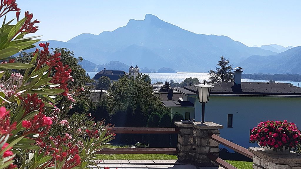 Sie genießen einen direkten Blick auf den Mondsee, umgeben von einem herrlichen Bergpanorama.