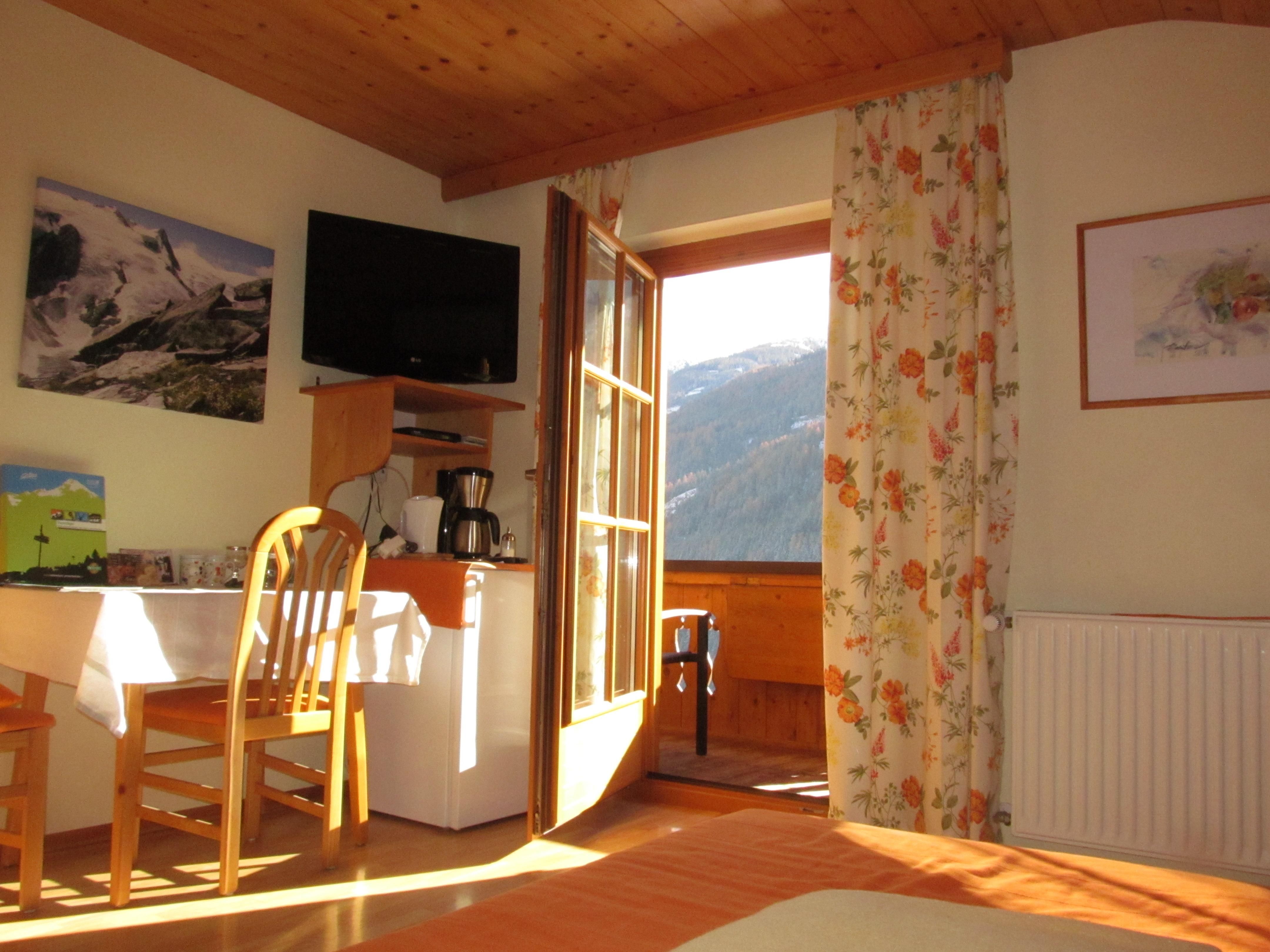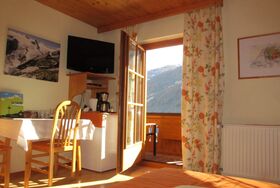 Doppelbettzimmer ohne Frühstück, bestehend aus Garderobenraum, Badezimmer mit Dusche und WC, Sofa, Tisch, Kühlschrank, Kaffeemaschine, Wasserkocher, Föhn, Balkon nach Süden, kann auch zum Appartement Goldriedblick dazu gemietet werden