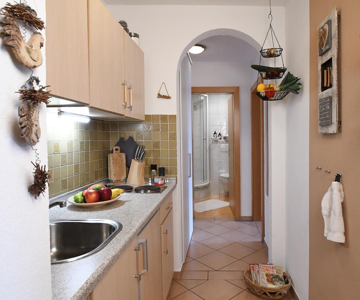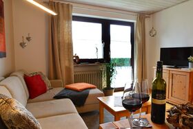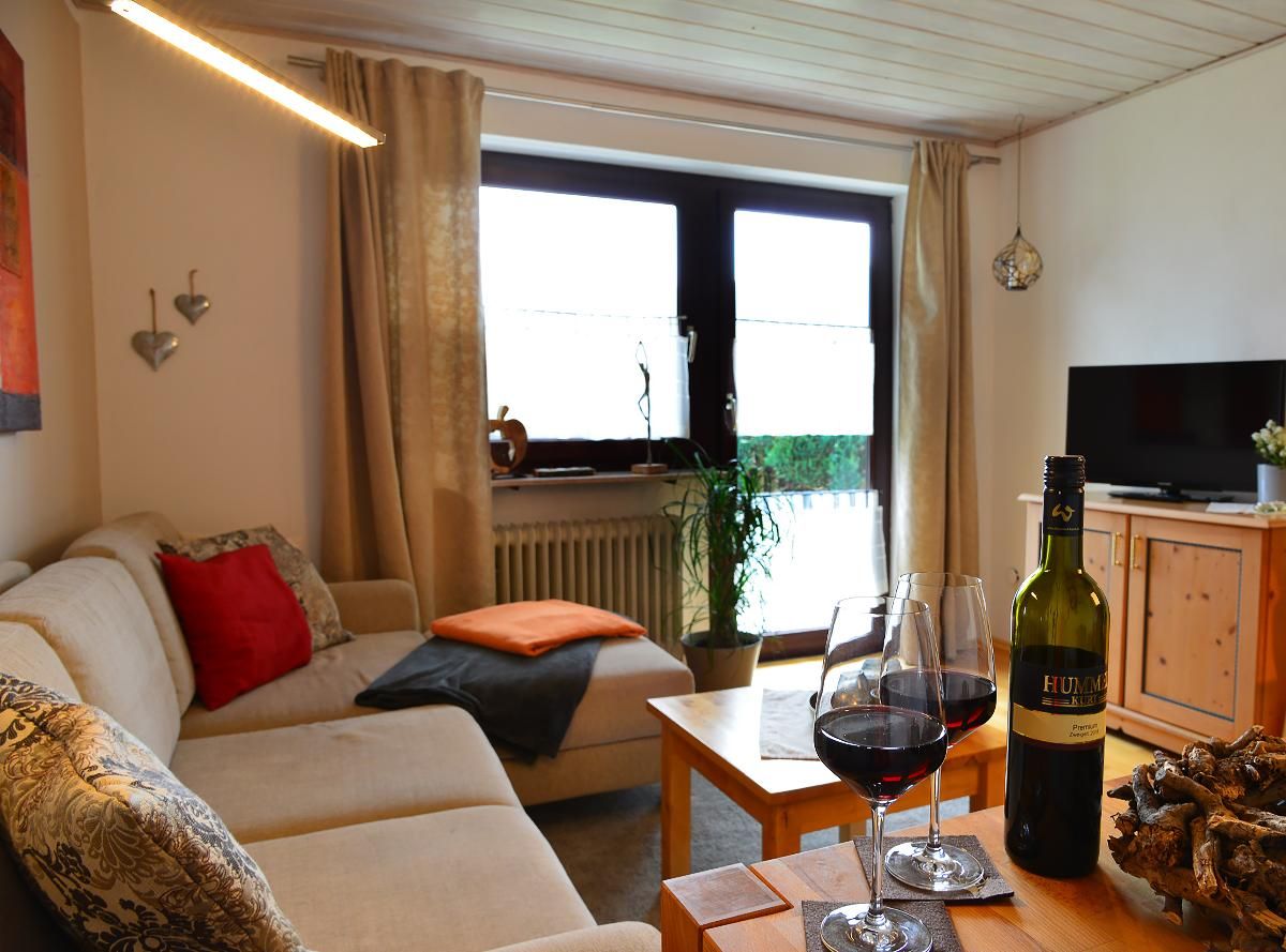 Die große Ferienwohnung ist ideal für 2 Personen. Sie verfügen über ein Schlafzimmer mit Vollholzmöbeln, einem neu renovierten sehr schönen Bad mit DU/WC, einem Vorraum mit Ihrem Kleiderschrank, einer separaten neuen Kochnische, welche sehr gut mit Teekocher, Minibackofen, schönem Geschirr, etc. ausgestattet ist. Ihr Wohnzimmer mit neuem Parkettboden ist sehr gemütlich eingerichtet mit einer neuen Rundeckcouch, einem Esstisch und SAT-Flachbildfernseher mit DVD. Vom Schlafzimmer bzw. Ihrem Wohnzimmer gelangen Sie auf Ihre eigene Terrasse mit Gartenmöbeln.