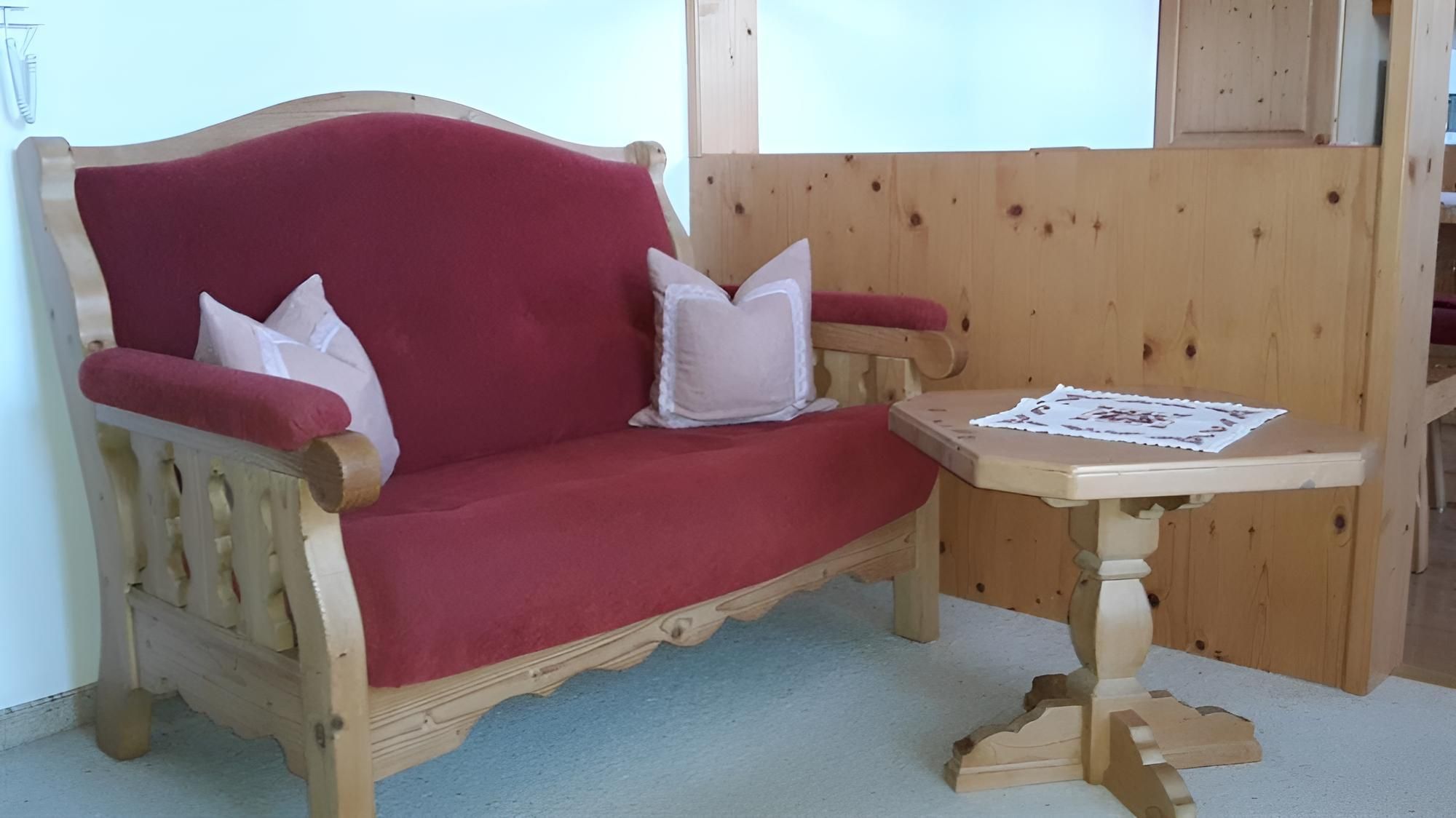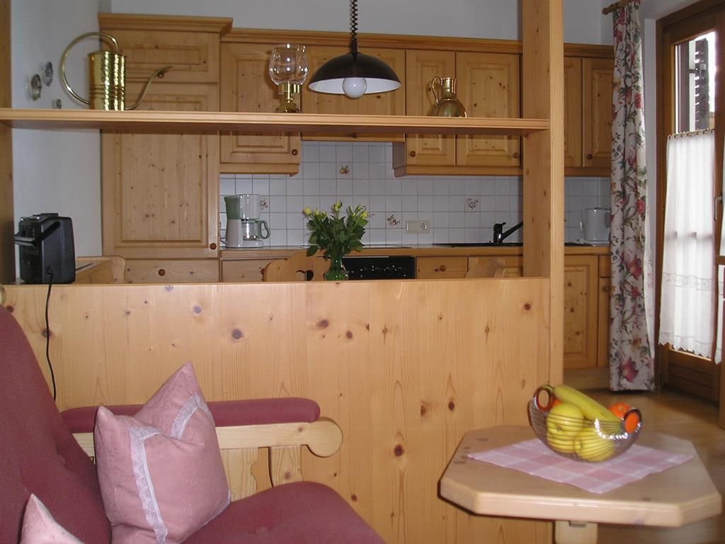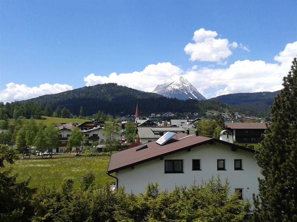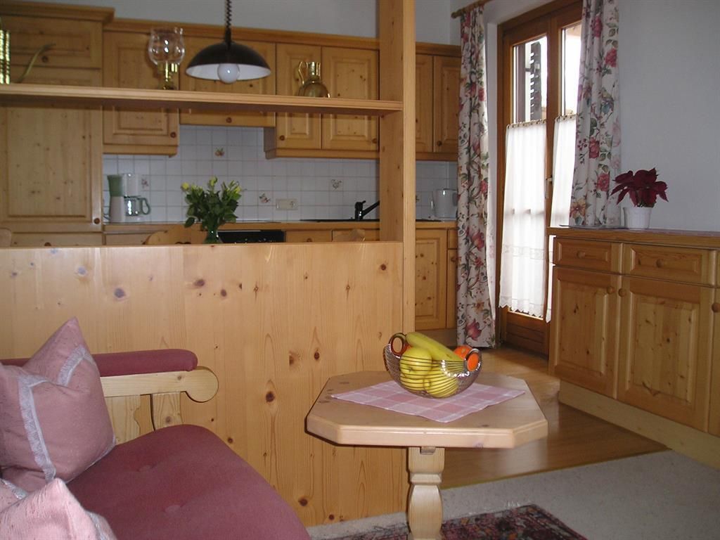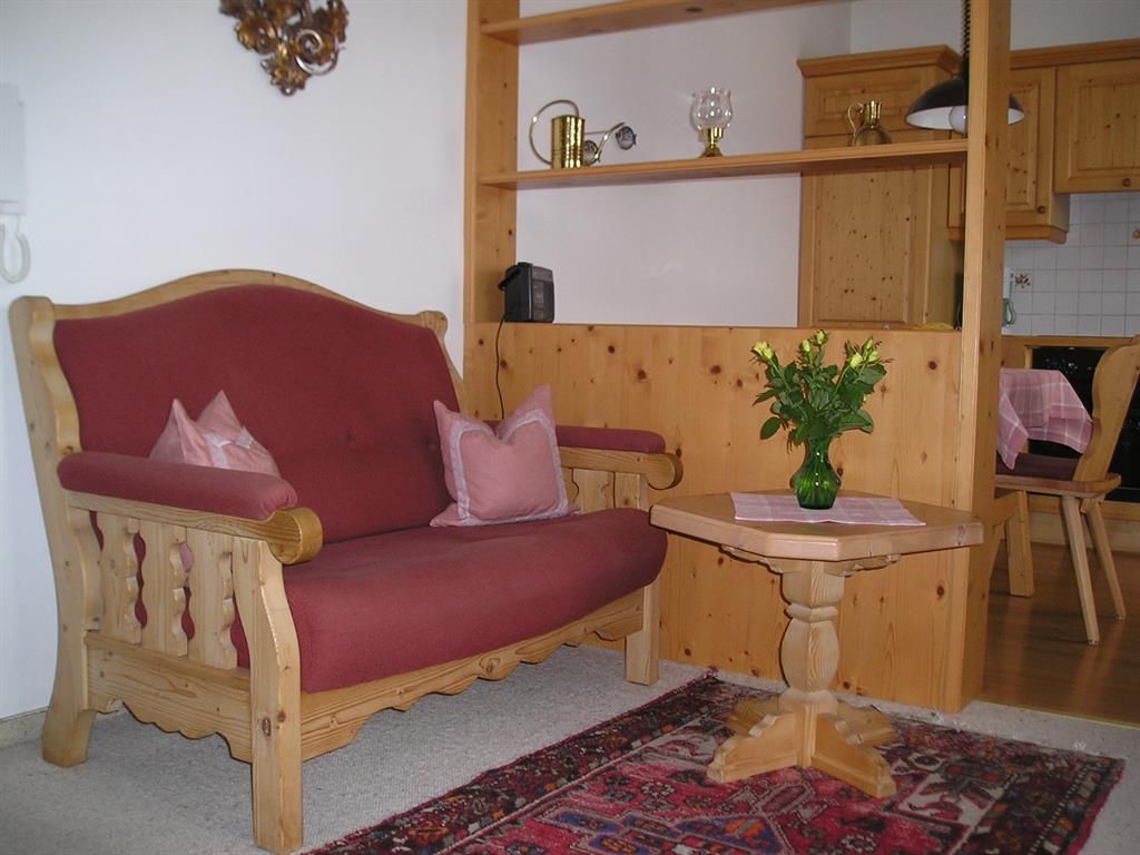 Wohnraum mit kompletter Küchenzeile und Essecke, Sofa, Schlafzimmer, über dem Gang (ca. 1 1/2 Meter) befindet sich das Bad/WC - nur zu Ihrer alleinigen Benutzung, Abstellraum, großer West-Balkon (ab Mittag bis zum Sonnenuntergang - Sonne), mit freiem Ausblick auf Seefeld und die umliegende Bergwelt. W-LAN kostenlos.