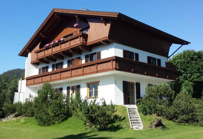 Gepflegtes Haus mit großem Garten, in ruhiger, sonniger Lage, mit Aussicht auf die herrliche Bergwelt. 5 Gehminuten zum Ortszentrum, zur Golfacademy, zur Langlaufloipe und zur Haltestelle für den Gratis-Ski-Bus.