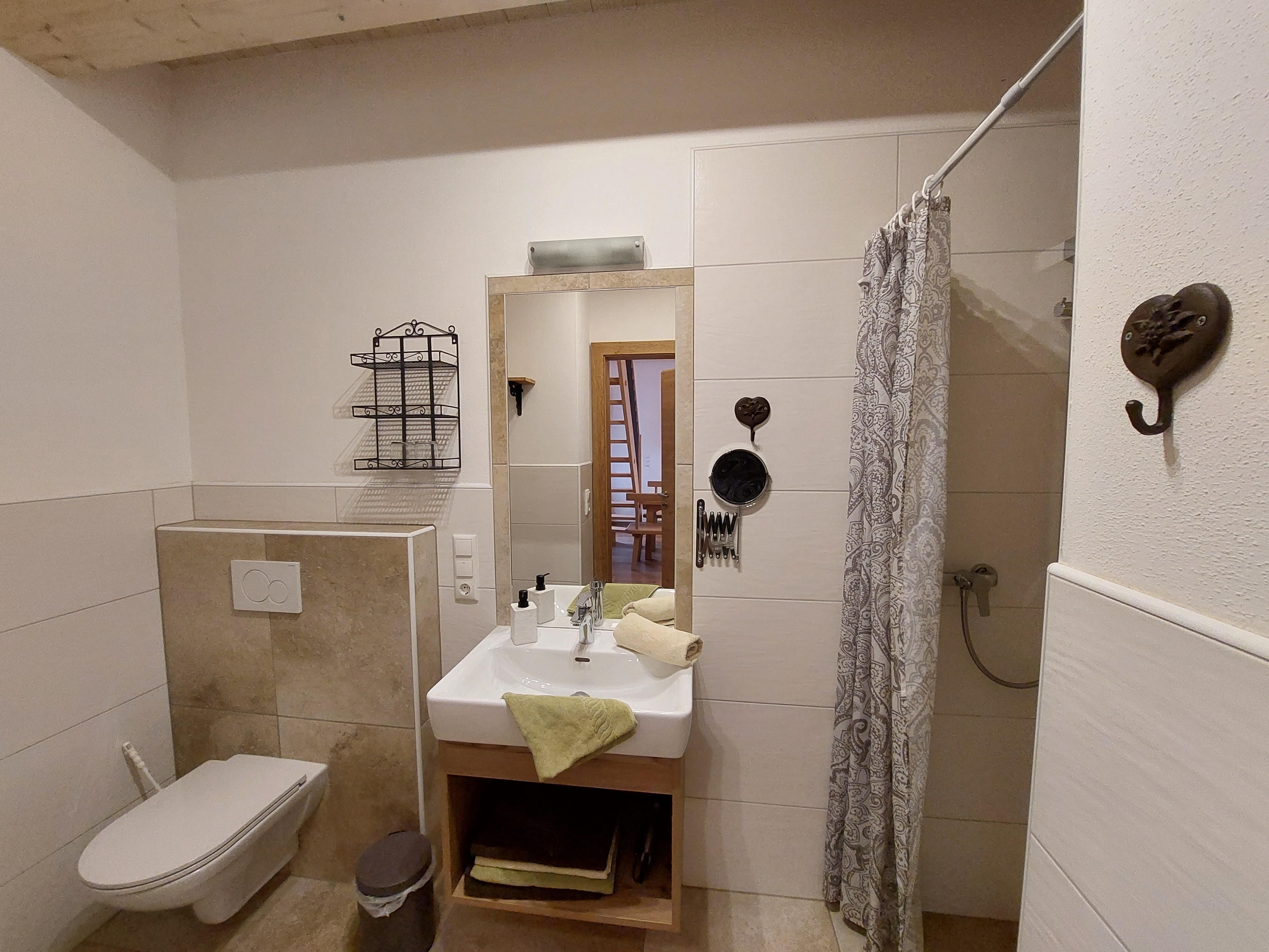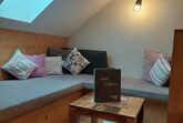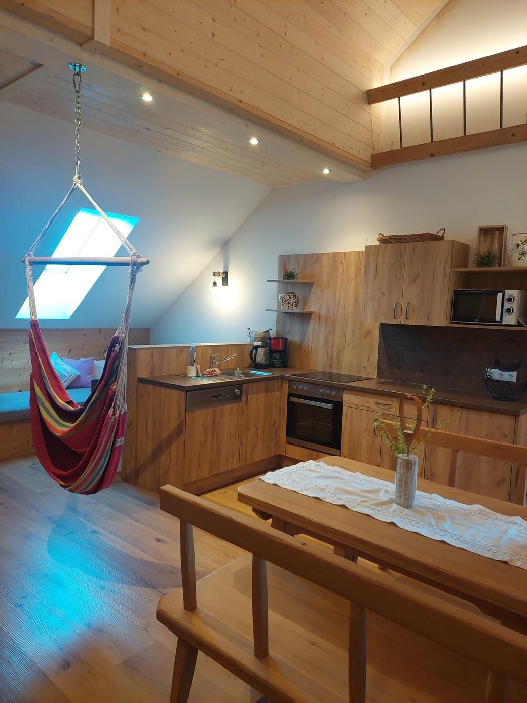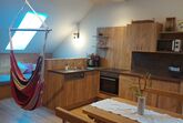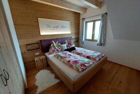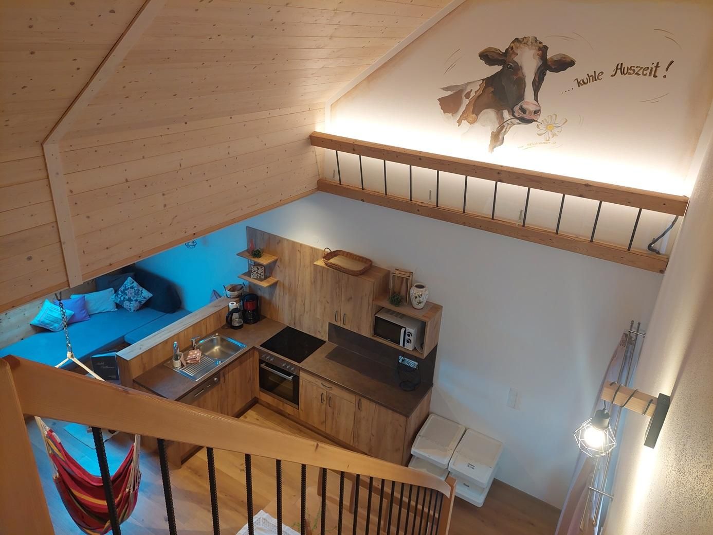 Die mit viel hochwertigem Vollholz eingerichtete Ferienwohnung bietet 2 getrennte Schlafbereiche auf zwei Ebenen und ein Badezimmer mit Dusche/WC, Haarföhn und Kosmetikspiegel. Die vollausgestattete Küchenzeile mit Ceranfeld, Backrohr, Kühlschrank mit Tiefkühlfach, Mikrowelle, Spüle, Geschirrspüler, Filterkaffeemaschine und Wasserkocher ermöglicht alle kulinarischen Erlebnisse. Der gemütliche Wohnbereich mit großer Couch, Sat-TV und Terrasse bietet Entspannung pur.