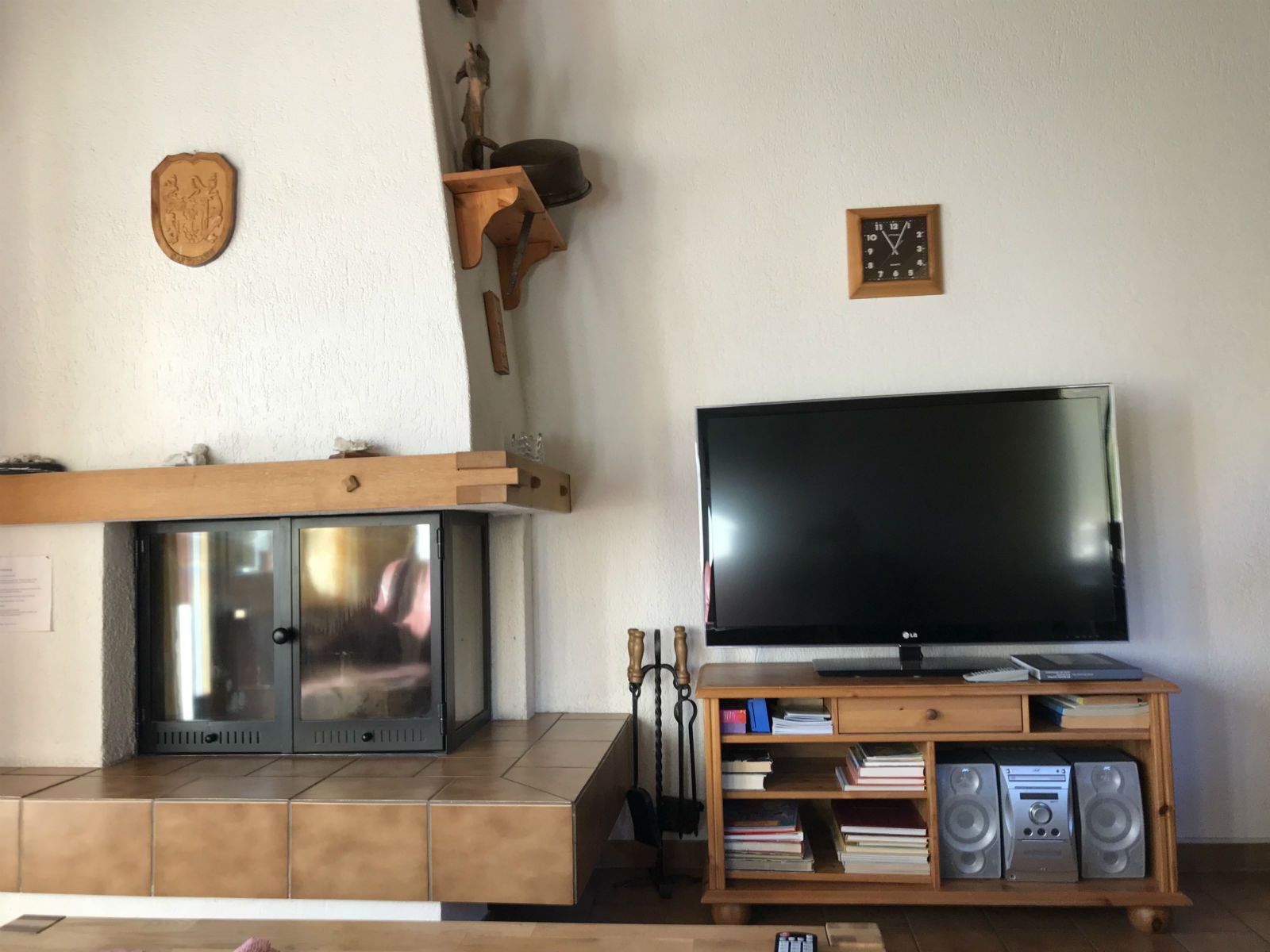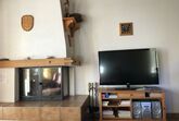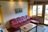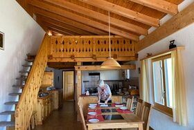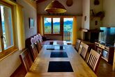 Sehr hohes zweckmässig eingerichtetes Wohnzimmer aus rustikalem, einheimischem Holz. Zusätzliches Wohnkomfort ermöglichen die Cheminée, das Ecksofa mit Clubtisch, der grosse Fernseher und ein Radio mit CD-Player, WLAN verfügbar. Im gleichen Raum befindet sich das Esszimmer mit Esstisch, 6 Stühlen und 4 Hocker.