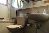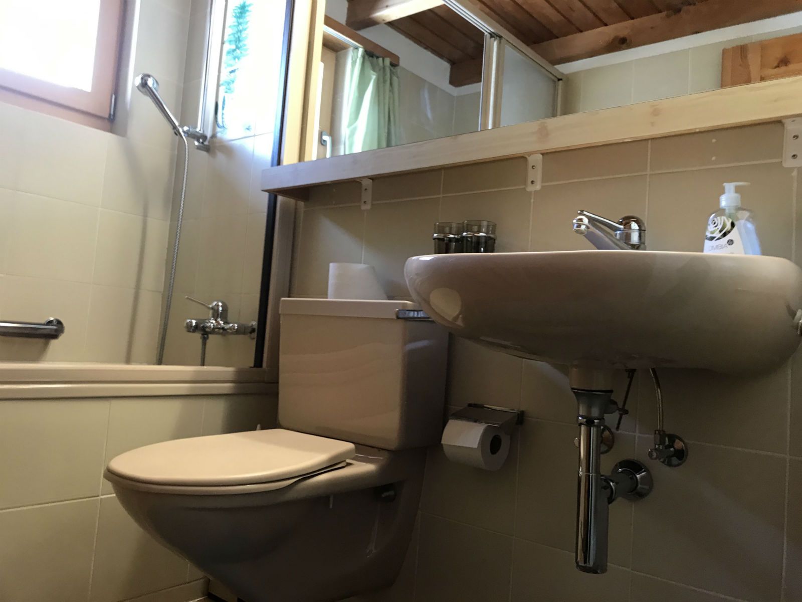Badewanne mit kombinierter Duschmöglichkeit (Schiebewand), ein WC mit danebenliegendem Waschbecken und mit grossem darüberliegendem Spiegel, ein Badkasten für Toilettenzubehör. Frotteewäsche kann separat dazugebucht werden.
