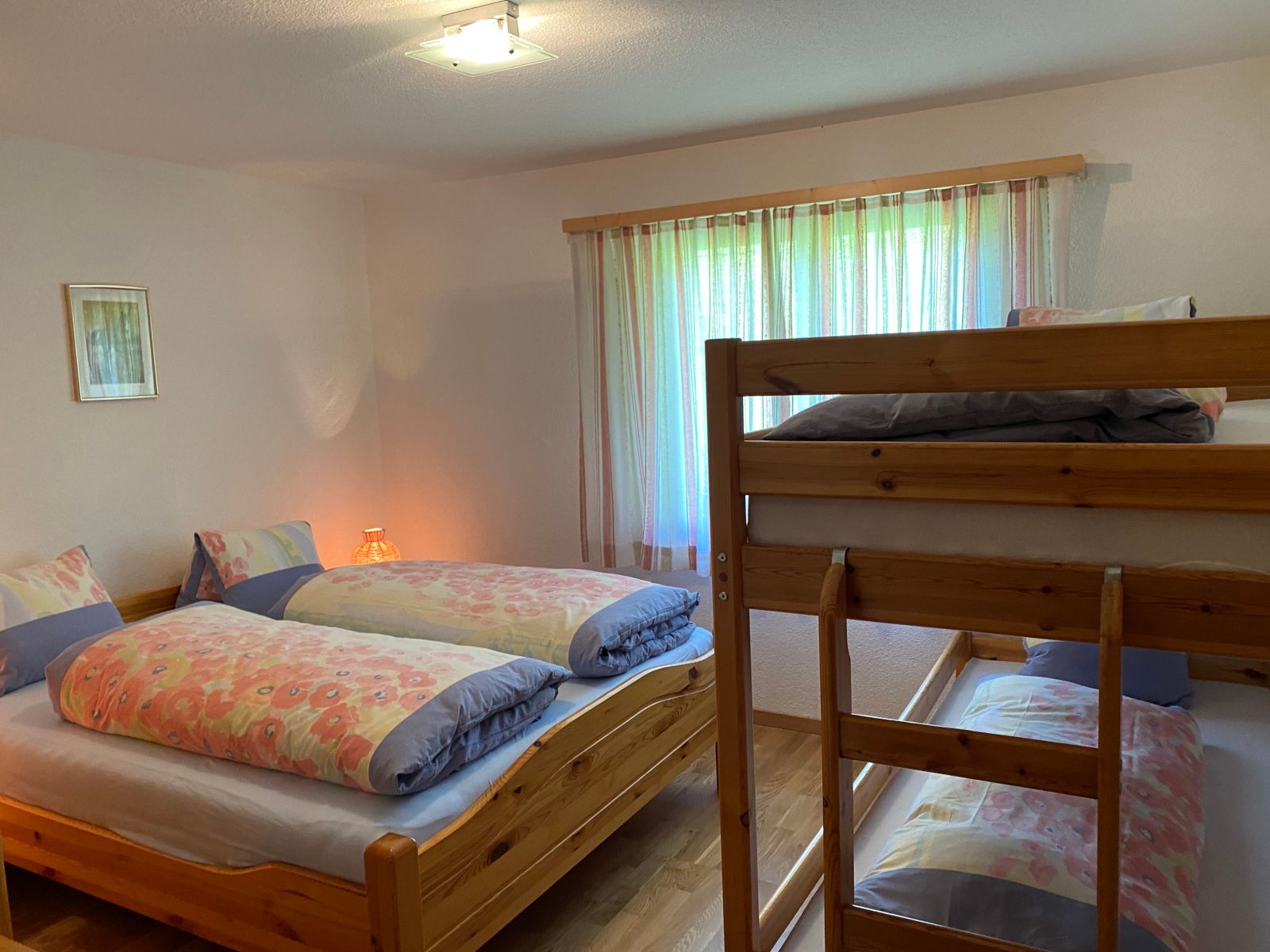 Ein Schlafzimmer mit Doppelbett und ein Schlafzimmer mit Doppel- und Etagenbett. Beide Schlafzimmer verfügen über Kleiderschränke.