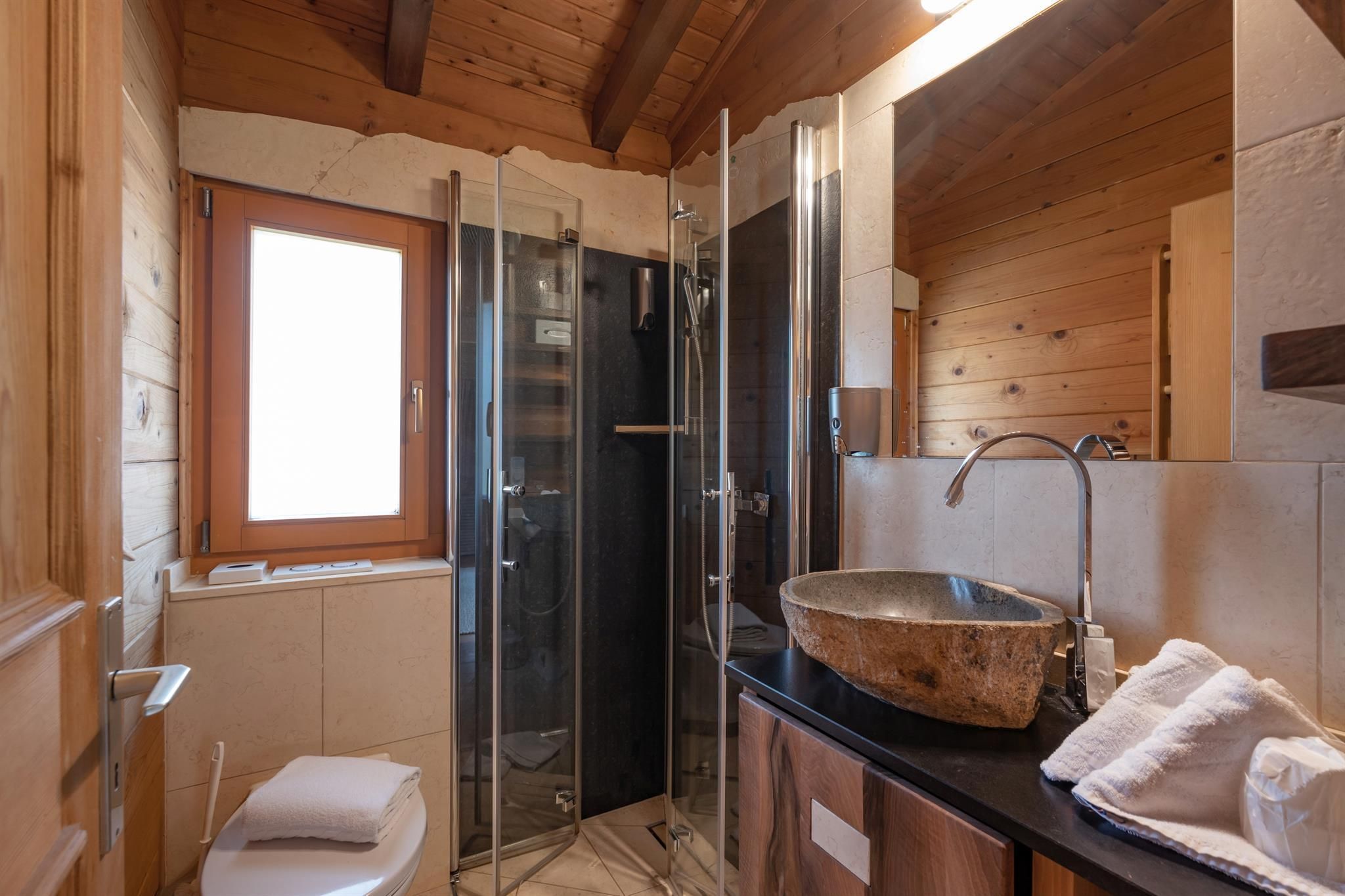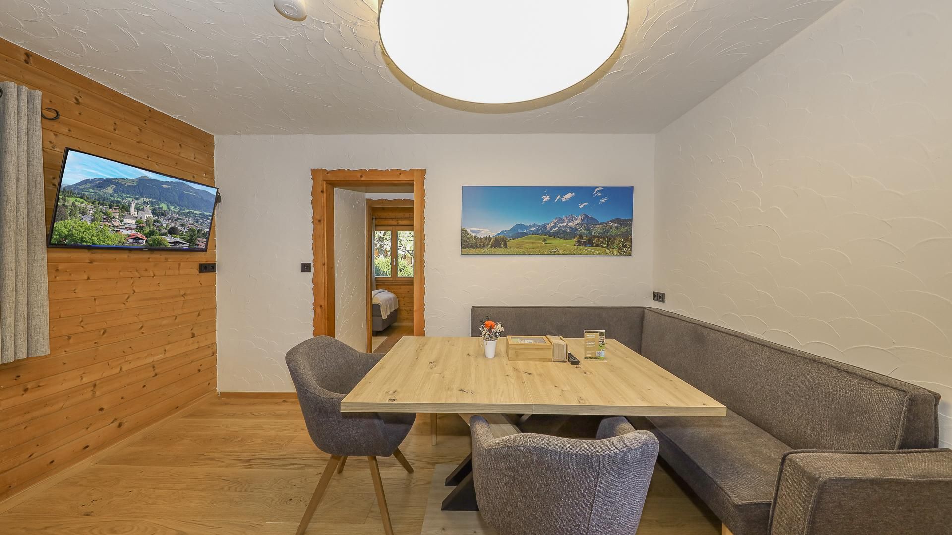 Dieses Apartment befindet sich entweder im Hotel mit fantastischer Aussicht auf die umliegende Landschaft oder in einem Chalet im Hotelgarten.