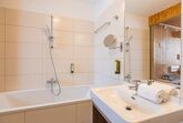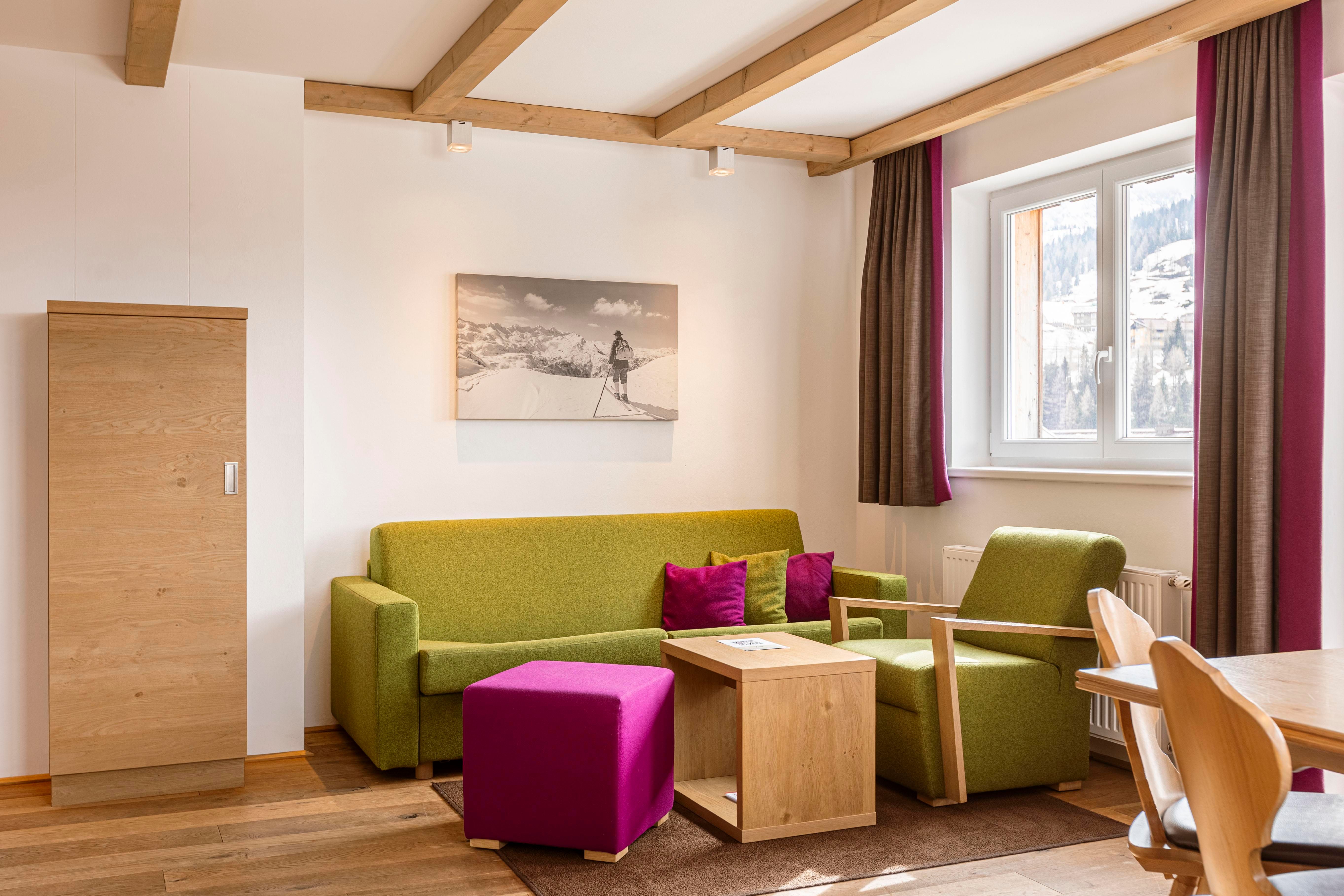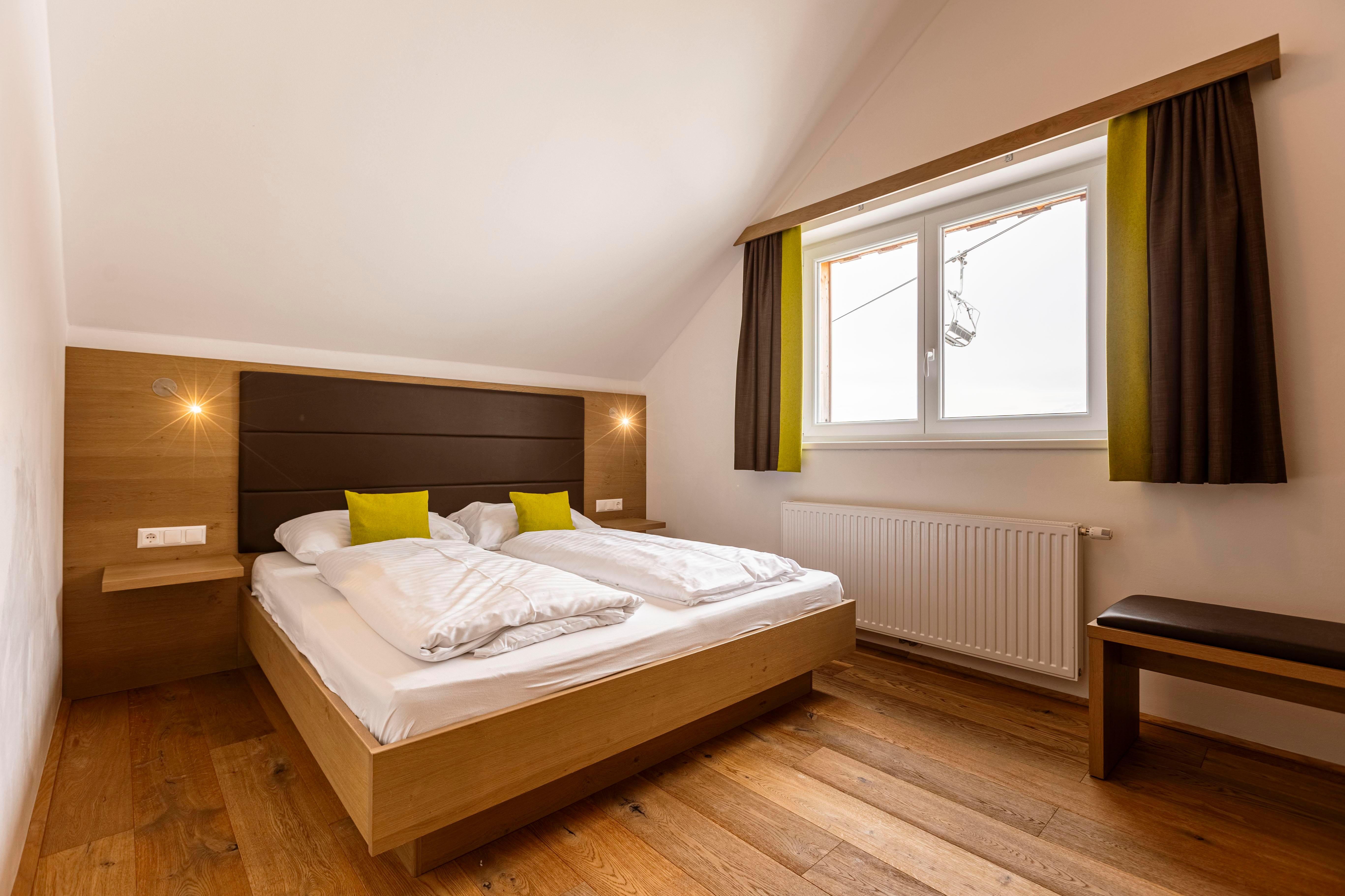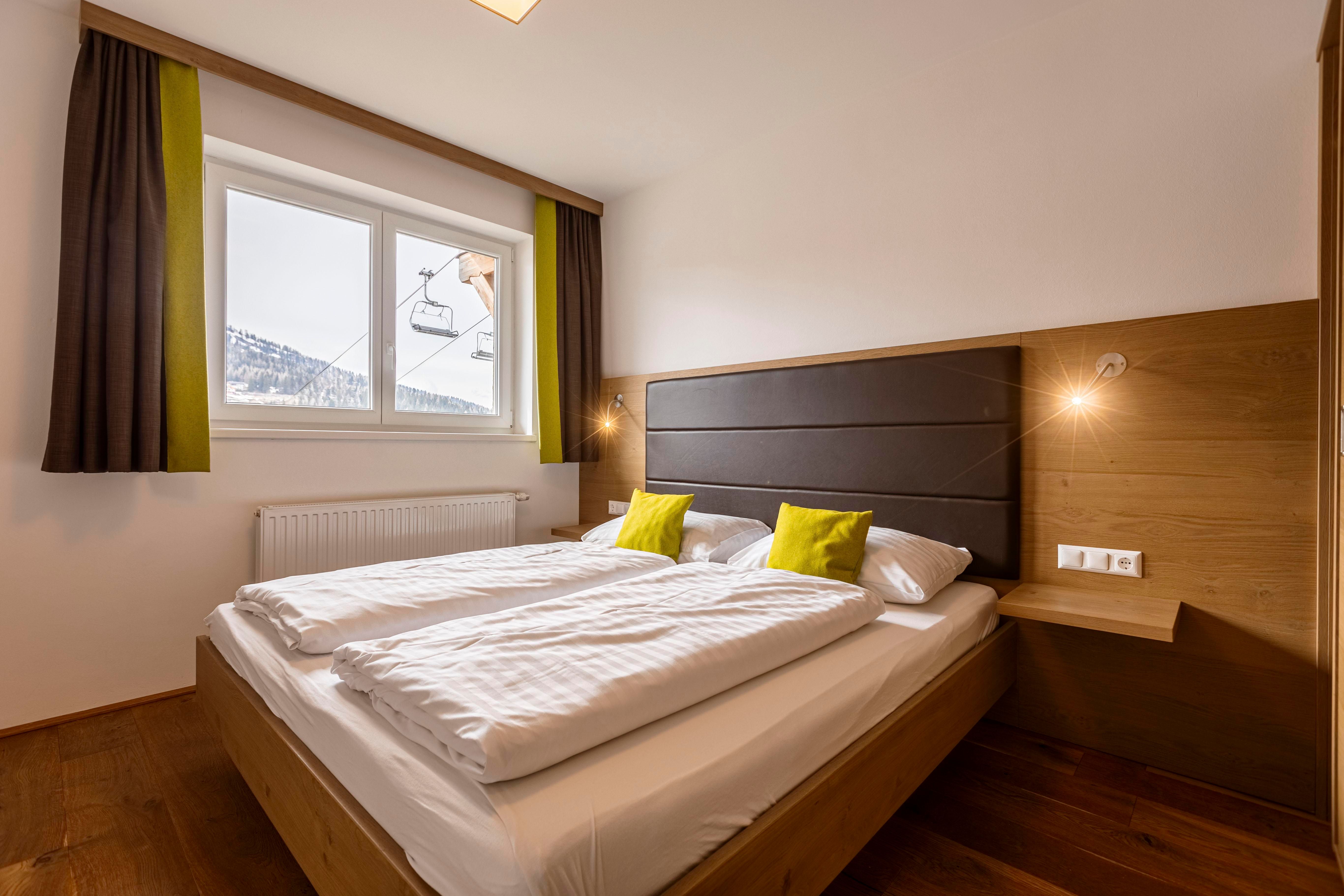auf zwei Ebenen, für 2 – 6 Personen, 2 Schlafzimmer (2x Doppelbett), 2 Bäder (Bad mit Dusche/WC und Bad mit Wanne/WC), eigene Bergsauna, Balkon, gemütliche Sitzecke, 3x SAT-TV, Zimmersafe, verschließbares Skidepot.