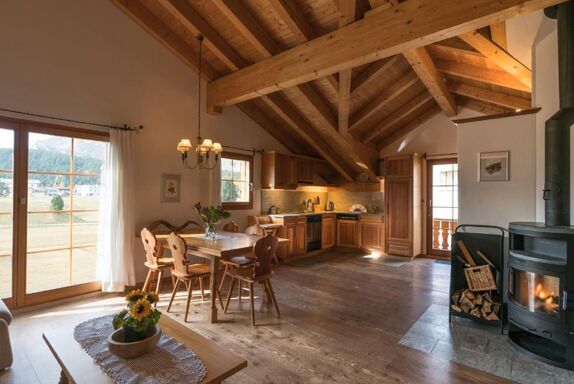 Diese sehr schöne und helle Ferienwohnung befindet sich an bester und ruhiger Lage in Maloja. Die Ausstattung vermittelt ein wohliges Feriengefühl in den Bergen: Der heimelige Holzboden und der knisternde Schwedenofen versprechen gemütliche Stunden sommers wie winters. Die Möblierung ist aufeinander abgestimmt und entspricht einem sehr guten Standard. Die Küche ist mit allen üblichen Geräten und Utensilien ausgestattet. Der Wohnraum öffnet den Blick nach Westen in Richtung Bergell und auf die umliegenden Berge. Sehr komfortabel sind auch die zwei Badezimmer, die sehr geräumig sind. In der Garage sind zwei reservierte Plätze vorhanden. Auf Wunsch stellen wir die Ausstattung für Fondue und einen Racletteofen zur Verfügung. Wenn Sie weitere Wünsche haben erfüllen wir diese gerne nach Möglichkeit. Sportmöglichkeiten in der Umgebung: Bergsteigen, Golfplatz, Klettern, Mountainbiking, Radtouren, Rodeln, Ski (alpin), Ski (Langlauf), Surfen, Tennis, Segeln Basisinformationen - Erlaubte Haustiere: keins - Unterkunftstyp: Ferienwohnung - befindet sich in: nichts zutreffend - Etage, auf der sich das Objekt befindet: OG1 - letzte umfassende Renovierung: 2004 - Nichtraucherunterkunft - Schlafzimmeranzahl: 2 - Badezimmeranzahl: 2 Top Merkmale - WLAN - Klimaanlage: keine - Heizung: überall - Fußbodenheizung: überall - Balkon - Garten: zur gemeinschaftlichen Nutzung - Private PKW-Stellplätze insgesamt für diese Unterkunft: 1 - ㄴ davon Garagenstellplätze: 1 Schlafen im Wohnbereich - Schlafzimmer abdunkelbar Schlafzimmer 1 - Doppelbett (1,80m Breite) - Schlafzimmer abdunkelbar Schlafzimmer 3 - 2x Einzelbett - Schlafzimmer abdunkelbar Badezimmer Badezimmer 1 - Dusche - Waschbecken - Toilette Badezimmer 3 - Badewanne mit Duschvorrichtung - Waschbecken - Toilette - Föhn Kochen/Wohnen - Kaffeemaschine: Kaffeemaschine - Kühl-/Gefrierschrank: Kühlschrank - Herd: Herd - Dunstabzugshaube - Backofen - Toaster - Wasserkocher - Spülmaschine - Größe der Küche: 30 m² - Anzahl Esstische: 1 - Gesamtzahl Sitzplätze: 6 - Anzahl Wohnzimmer: 1 - Ofen Entertainment - Fernseher: TV, Kabel-TV - Radio Hauswirtschaft - Waschmaschine: zur gemeinschaftlichen Nutzung im Gebäude - Staubsauger Barrierefreiheit - Aufzug Außenbereich - Outdoormöbel Umgebung - Aussicht: Berg, Garten, Wald, Wiese - nächstgelegene Ortsmitte: 20,0 km - Lebensmittelhandel: 300 m - Cafés/Restaurants: 300 m - Bahnhof: 20,0 km - Flughafen: 200,0 km - Autobahn: 60,0 km - Meer: 200,0 km - See: 500 m - Ski - Skilanglauf: 100 m - Berg-/Seilbahn: 500 m Besonderheiten - Inmitten der Natur gelegen