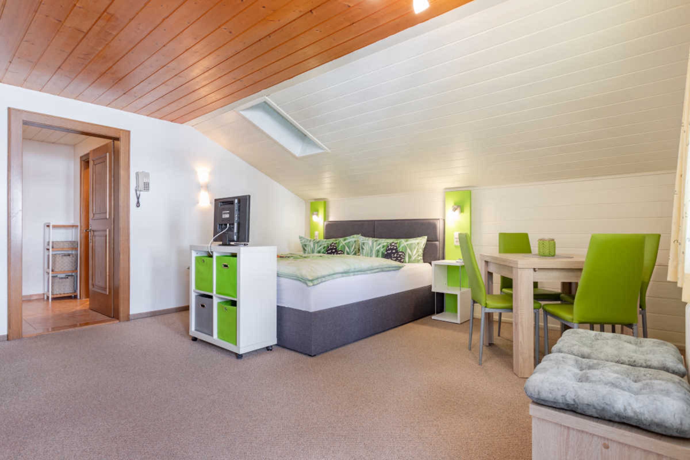 Das Apartment Storchennest setzt sich aus zwei separaten Räumen zusammen. Es gibt einen Wohnbereich mit Schlafmöglichkeit für 2 Personen und ein separates kleines Schlafzimmer. Die vollausgestattete Küchenzeile ist neu.