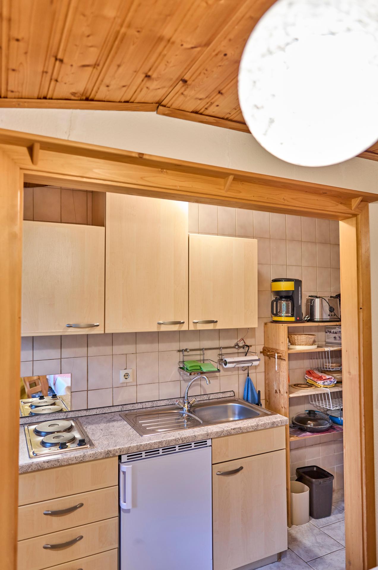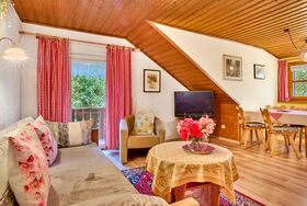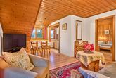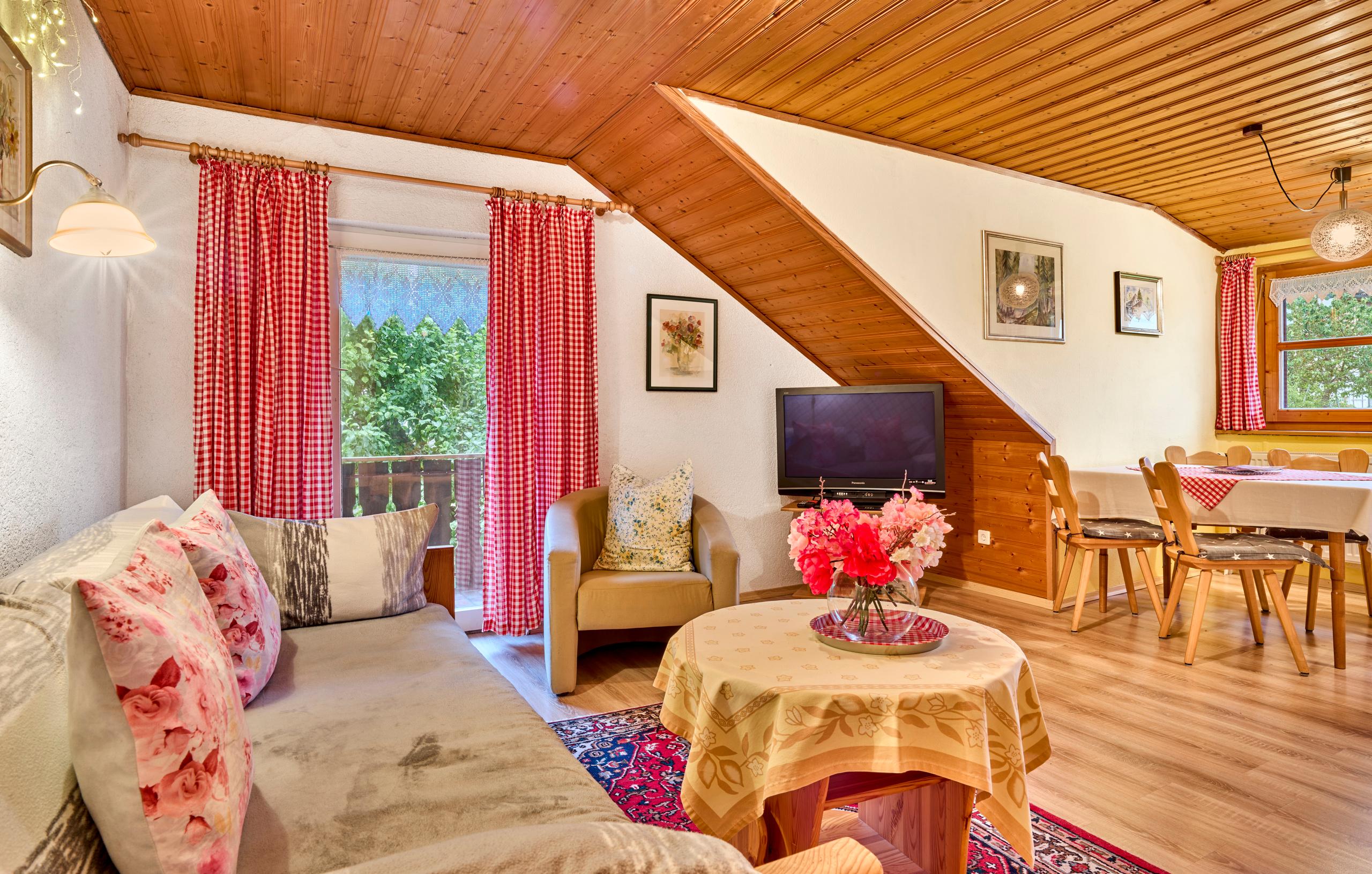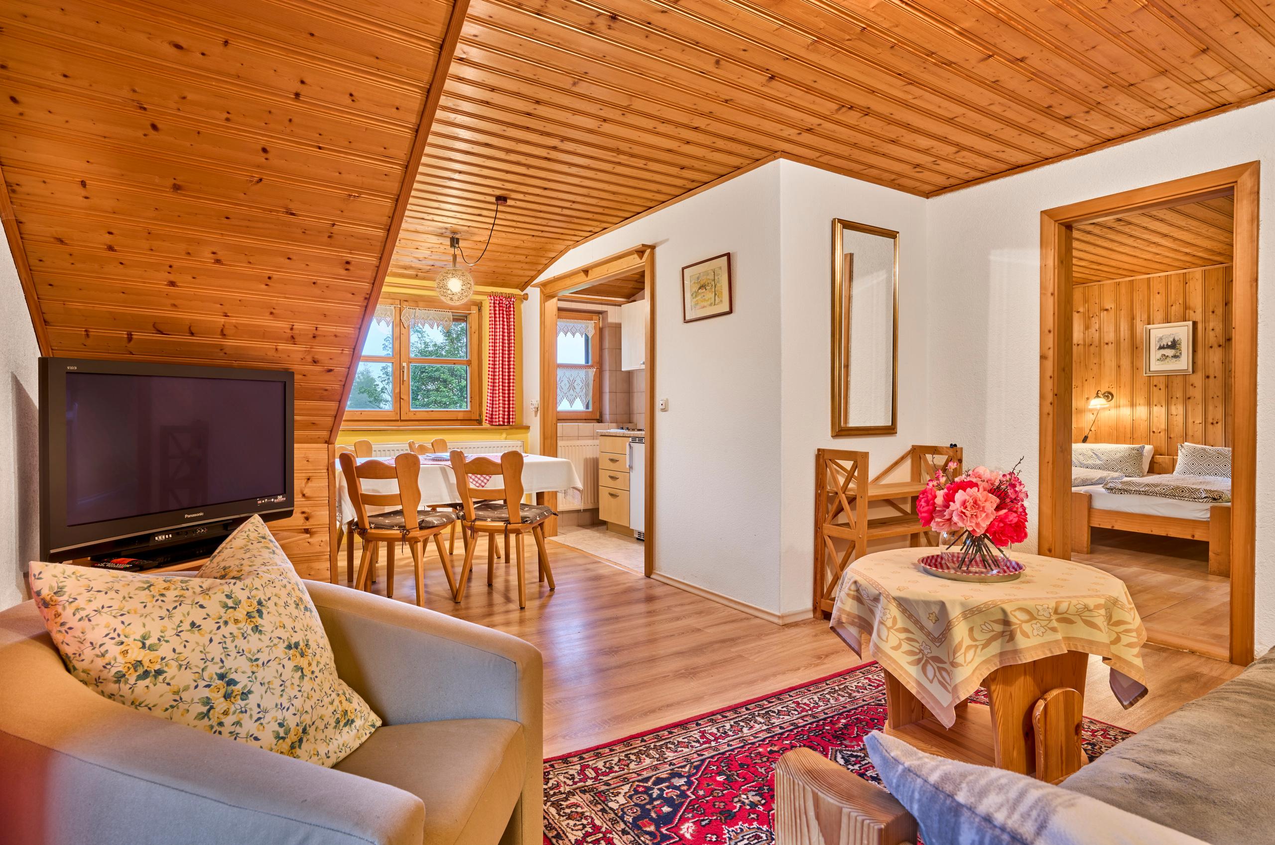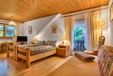 Wohnküche m. Couch, Schlafzimmer, großer überdachter Balkon mit Talblick.