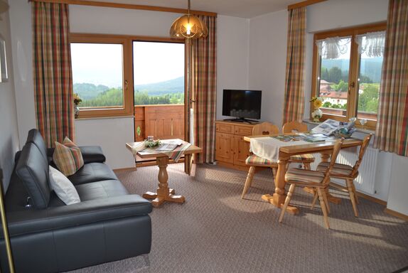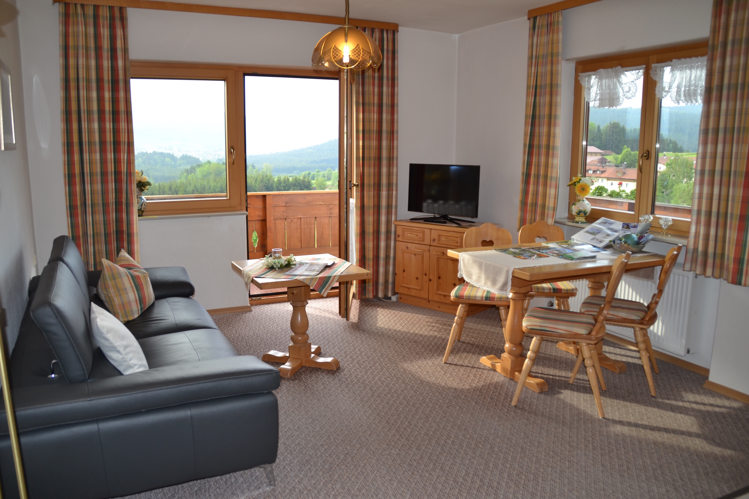 Von den familienfreundlichen Ferienwohnungen haben Sie einen herrlichen Panorama-Blick auf die Berge und in das Tal. An manchen Abenden kommen Rehe bis an das Haus heran.