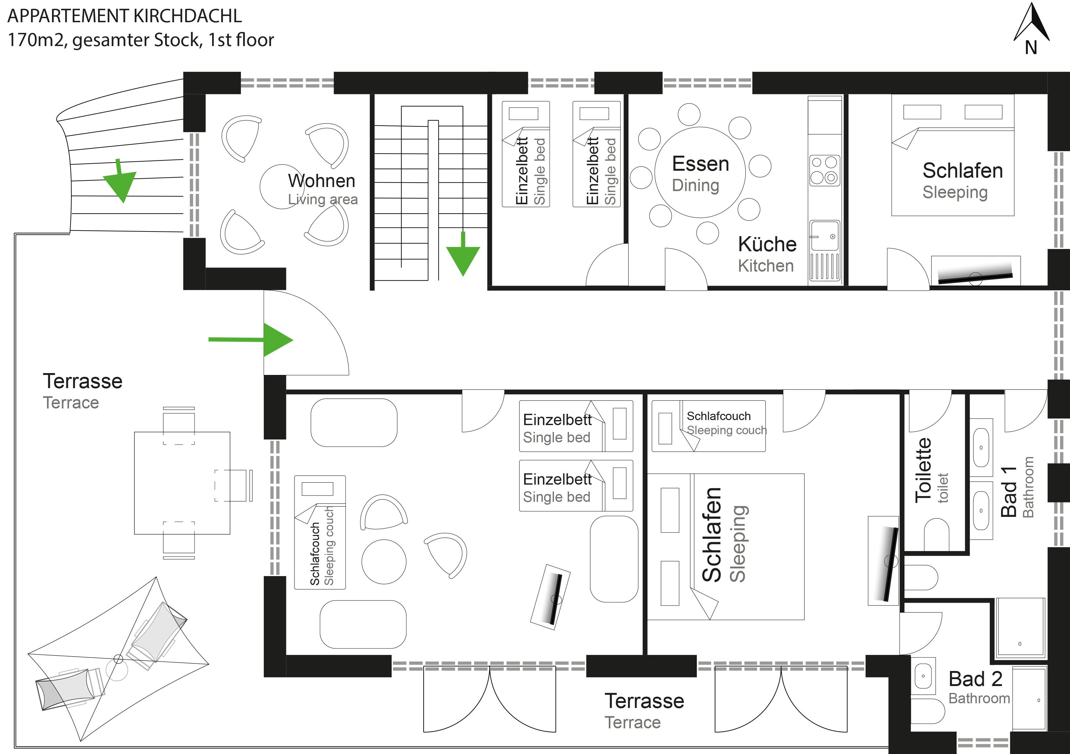 Geniessen Sie Ihren Urlaub mit einer grösseren Gruppe zwischen 4 bis 10 Personen im 1.Stock in unserem Landhaus mit eigener Terrasse (60m2) und ca 170m2 Wohnfläche. Sie benützen den ganzen Stock und geniessen somit viel Ruhe und eine hohe Privatsphäre.