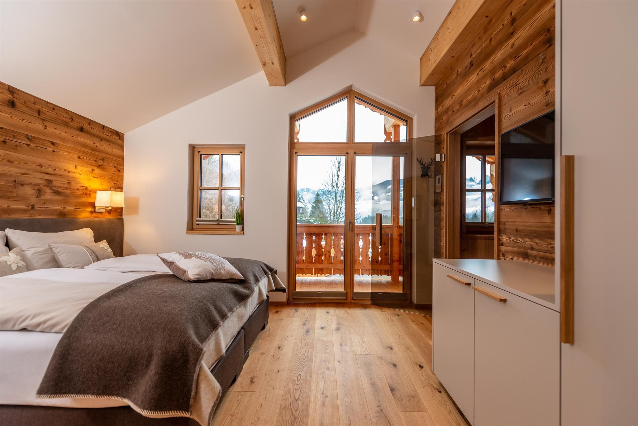 Alle Chalets sind nach SÜDEN ausgerichtet und tauchen dadurch in warmes Tageslicht ein. Die großzügigen Glasfronten und die luftigen Raumhöhen bis zu 5m verbinden alpin-moderne Interieur mit modernster Technologie.
