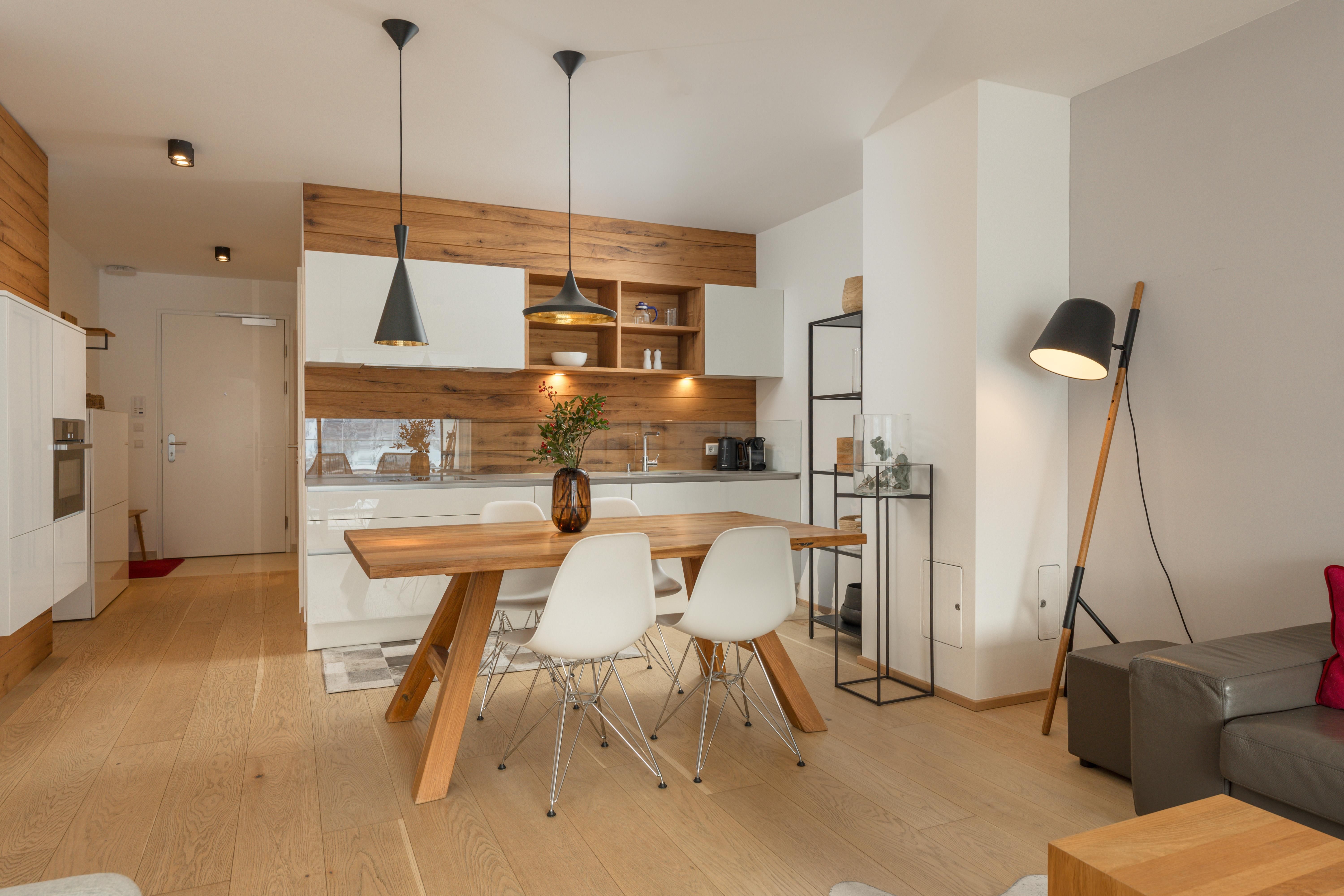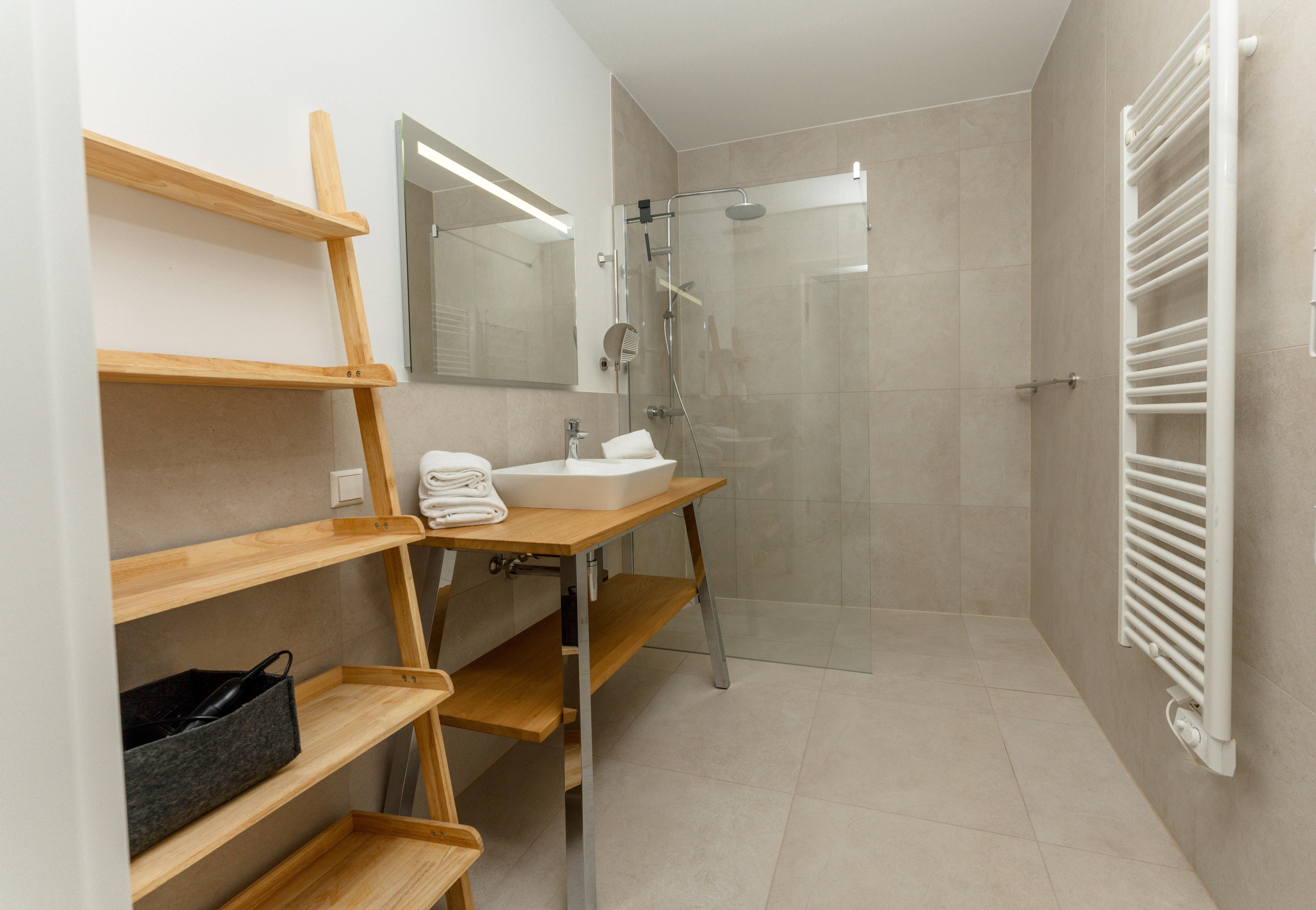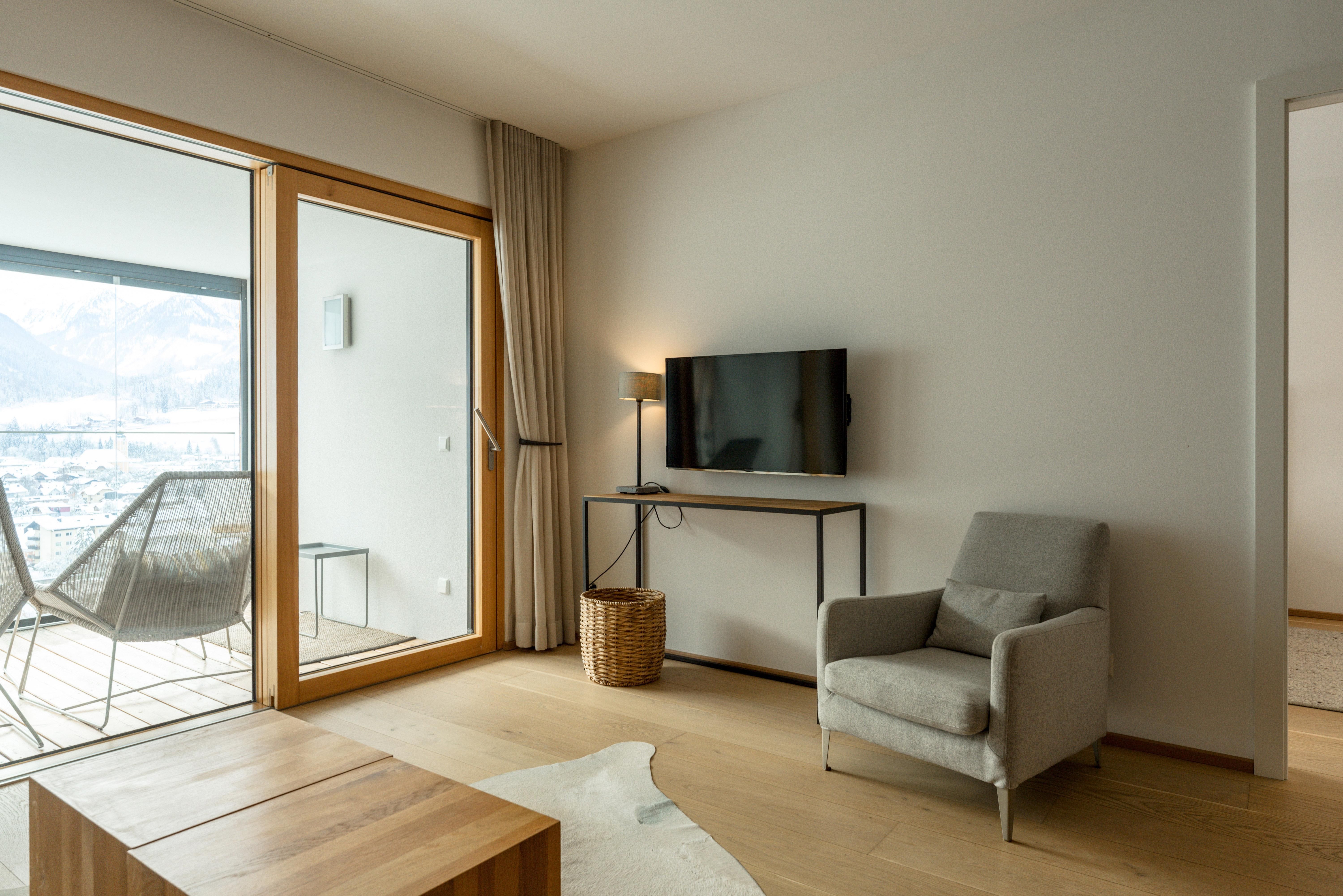 3 miteinander verbunden Häuser 38 servicierte Appartements, von 40m² Studios, Appartements mit einem, zwei oder drei Schlafzimmern bis hin zu 130m² Penthäusern, herrlichen Ausblick und Top Ausstattung inklusive! Die hochwertige Grundausstattung der Appartements mit heimischen Materialen wie Holz, Stein und Glas vermitteln ein modernes Wohlfühlambiente mit viel Licht und Aussicht, - eine Symbiose aus purem Lebensgefühl und Kraftplatz an der Sonne. Komplett ausgestattete Designküchen, großzügige Wohnräume zum Teil mit offenem Kamin, moderne & stylische Möbel, kostenfreies WLAN, Kabel TV in allen Schlaf- und Wohnräumen sowie moderne und lichtdurchflutete Badezimmer, lassen für den Gast, der seine private Freiheit schätzt, keine Wünsche offen .