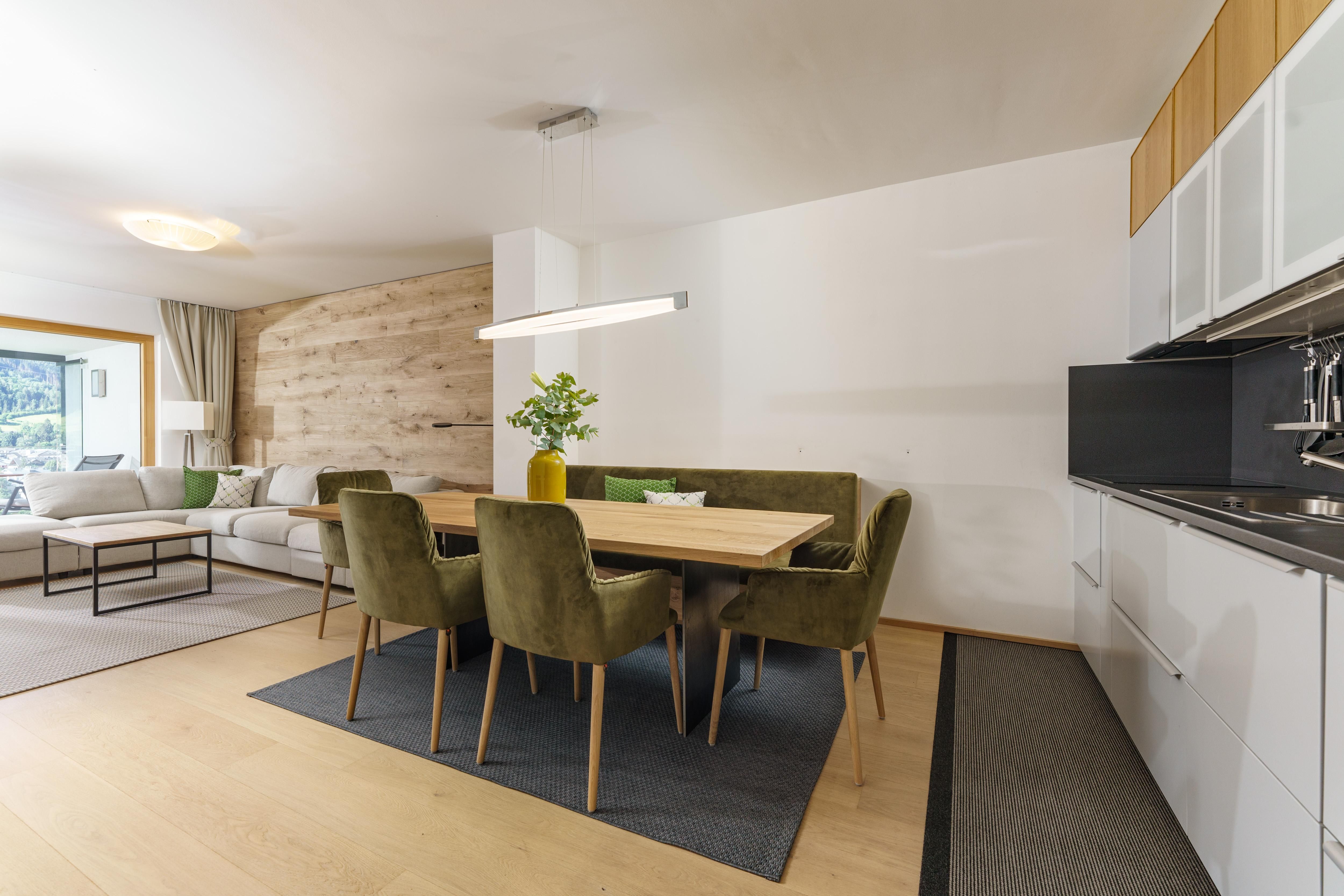 3 miteinander verbunden Häuser 38 servicierte Appartements, von 40m² Studios, Appartements mit einem, zwei oder drei Schlafzimmern bis hin zu 130m² Penthäusern, herrlichen Ausblick und Top Ausstattung inklusive! Die hochwertige Grundausstattung der Appartements mit heimischen Materialen wie Holz, Stein und Glas vermitteln ein modernes Wohlfühlambiente mit viel Licht und Aussicht, - eine Symbiose aus purem Lebensgefühl und Kraftplatz an der Sonne. Komplett ausgestattete Designküchen, großzügige Wohnräume zum Teil mit offenem Kamin, moderne & stylische Möbel, kostenfreies WLAN, Kabel TV in allen Schlaf- und Wohnräumen sowie moderne und lichtdurchflutete Badezimmer, lassen für den Gast, der seine private Freiheit schätzt, keine Wünsche offen .