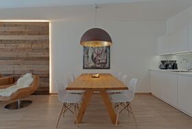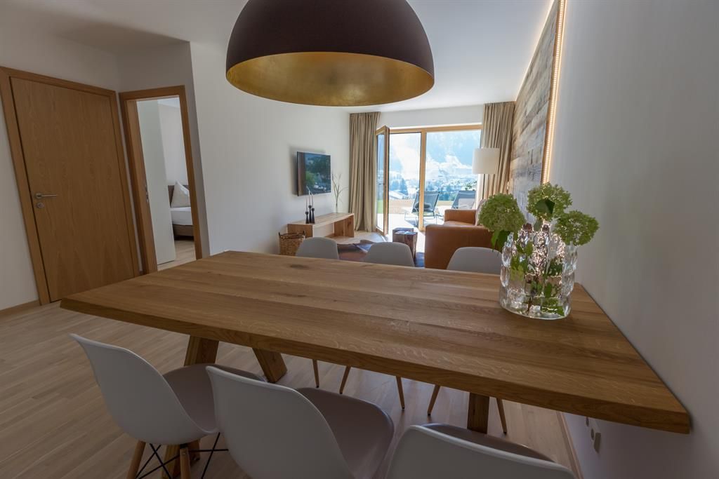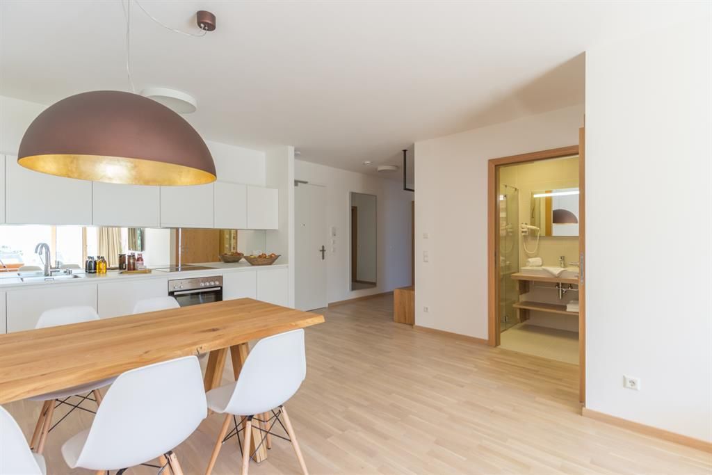 3 miteinander verbunden Häuser 38 servicierte Appartements, von 40m² Studios, Appartements mit einem, zwei oder drei Schlafzimmern bis hin zu 130m² Penthäusern, herrlichen Ausblick und Top Ausstattung inklusive! Die hochwertige Grundausstattung der Appartements mit heimischen Materialen wie Holz, Stein und Glas vermitteln ein modernes Wohlfühlambiente mit viel Licht und Aussicht, - eine Symbiose aus purem Lebensgefühl und Kraftplatz an der Sonne. Komplett ausgestattete Designküchen, großzügige Wohnräume zum Teil mit offenem Kamin, moderne & stylische Möbel, kostenfreies WLAN, Kabel TV in allen Schlaf- und Wohnräumen sowie moderne und lichtdurchflutete Badezimmer, lassen für den Gast, der seine private Freiheit schätzt, keine Wünsche offen .
