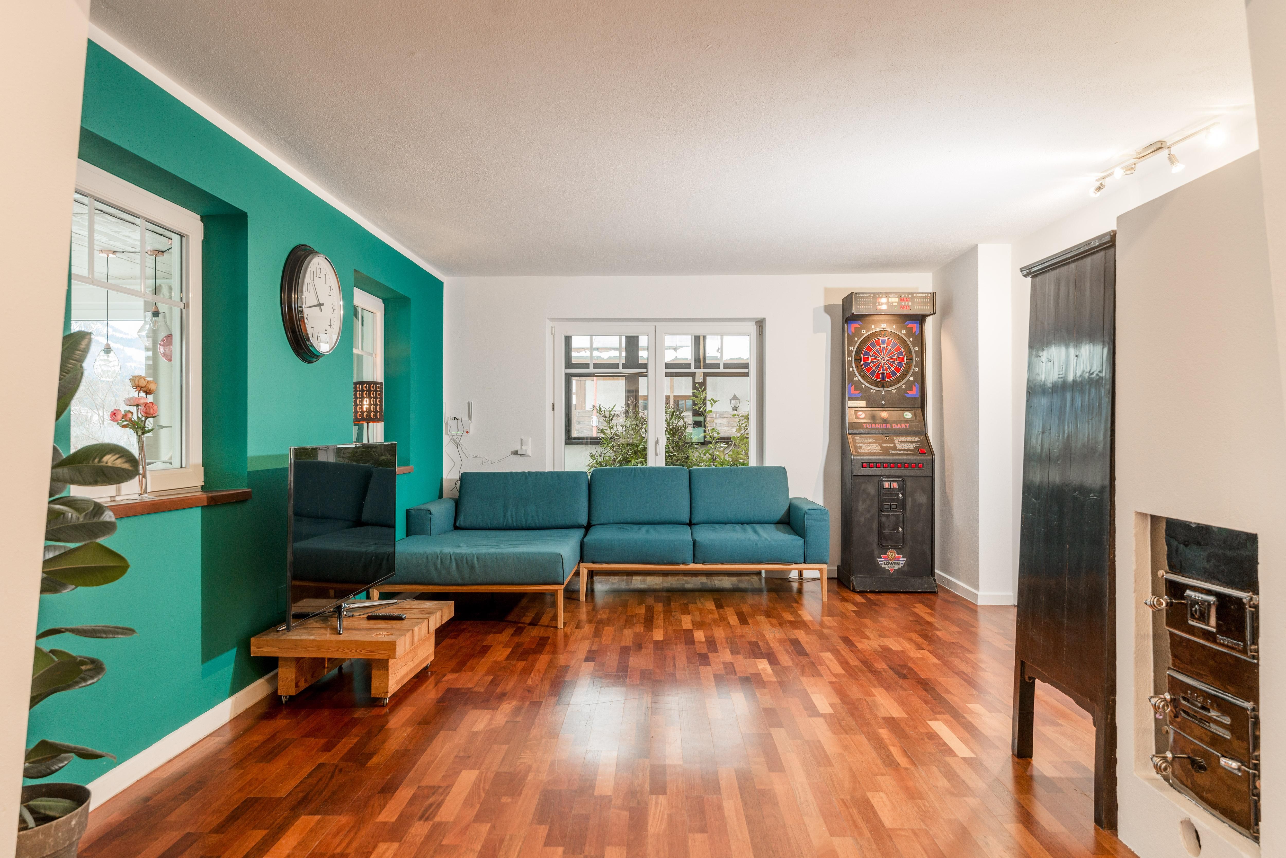 -Komplett ausgestattete Küche -Highlight: Aufschnittmaschine & RacletteWohnraum mit Smart TV, Dartmaschine, Spielecke, und Bücherkasten