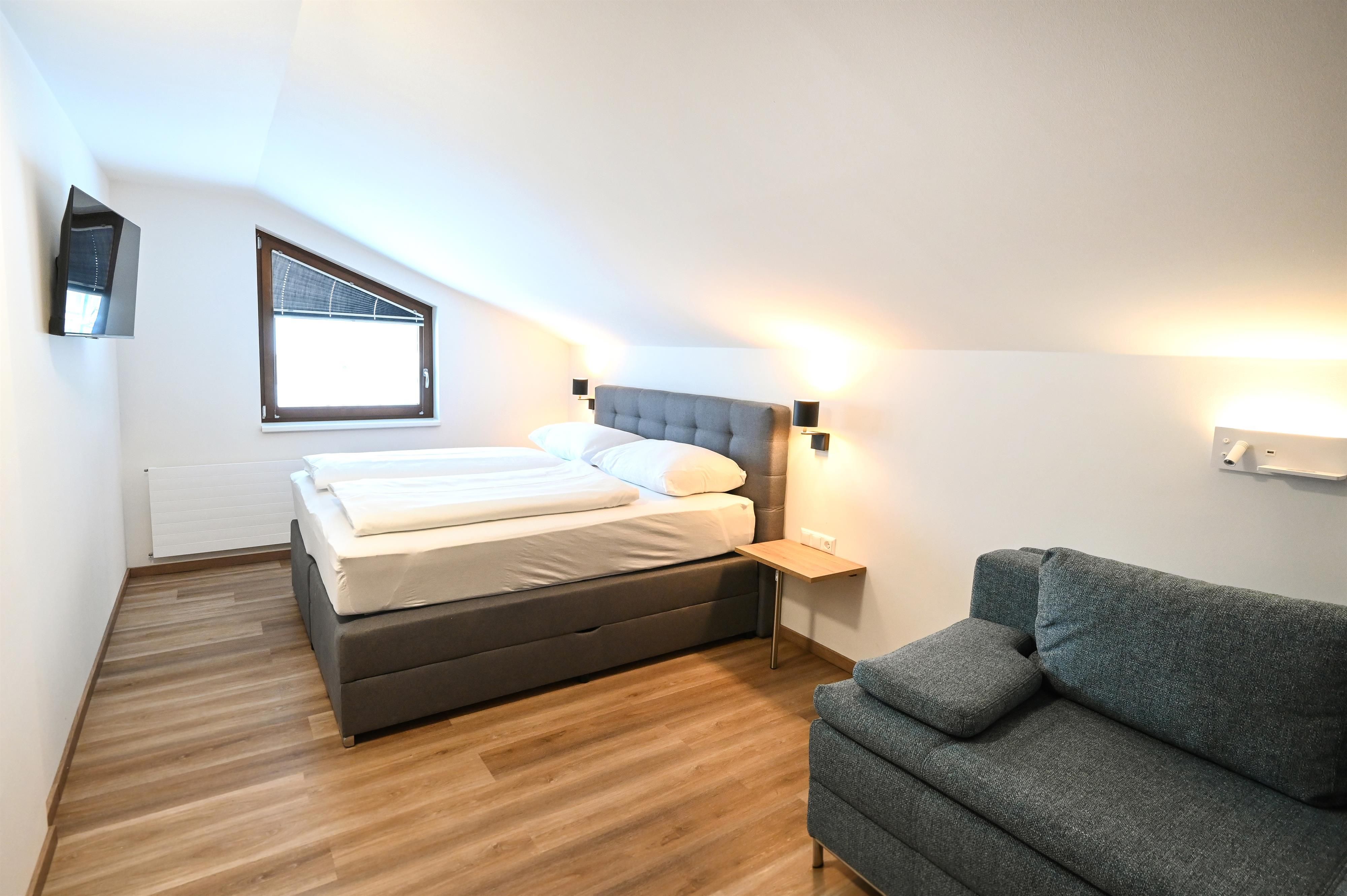Im Schlafzimmer befindet sich ein Doppelbett und ein Doppelschlafsofa. Zusätzlich gibt es im Wohnbereich eines der Appartements ein Einzelschlafsofa.