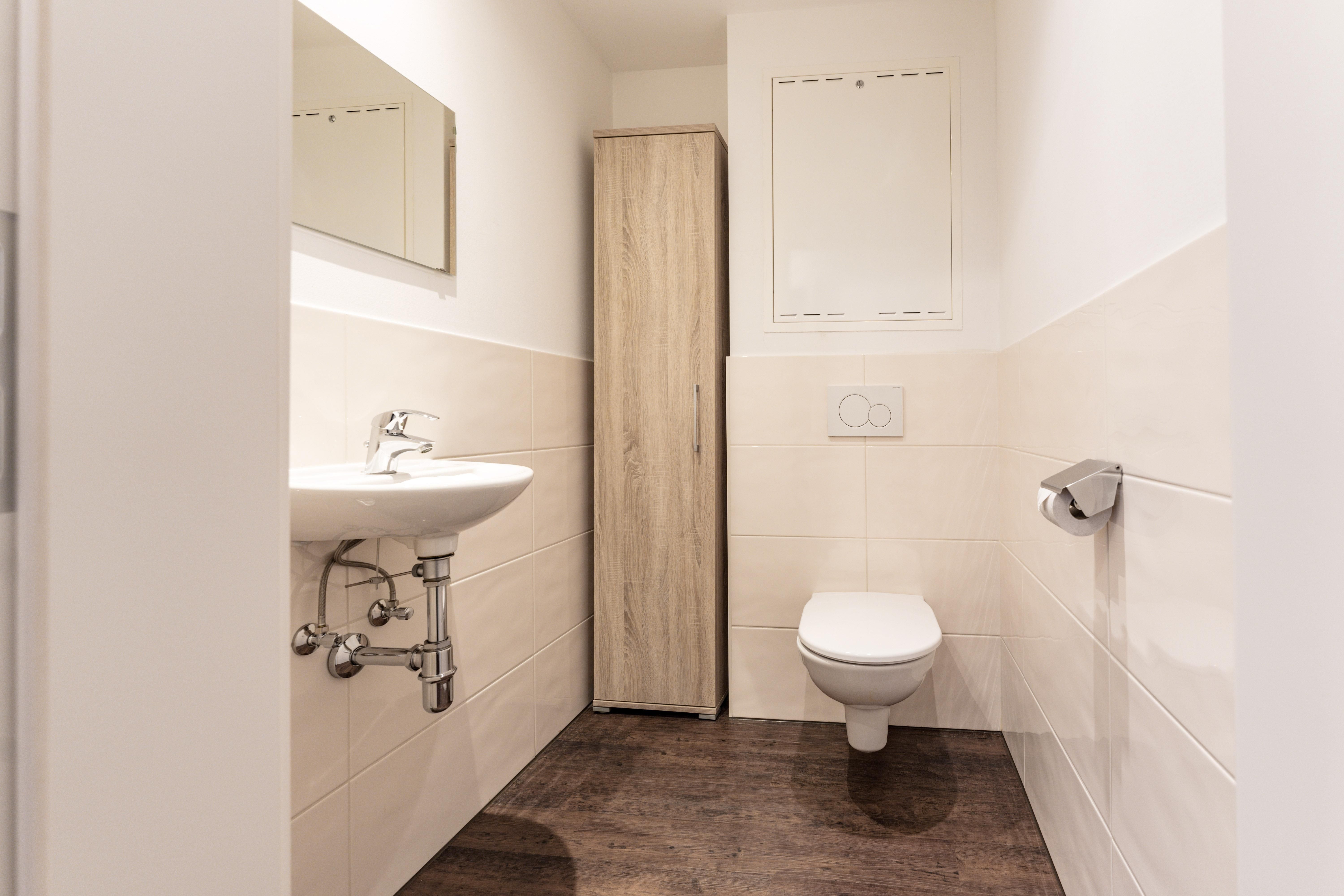 - 1 Bad mit Doppelwaschtisch, Badewanne und Dusche, WC