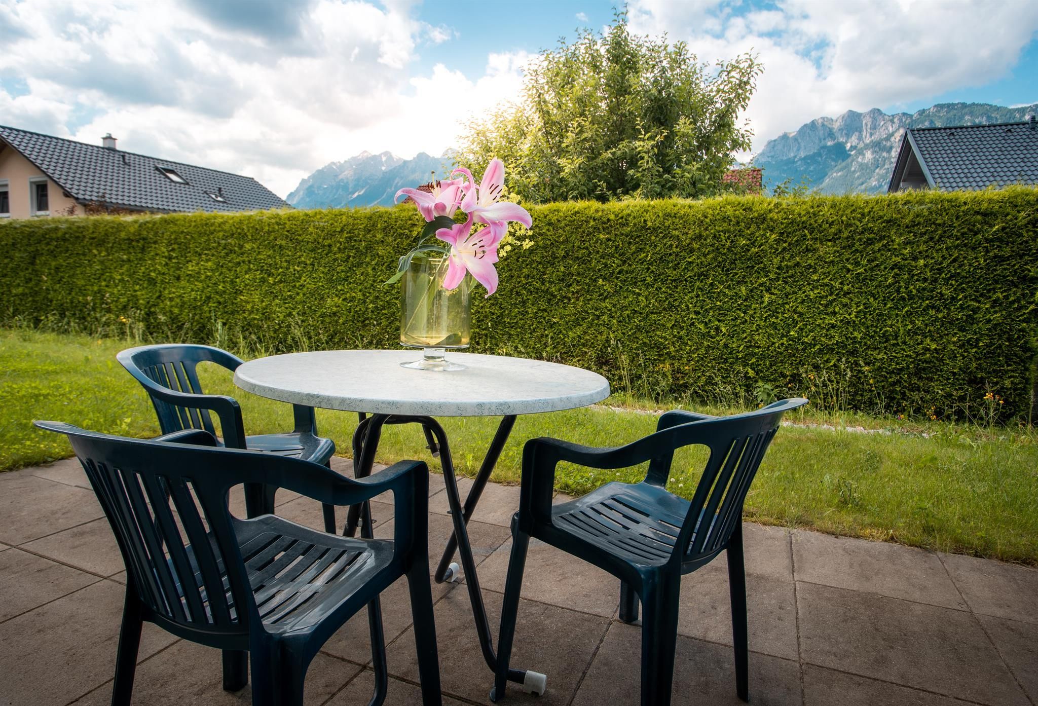 - West-Nord-Ost Terrasse mit Gartenmöbeln und tollem Bergblick