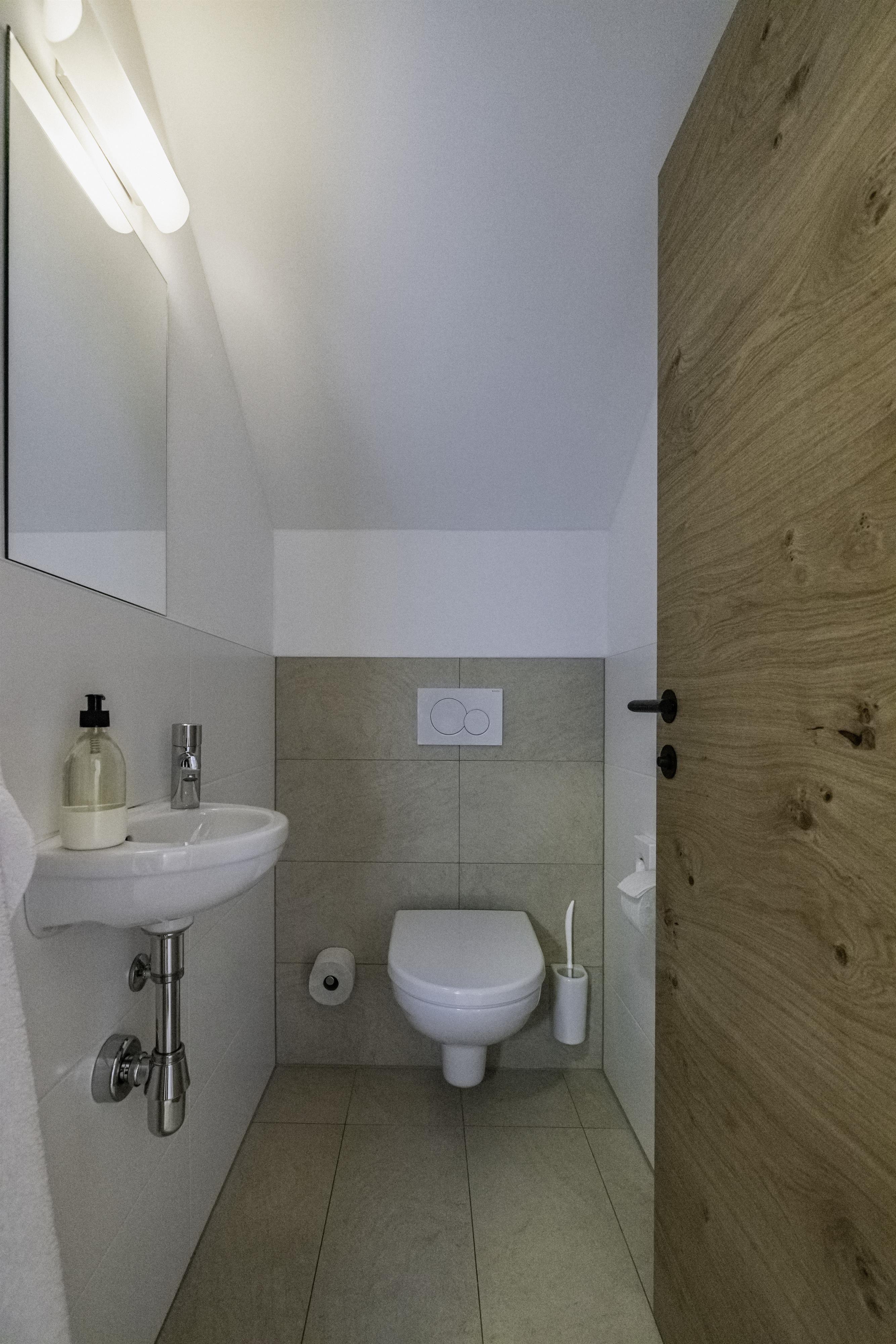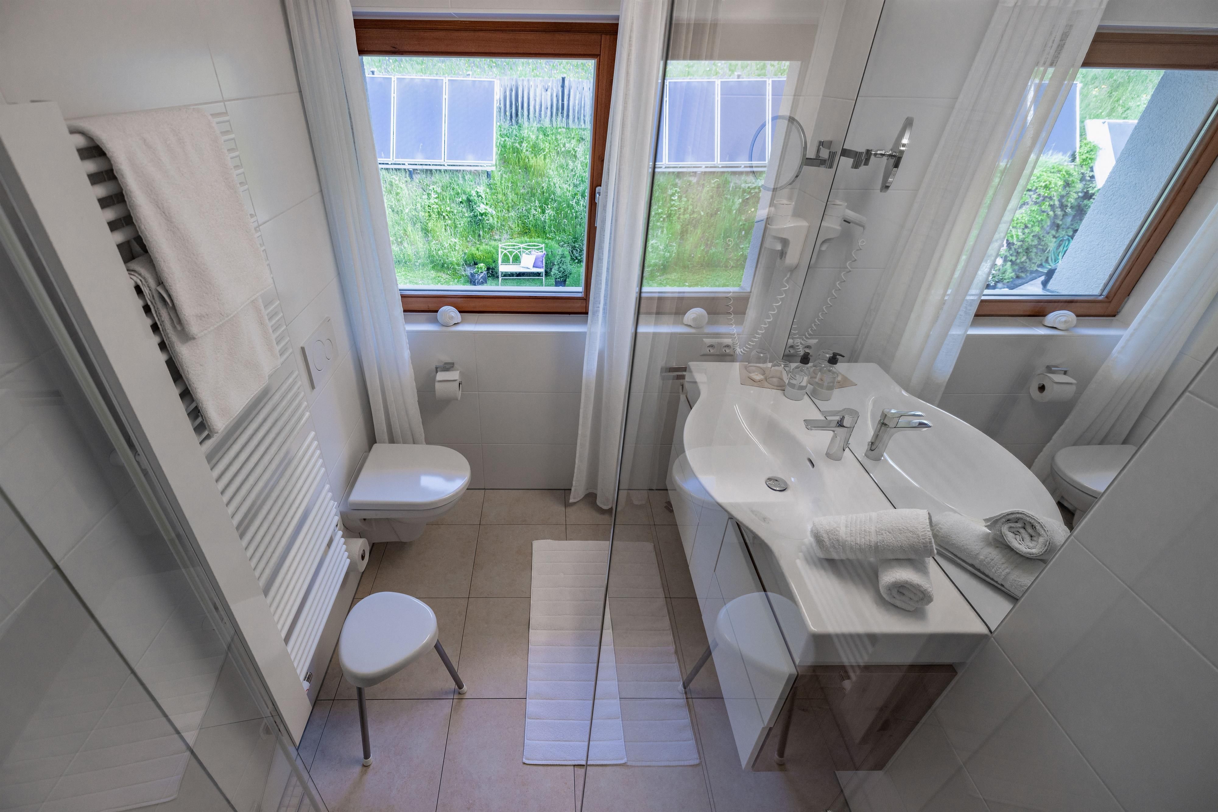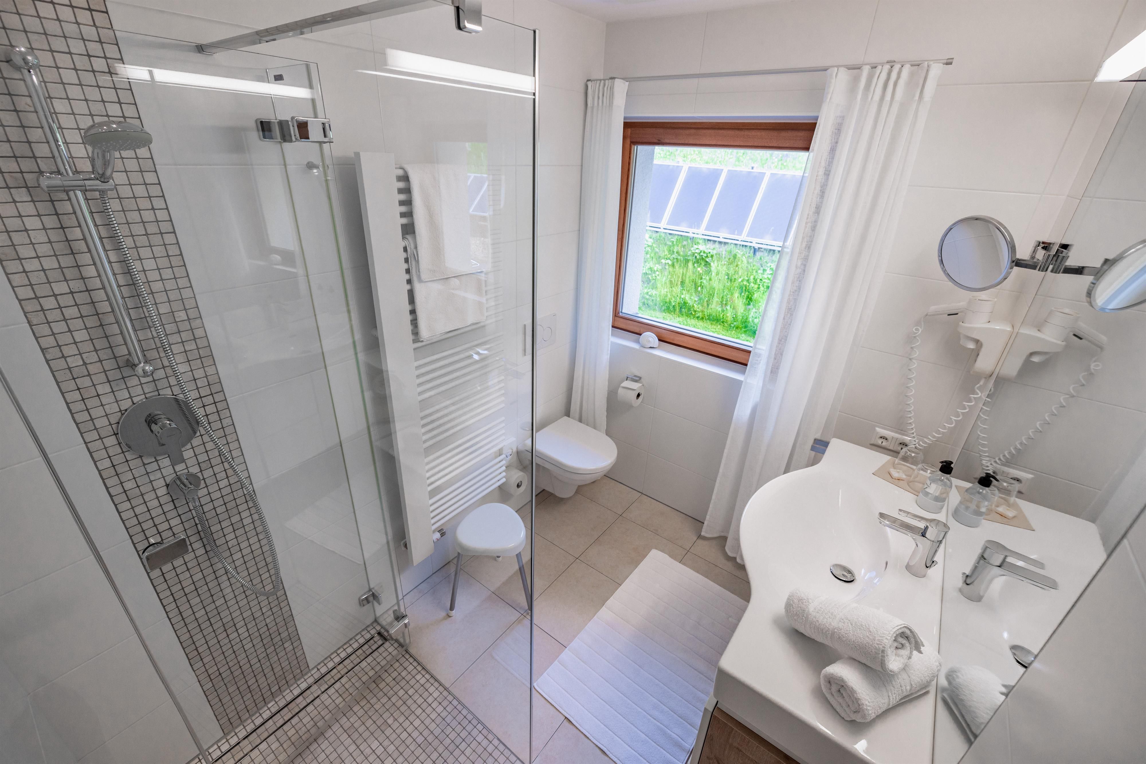 • ein nordseitig gelegenes Badezimmer mit Dusche, WC, Waschbecken und großem Fenster mit Blick zum Wald.
