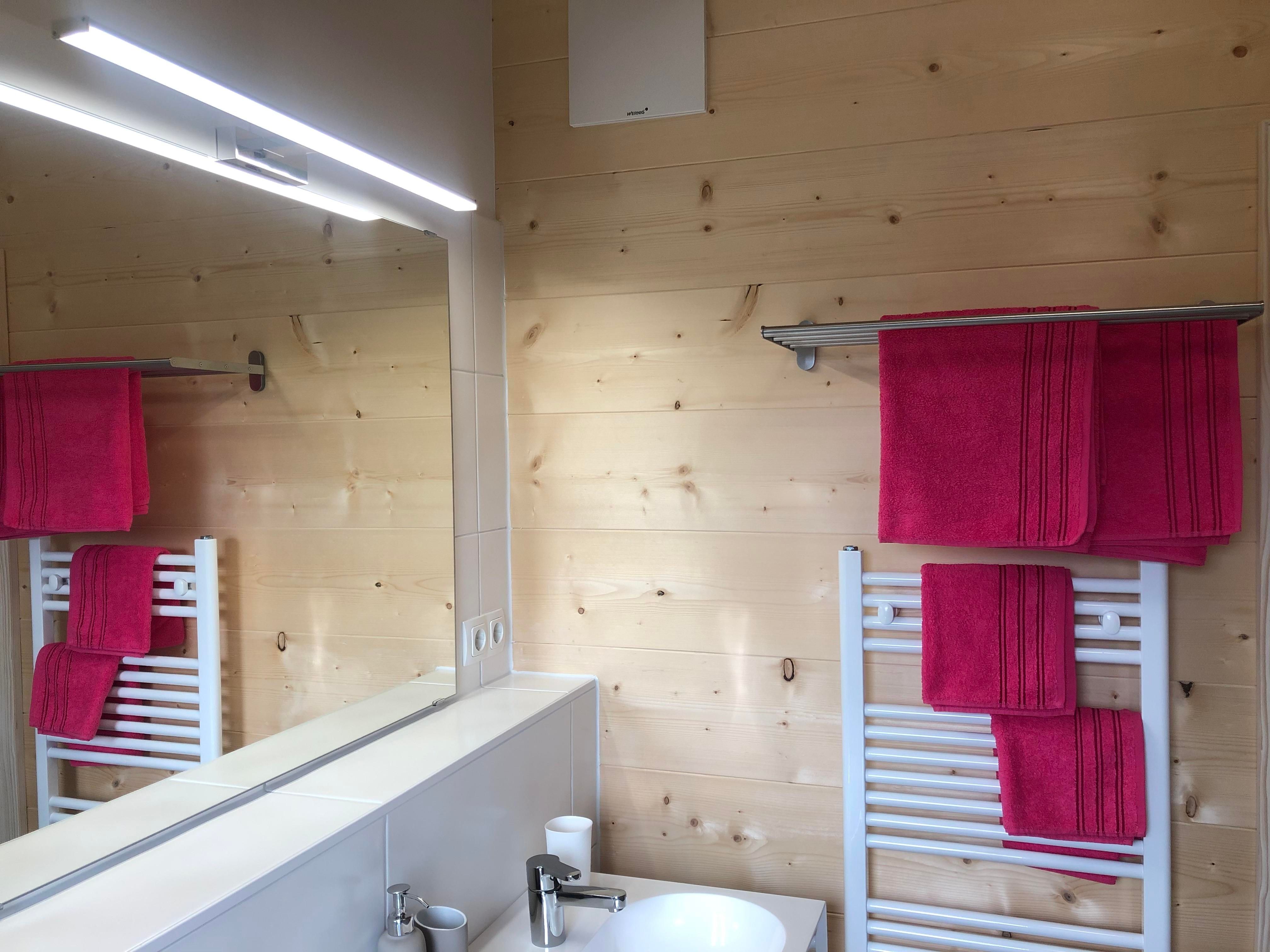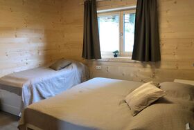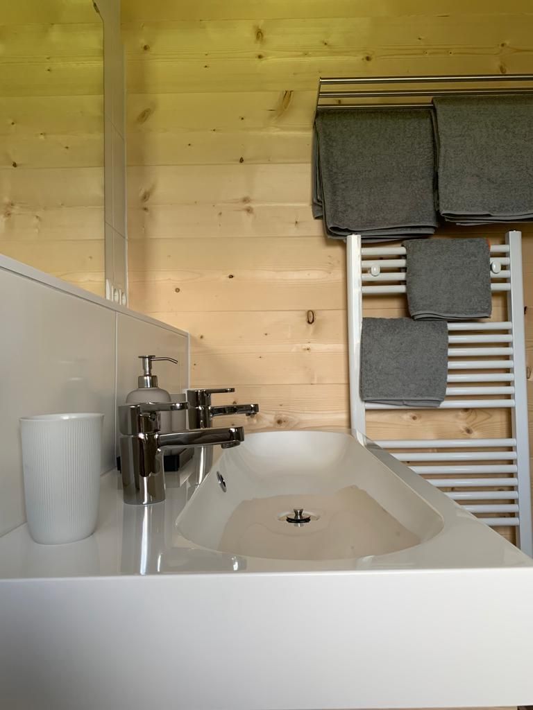 Unser Blockhaus verfügt über zwei Doppelzimmer mit je einem eigenen Badezimmer inkl. Doppelwaschbecken und einer begehbaren Dusche. Für mehr Platz befindet sich in den Zimmern außerdem je ein Zusatzbett.