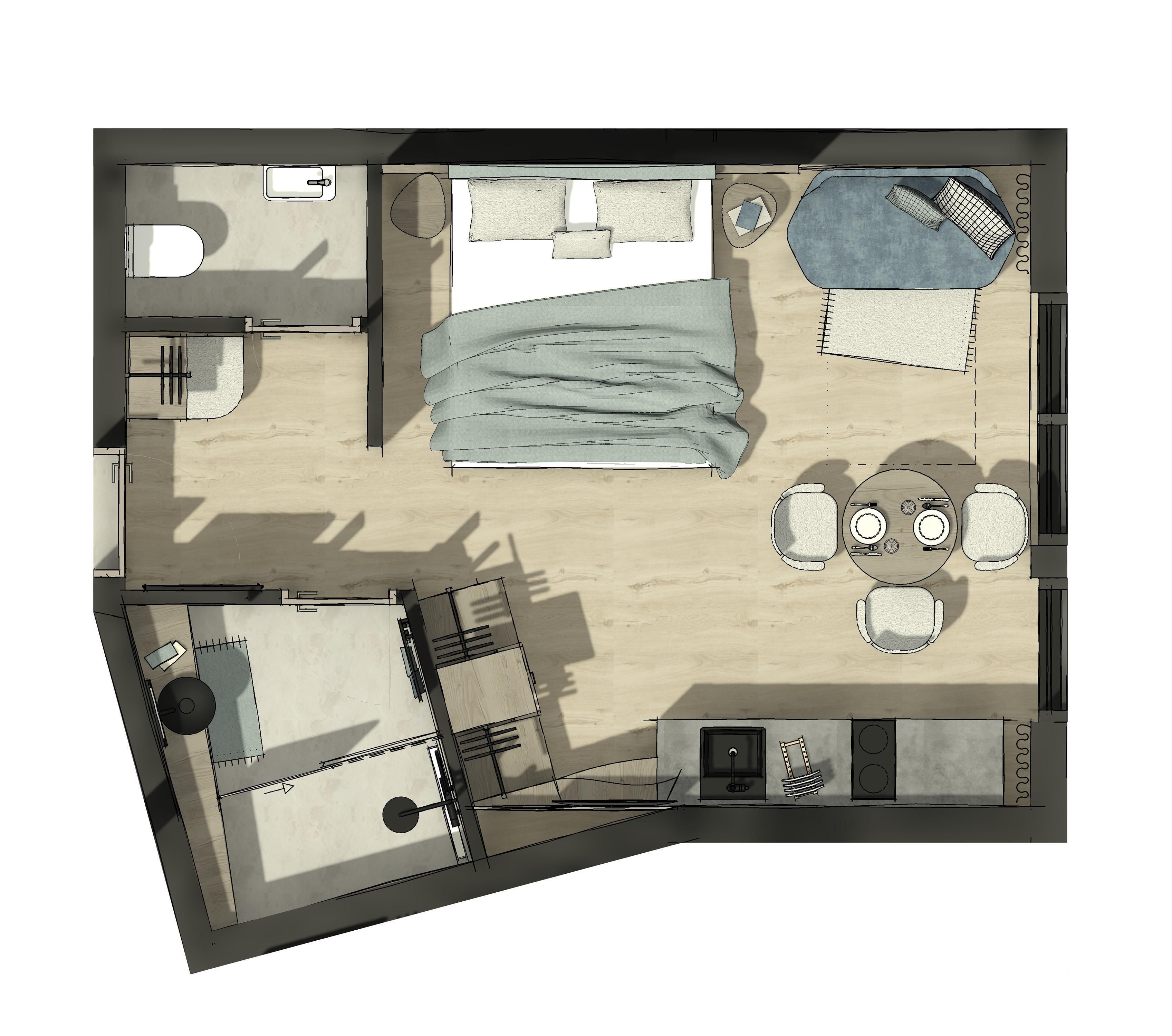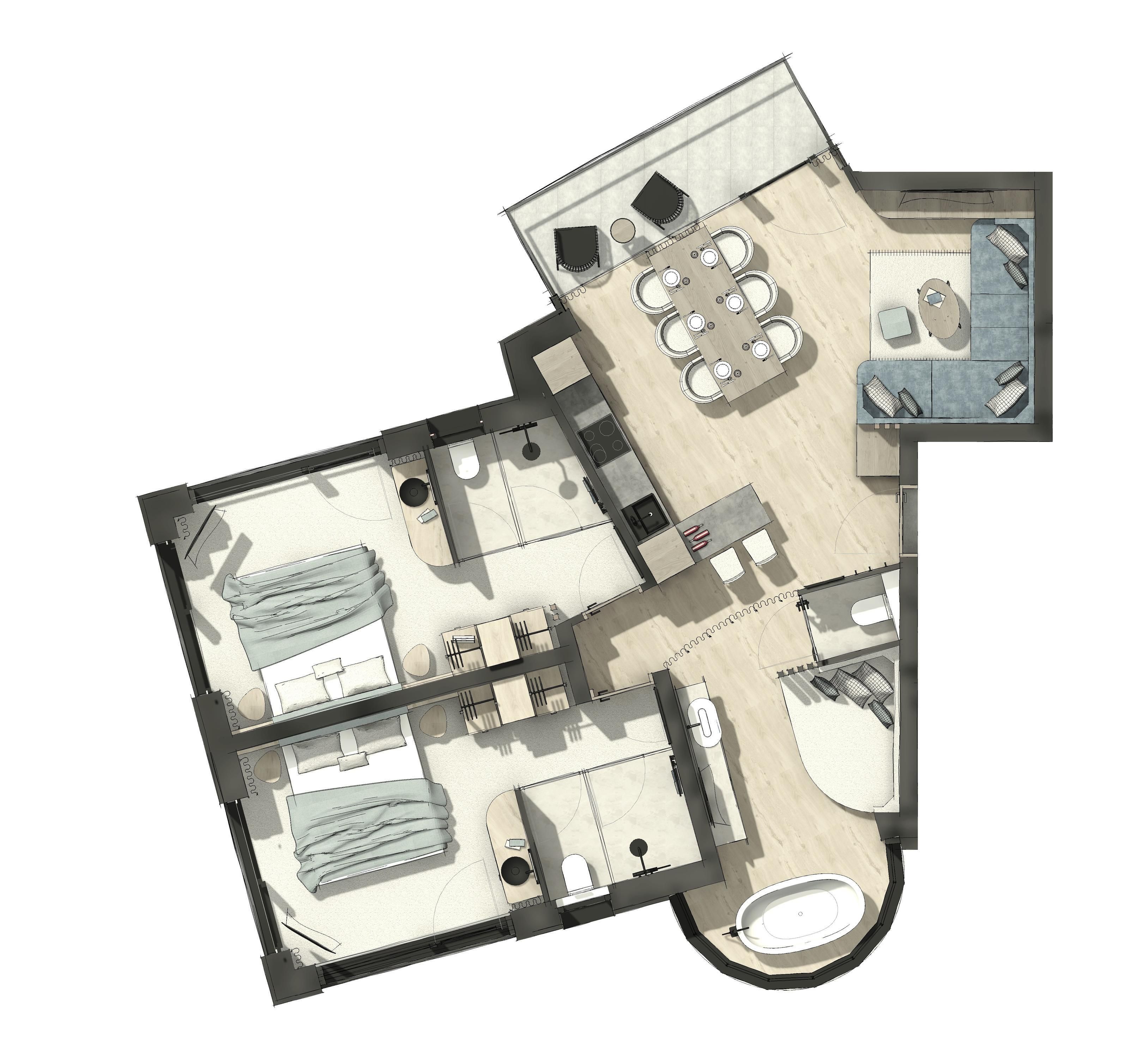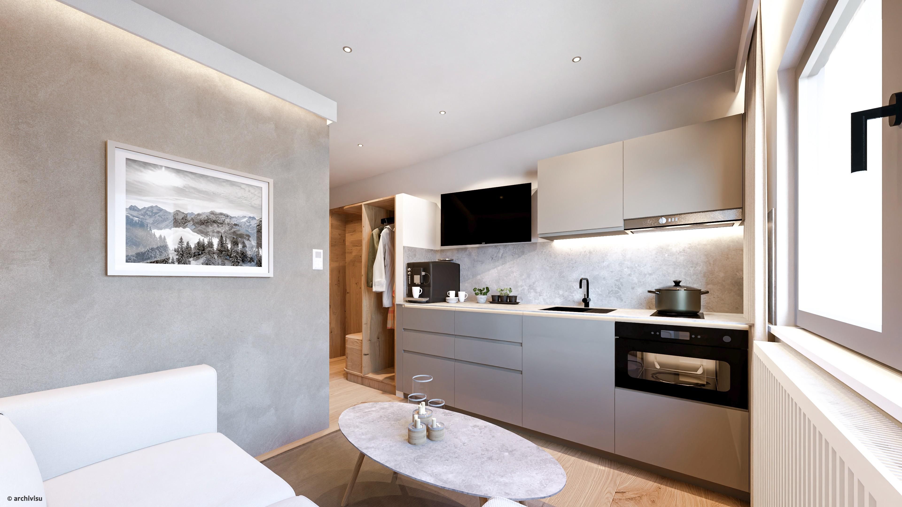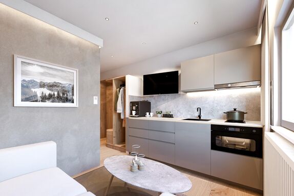 Vivo sportivo mit ca. 25 m² und Balkon steht für maximale Nähe zum Berg. Das Apartment mit einem separaten Doppelzimmer ist das Basecamp für Alle. Weiters bietet es ein separates WC, ein separates Badezimmer mit Dusche und eine voll ausgestattete Wohnküche mit einer großen Couch (Schlafsofa für eine 3. Person), Geschirrspüler, Kühlschrank, 2-Platten-Induktionskochfeld, Mikrowelle mit Heißluftfunktion, Essbereich, Weinkühlschrank uvm.