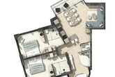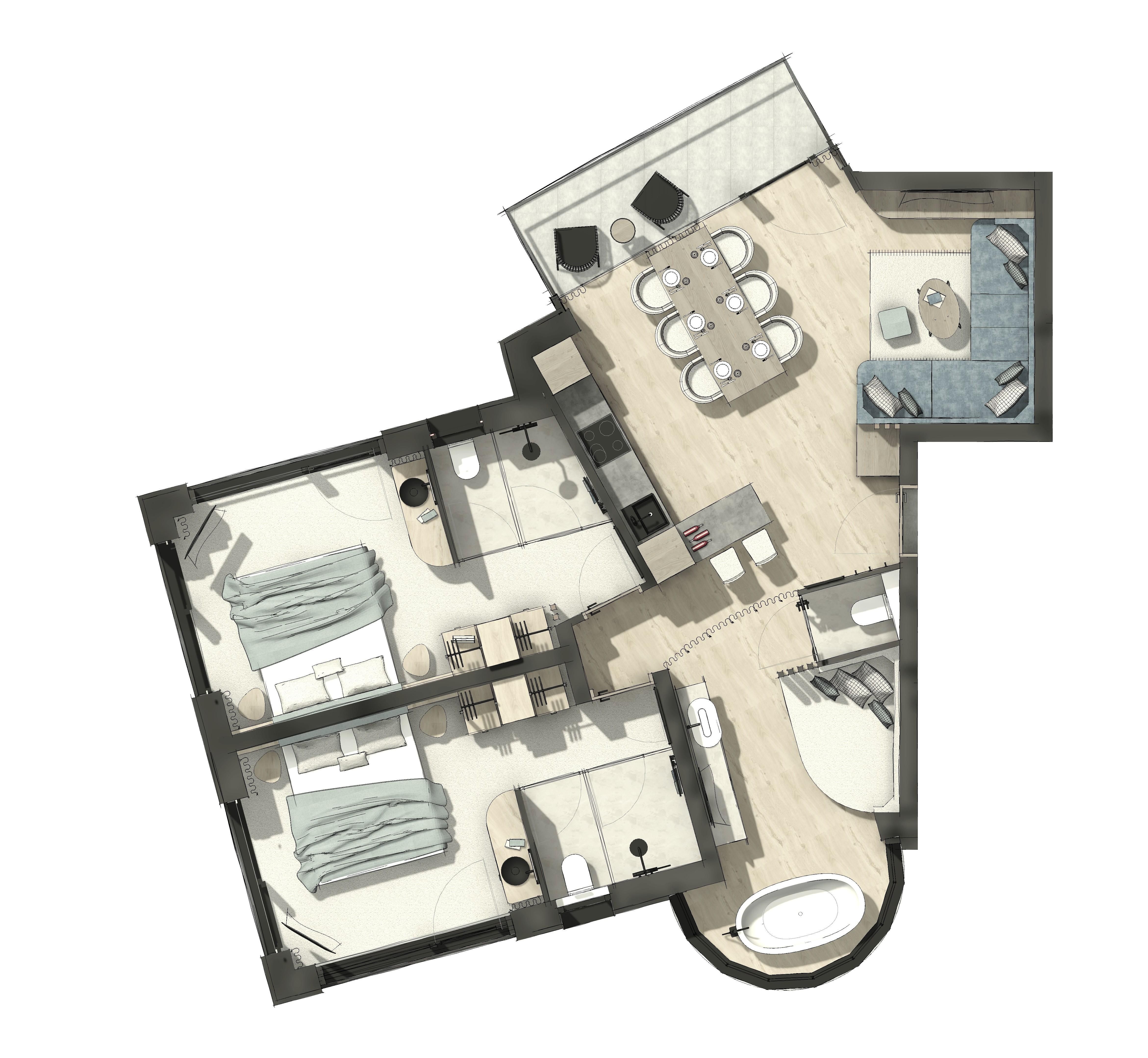Vivo rilasso mit ca. 80 m², großem Süd-Balkon und einem Ruheraum mit Panorama-Badewanne bietet entspanntes Wohnen für die ganze Familie oder Freunde. Das Apartment besteht aus: 2 Doppelzimmer mit je einem Badezimmer mit Dusche und einem separatem WC; einer voll ausgestatteten Wohnküche mit Essbereich für Alle, Geschirrspüler, Kühlschrank, 4-Platten-Induktionskochfeld, Backofen, Wohnlandschaft (Schlafsofa für eine 5. Person), Weinkühlschrank uvm. und einem weiteren separaten WC.
